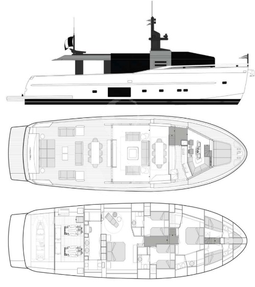 The yacht accommodates up to 10 guests in 4 spacious cabins, and its vertical bow design allows for more efficient space usage, giving the impression of increased height and volume. The main deck is wrapped in reflective glass, while large panoramic windows offer seamless connection with the sea and surroundings.