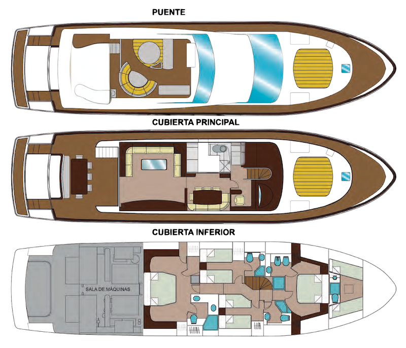 With capacity for 12 guests during the day and 8 overnight, MAZU features 4 ensuite staterooms (2 doubles and 2 twins) where comfort and exclusivity blend seamlessly. The Master Suite boasts breathtaking ocean views, a spacious bathroom, and premium amenities, while the additional cabins maintain the same level of luxury and privacy.
