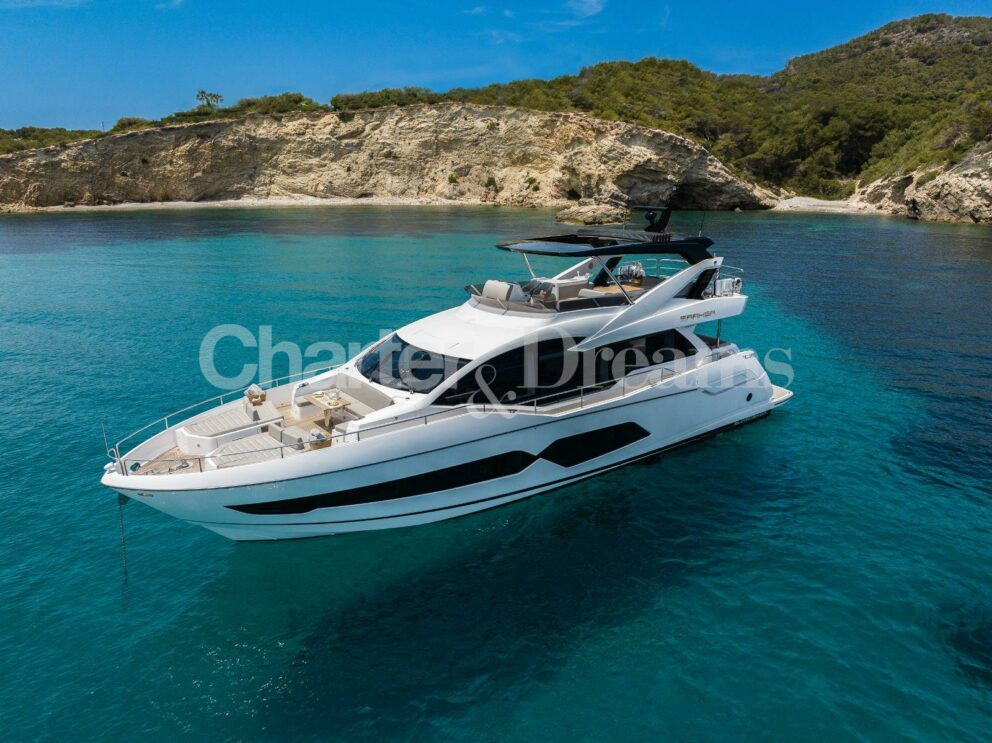 Step aboard SAAHSA, a 24-meter luxury superyacht built in 2021 by the renowned British shipyard Sunseeker. This flybridge yacht has become a favourite in Ibizan waters thanks to its modern design, sporty lines, and generous outdoor spaces ideal for socialising, relaxing, and soaking in the most spectacular views of the Mediterranean.