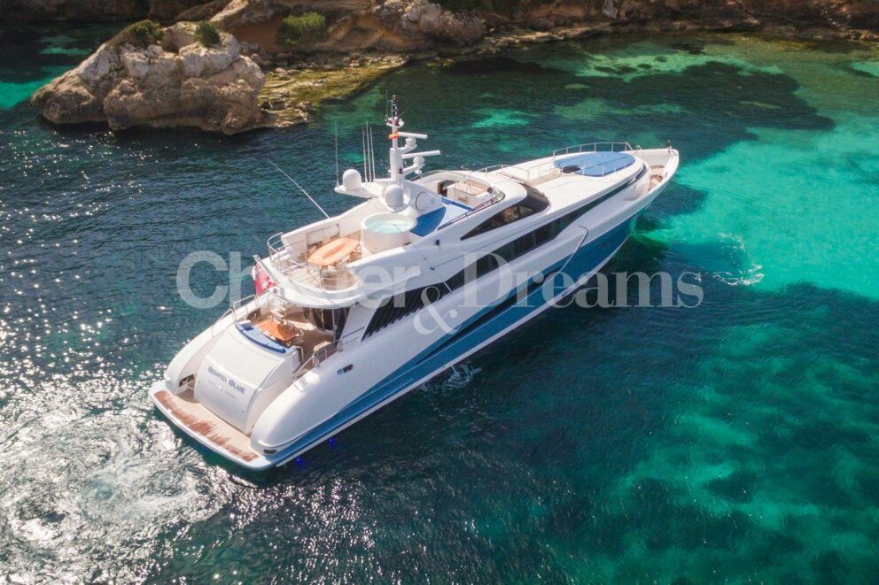 Perfectamente diseñada para el charter de lujo en Ibiza, BENITA BLUE dispone de amplias cubiertas para el relax, un gran jacuzzi exterior y zonas ideales para socializar y disfrutar del sol. Con capacidad para hasta 10 huéspedes distribuidos en 4 cabinas con baño en suite —incluyendo una magnífica suite principal—, es ideal tanto para familias como para grupos de amigos.