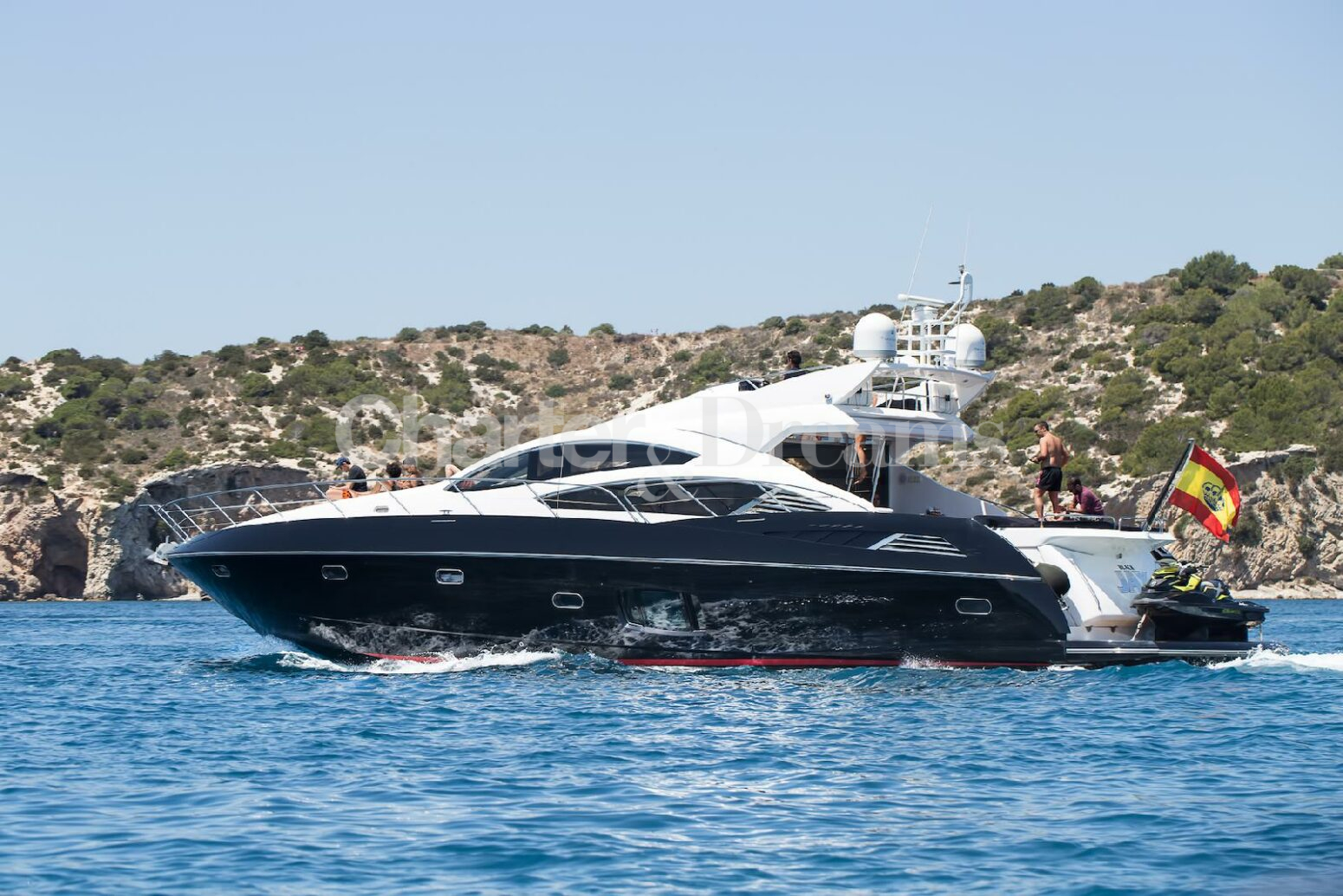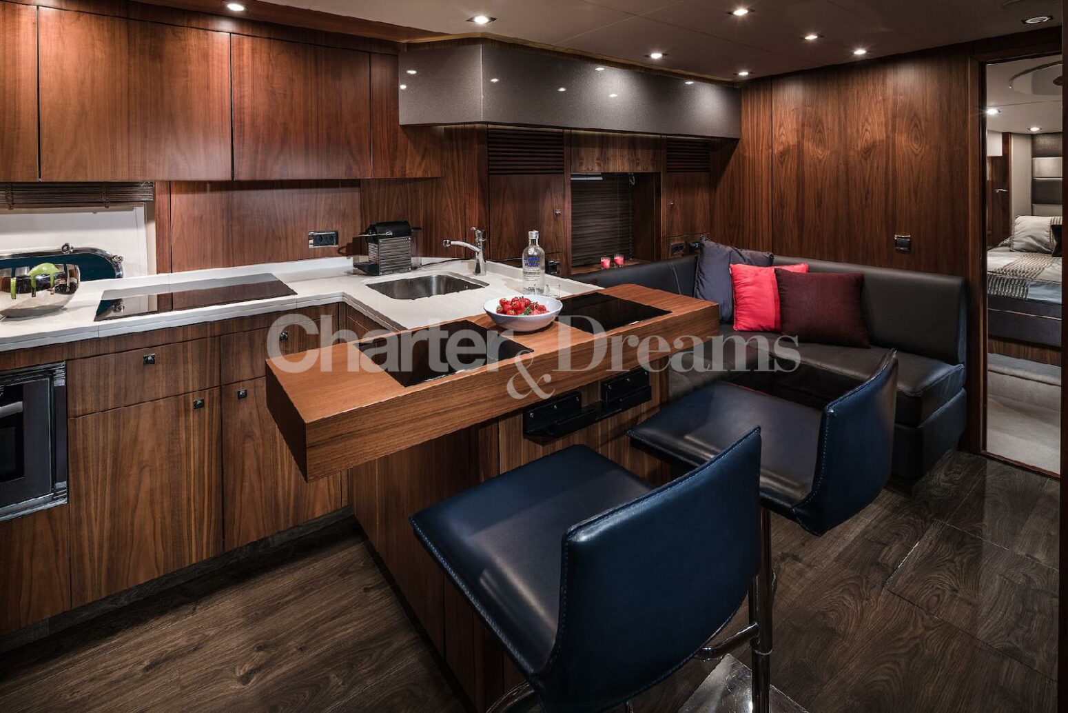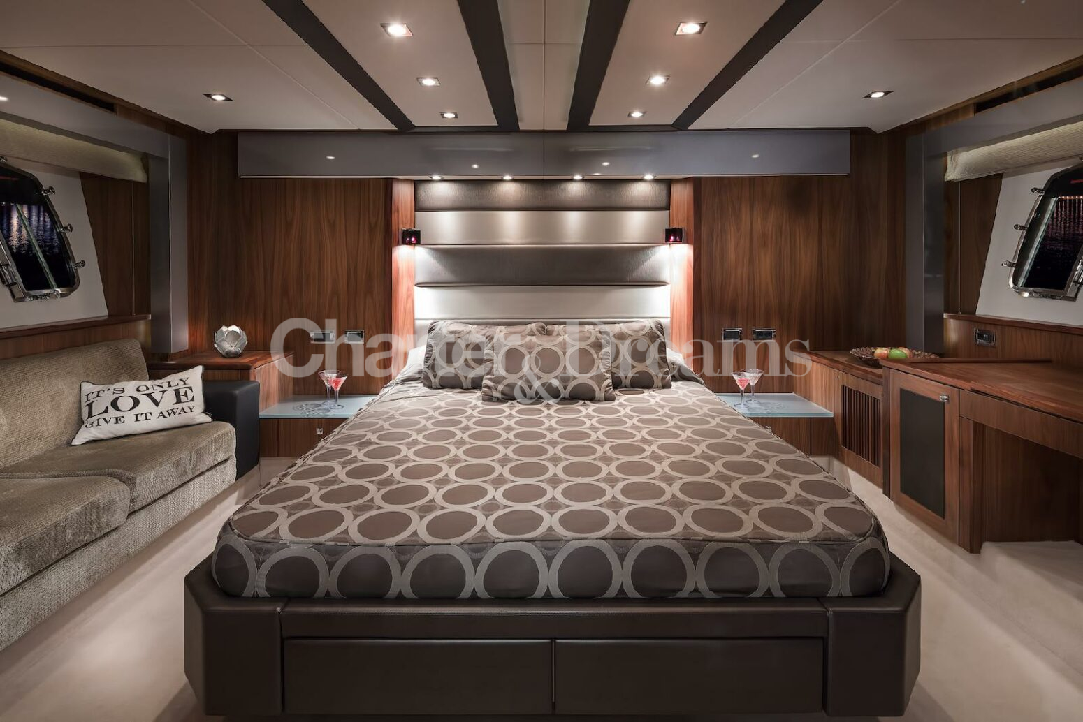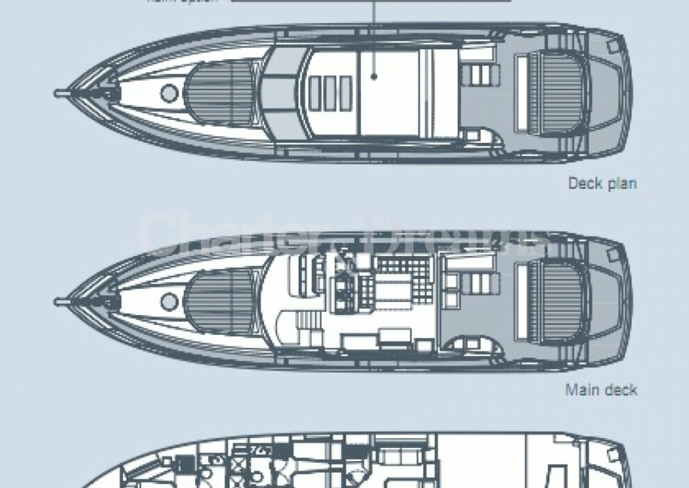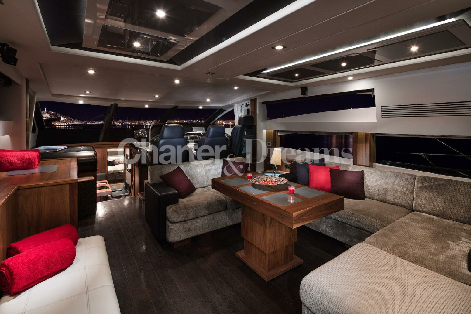 La distribucion interior de BLACK JAX puede alojar cómodamente hasta 6 huéspedes durante la noche en 3 lujosos camarotes, que incluyen una suite principal, un camarote doble y un camarote twin, todos ubicados en la cubierta inferior. En el interior, el generoso salón demuestra ser el lugar perfecto para el entretenimiento, con una suntuosa área de asientos, amplio espacio de almacenamiento y una completa consola de barra lateral a babor; todo bajo un extraordinario techo corredizo de vidrio panorámico. Este Sunseeker ofrece todo el lujo que uno espera de un superyate. Las amplias cubiertas exteriores invitan a relajarse por la noche en el mar. Las ventanas delgadas, de gran tamaño y sin marco, que llegan hasta las cubiertas laterales, inundan el lujoso salón con luz natural y crean una atmósfera armónica con impresionantes vistas panorámicas. La espaciosa cubierta de proa ofrece una gran tumbona y una amplia zona de asientos alrededor de una elegante mesa. La cabina de popa semicubierta, a la que se puede acceder desde el salón a través de una mampara de vidrio retráctil, ofrece mucho espacio con un comedor y una gran tumbona. Se accede a la gran plataforma de baño y al garaje auxiliar a través de dos escaleras.