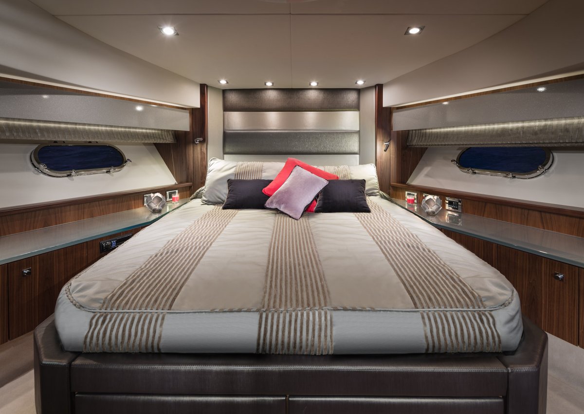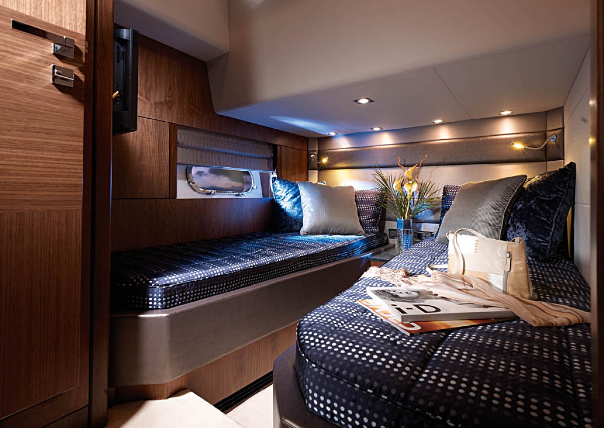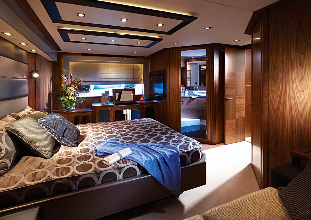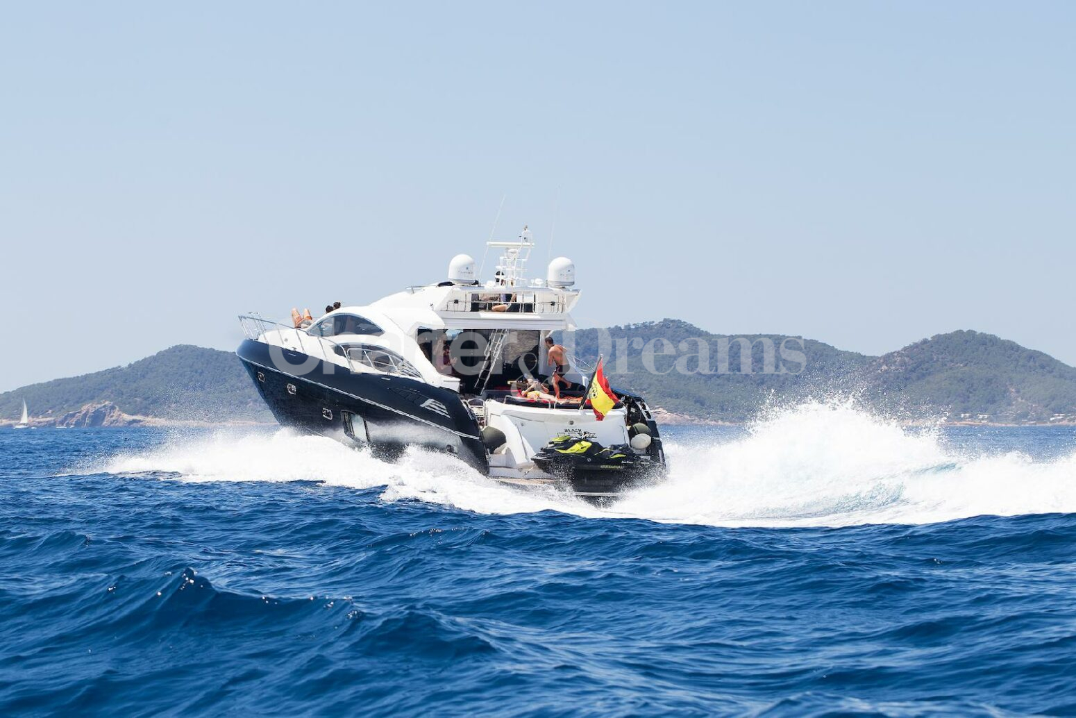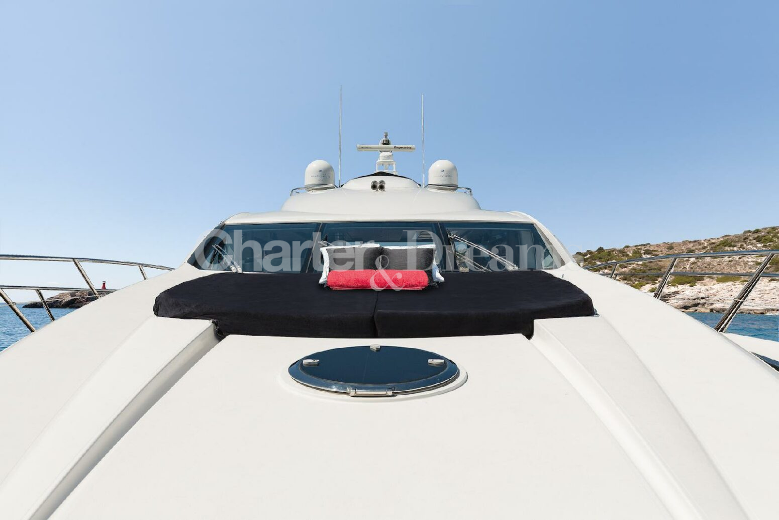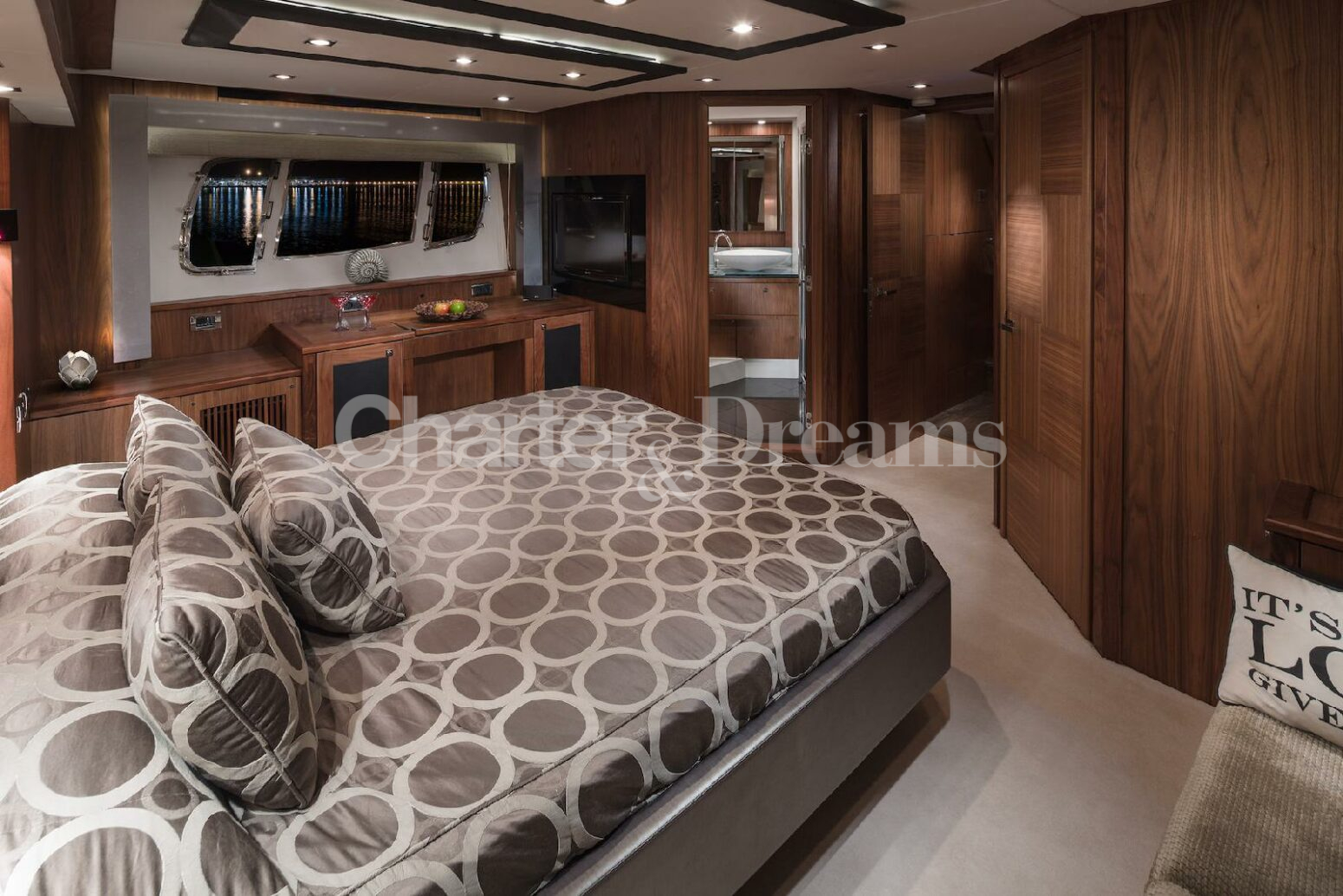 La distribucion interior de BLACK JAX puede alojar cómodamente hasta 6 huéspedes durante la noche en 3 lujosos camarotes, que incluyen una suite principal, un camarote doble y un camarote twin, todos ubicados en la cubierta inferior. En el interior, el generoso salón demuestra ser el lugar perfecto para el entretenimiento, con una suntuosa área de asientos, amplio espacio de almacenamiento y una completa consola de barra lateral a babor; todo bajo un extraordinario techo corredizo de vidrio panorámico. Este Sunseeker ofrece todo el lujo que uno espera de un superyate. Las amplias cubiertas exteriores invitan a relajarse por la noche en el mar. Las ventanas delgadas, de gran tamaño y sin marco, que llegan hasta las cubiertas laterales, inundan el lujoso salón con luz natural y crean una atmósfera armónica con impresionantes vistas panorámicas. La espaciosa cubierta de proa ofrece una gran tumbona y una amplia zona de asientos alrededor de una elegante mesa. La cabina de popa semicubierta, a la que se puede acceder desde el salón a través de una mampara de vidrio retráctil, ofrece mucho espacio con un comedor y una gran tumbona. Se accede a la gran plataforma de baño y al garaje auxiliar a través de dos escaleras.