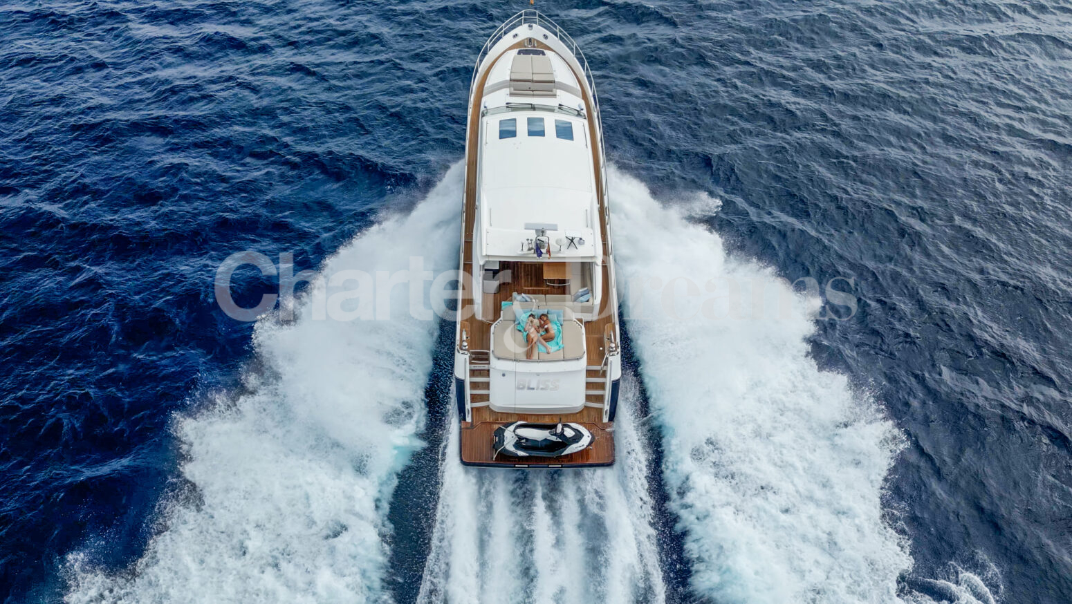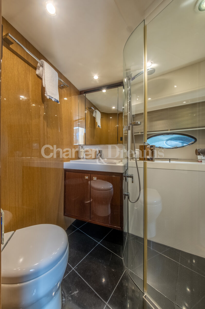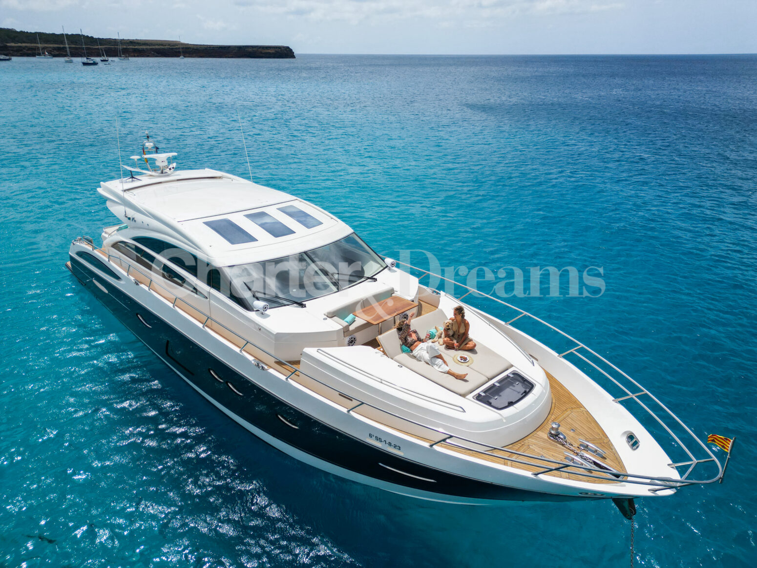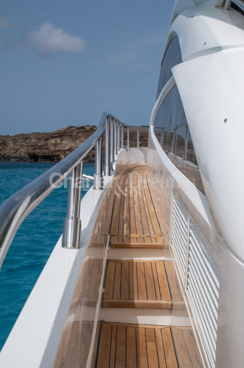 BLISS es una Princess V72 que combina ingeniería británica y estilo contemporáneo—líneas deportivas por fuera y un interior sereno y elegante. Con 24 m × 6 m, navega con soltura (22 nudos de crucero, 38 de máxima) impulsada por dos Caterpillar de 1.800 CV. De día recibe hasta 12 invitados (más tripulación); por la noche duermen 6 en tres cabinas: Master a toda manga en la zona central, VIP luminosa a proa y twin con camas convertibles a doble; tres baños agilizan la vida a bordo. El salón principal se abre por completo al cockpit mediante puertas de vidrio correderas, integrando interior y exterior. En cubierta, proa ofrece solárium con sofá en U y mesa; a popa, un amplio comedor junto a un gran sunpad. El confort se completa con estabilizadores, internet Starlink, aire acondicionado integral, audio con conexión para DJ y toldos retráctiles en proa y popa.