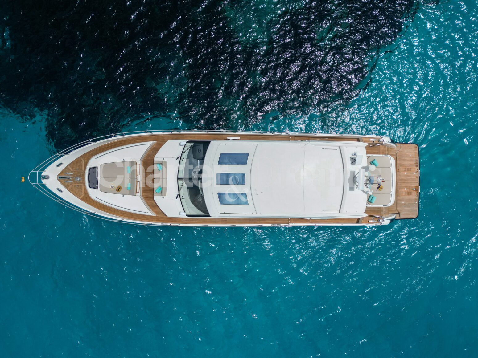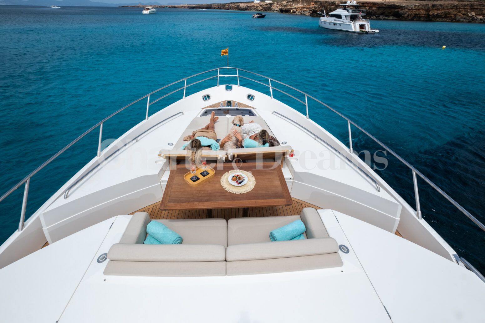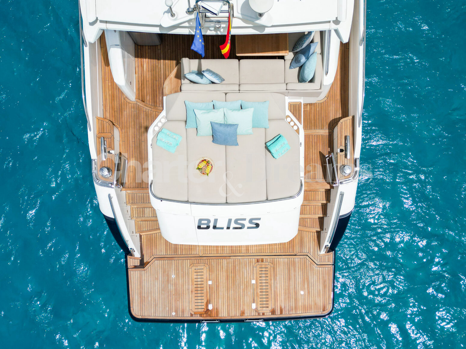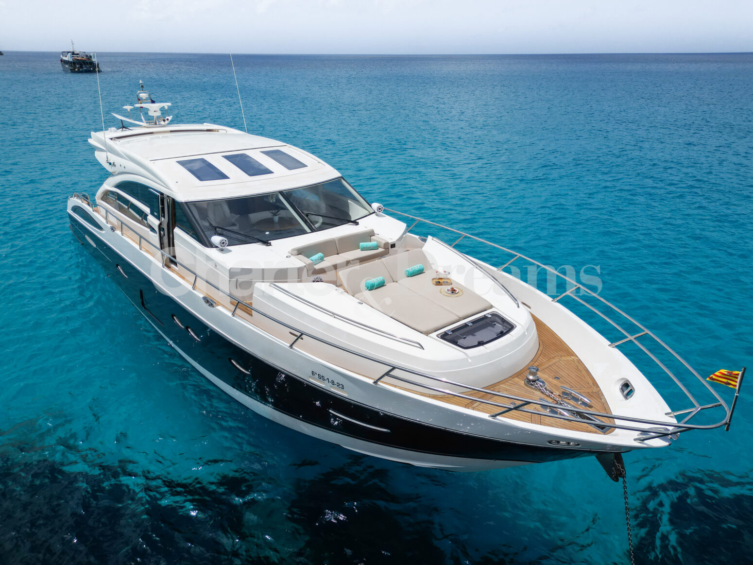 BLISS es una Princess V72 que combina ingeniería británica y estilo contemporáneo—líneas deportivas por fuera y un interior sereno y elegante. Con 24 m × 6 m, navega con soltura (22 nudos de crucero, 38 de máxima) impulsada por dos Caterpillar de 1.800 CV. De día recibe hasta 12 invitados (más tripulación); por la noche duermen 6 en tres cabinas: Master a toda manga en la zona central, VIP luminosa a proa y twin con camas convertibles a doble; tres baños agilizan la vida a bordo. El salón principal se abre por completo al cockpit mediante puertas de vidrio correderas, integrando interior y exterior. En cubierta, proa ofrece solárium con sofá en U y mesa; a popa, un amplio comedor junto a un gran sunpad. El confort se completa con estabilizadores, internet Starlink, aire acondicionado integral, audio con conexión para DJ y toldos retráctiles en proa y popa.