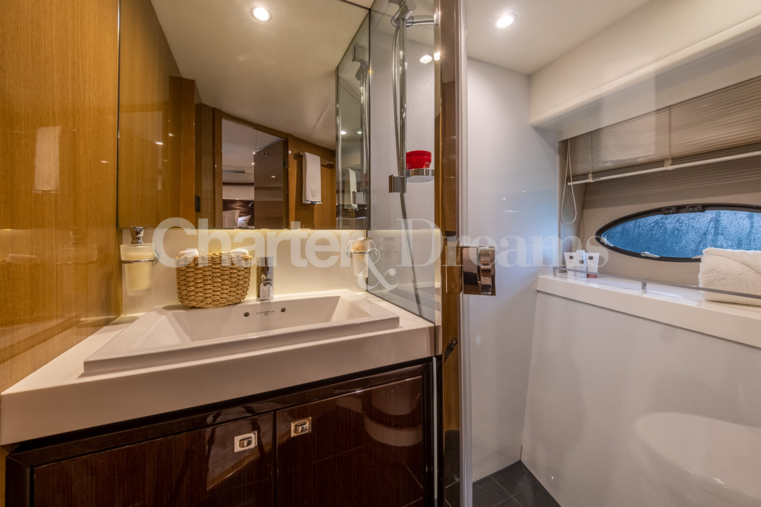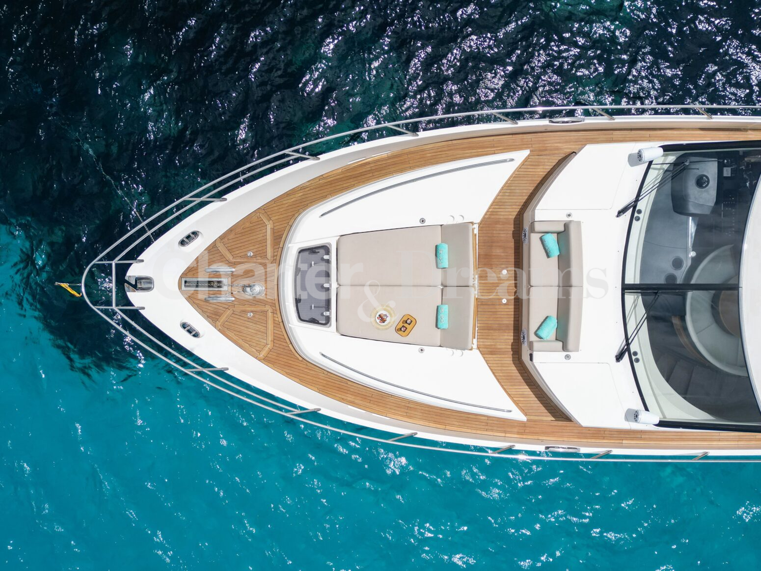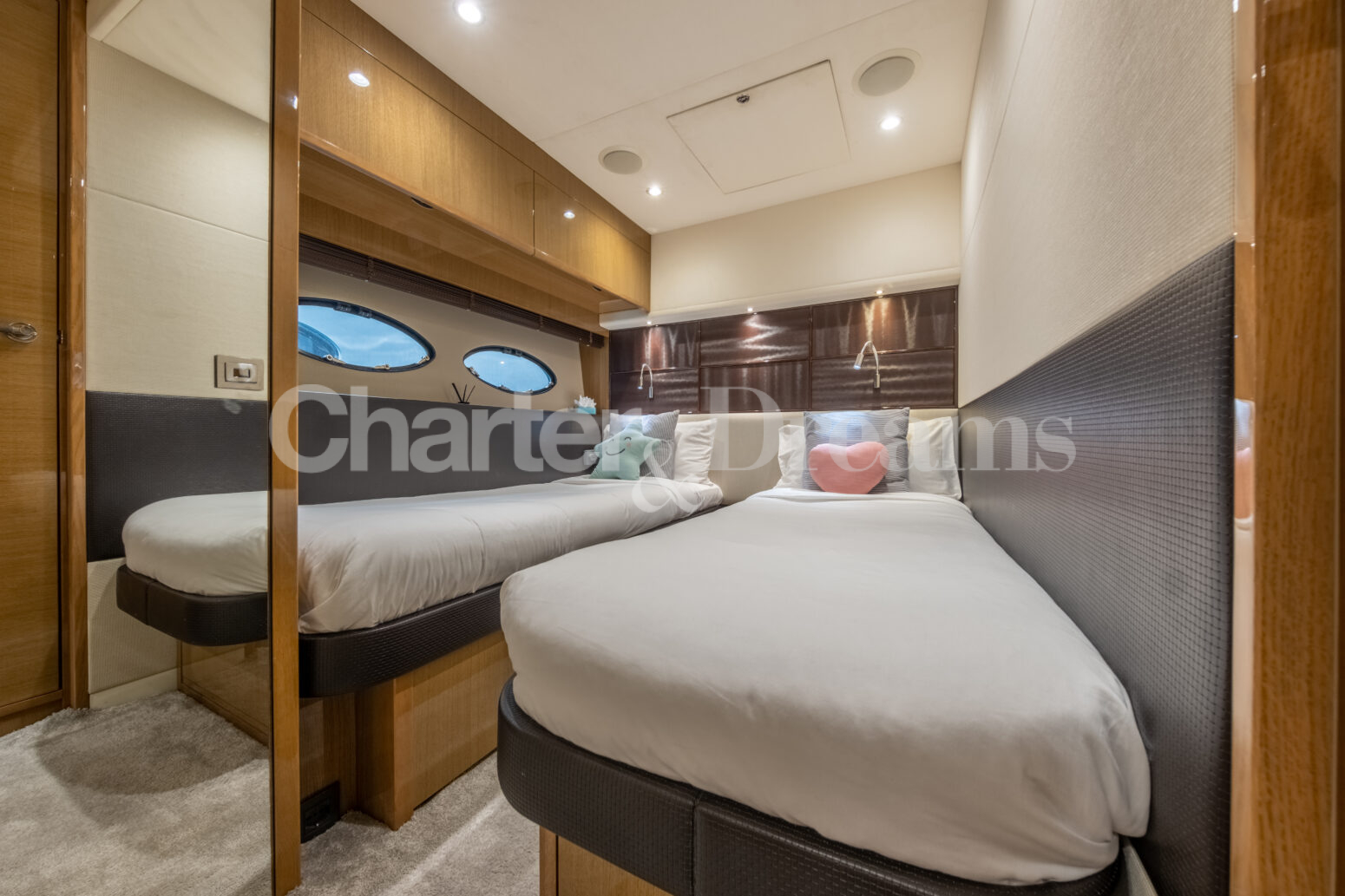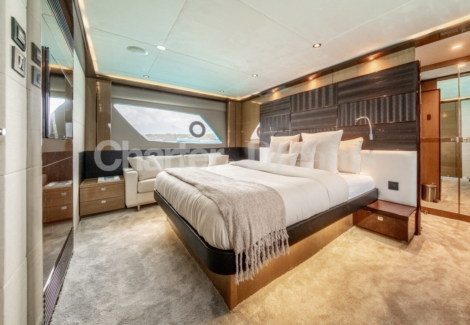 BLISS es una Princess V72 que combina ingeniería británica y estilo contemporáneo—líneas deportivas por fuera y un interior sereno y elegante. Con 24 m × 6 m, navega con soltura (22 nudos de crucero, 38 de máxima) impulsada por dos Caterpillar de 1.800 CV. De día recibe hasta 12 invitados (más tripulación); por la noche duermen 6 en tres cabinas: Master a toda manga en la zona central, VIP luminosa a proa y twin con camas convertibles a doble; tres baños agilizan la vida a bordo. El salón principal se abre por completo al cockpit mediante puertas de vidrio correderas, integrando interior y exterior. En cubierta, proa ofrece solárium con sofá en U y mesa; a popa, un amplio comedor junto a un gran sunpad. El confort se completa con estabilizadores, internet Starlink, aire acondicionado integral, audio con conexión para DJ y toldos retráctiles en proa y popa.