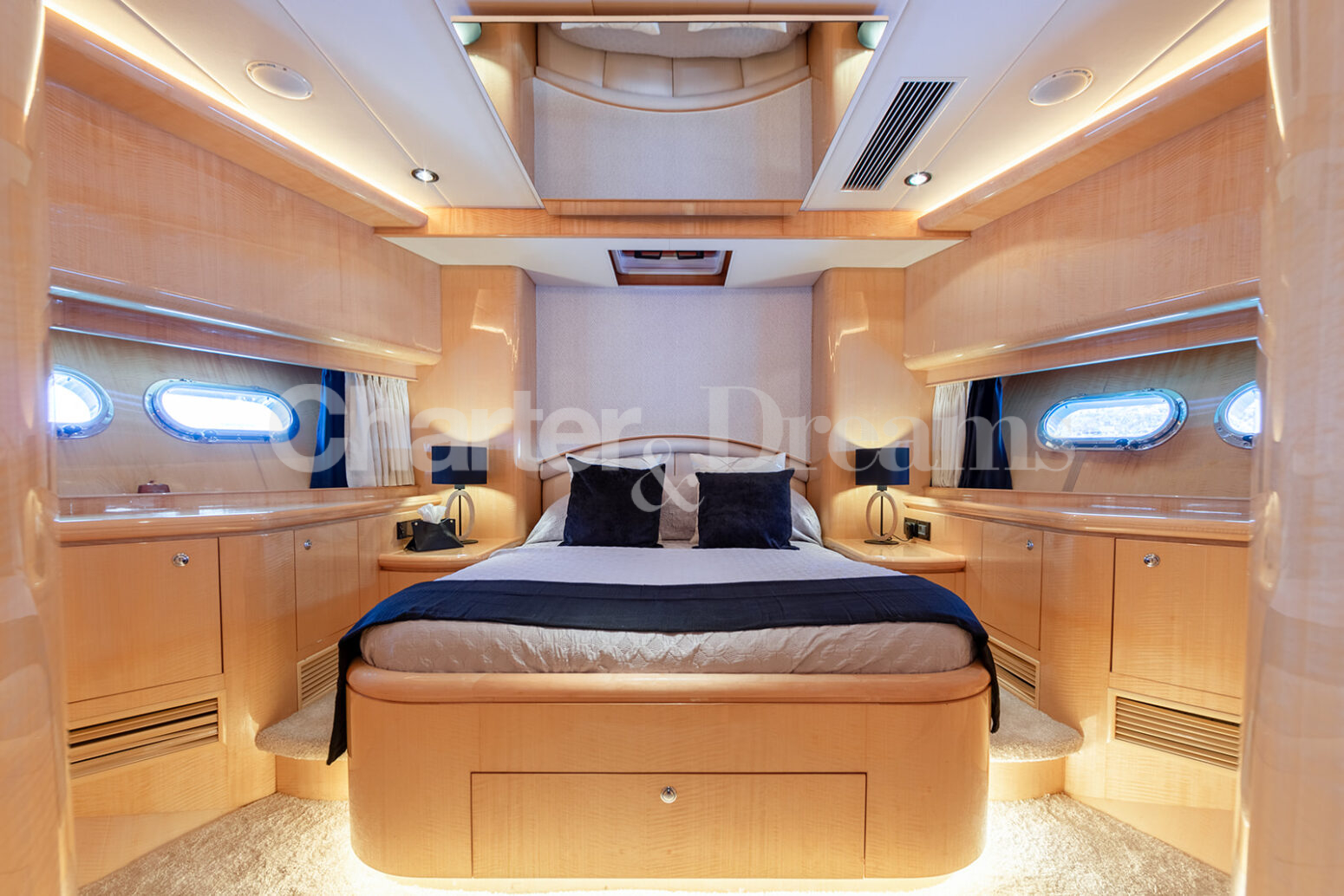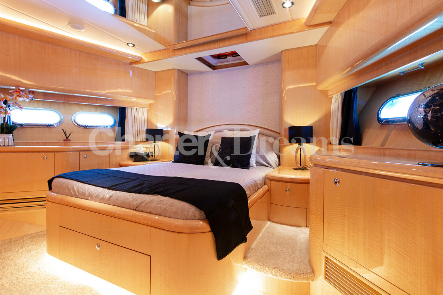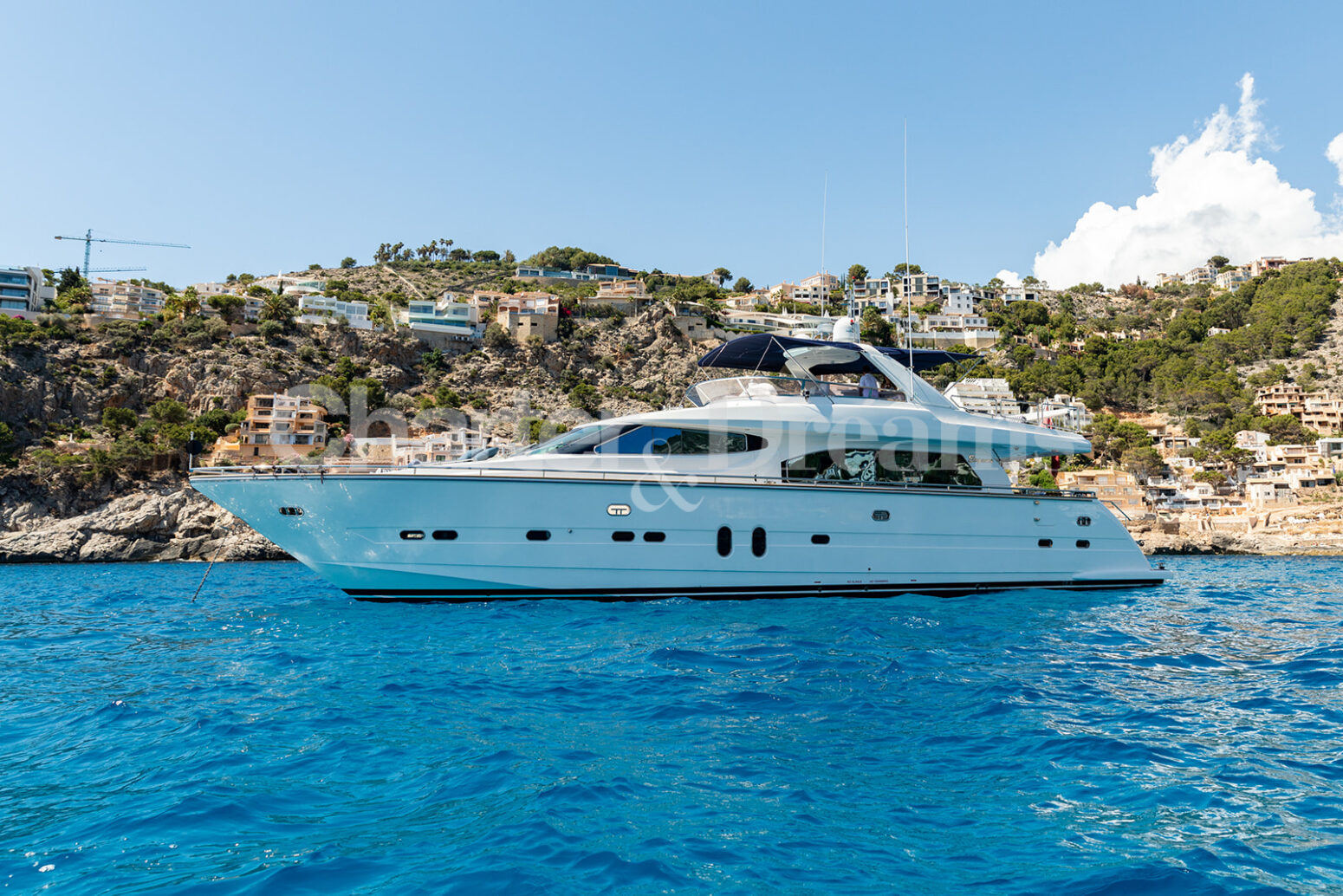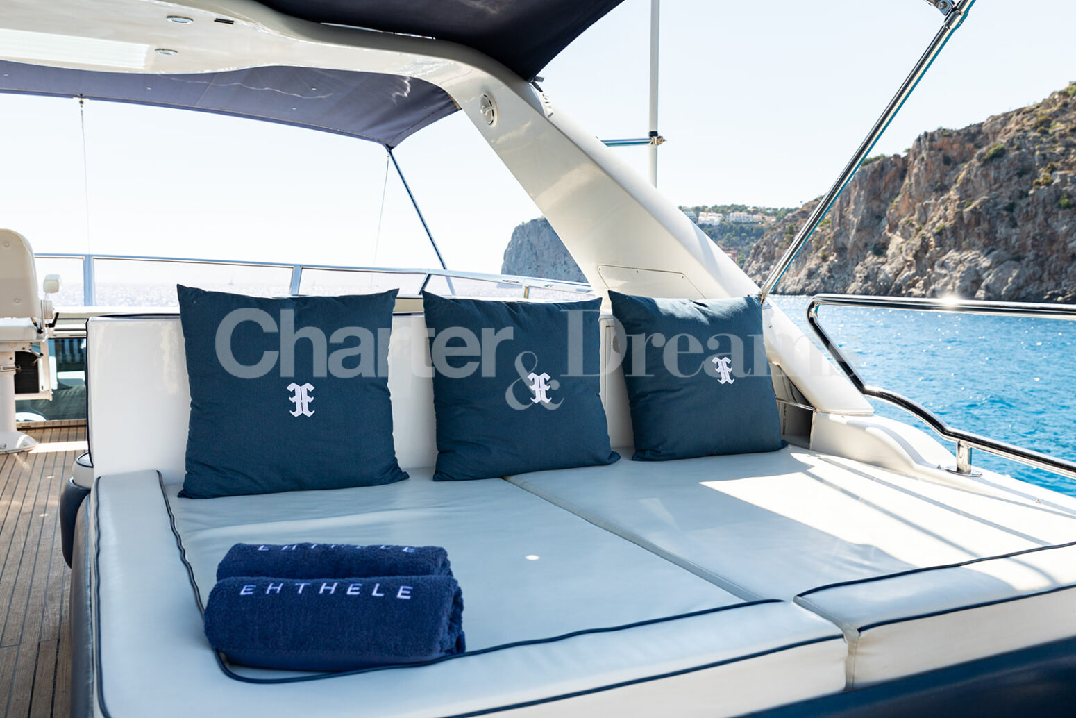 EHTHELE es una Horizon Elegance 78 (2004)—antes VIVACE—puesta al día con refit integral la última temporada. Su perfil clásico envuelve interiores amplios y equilibrados. Ofrece tres cabinas de invitados con baño—Master, VIP y una tercera convertible a doble o twin—además de una doble adicional a popa.