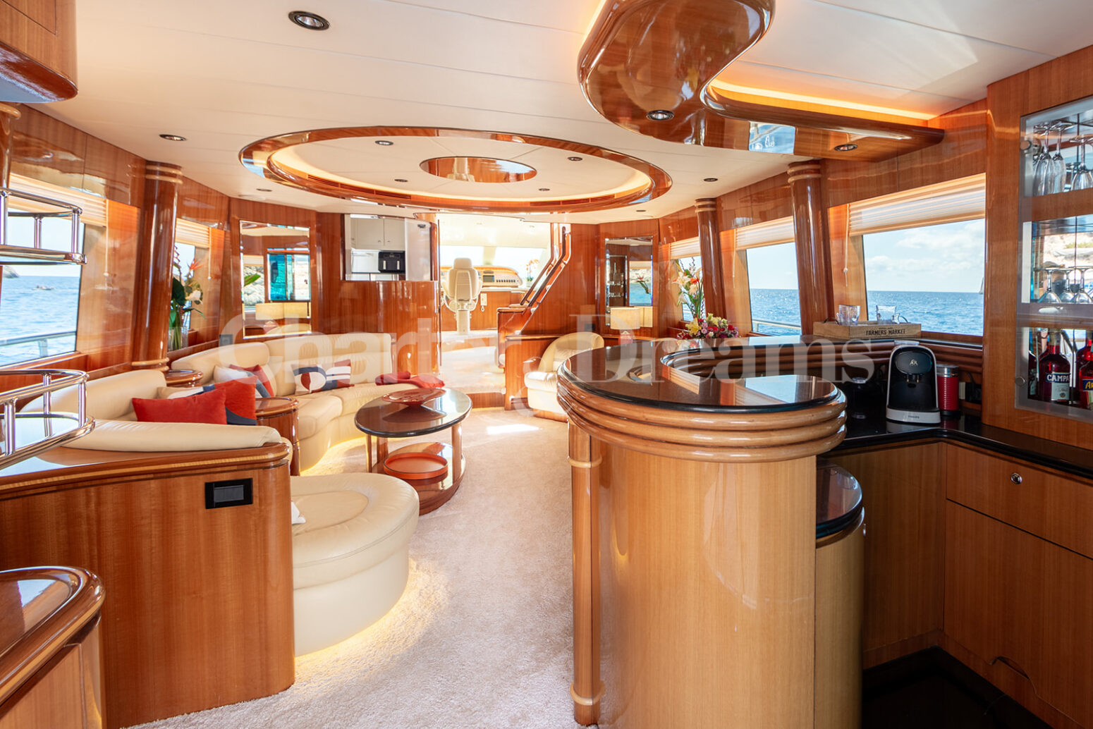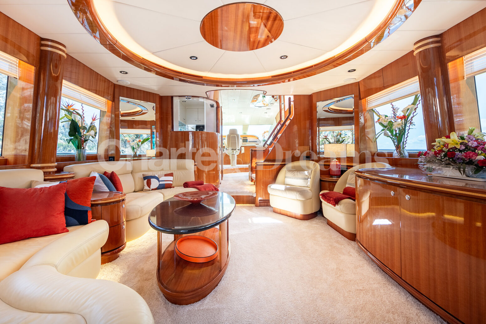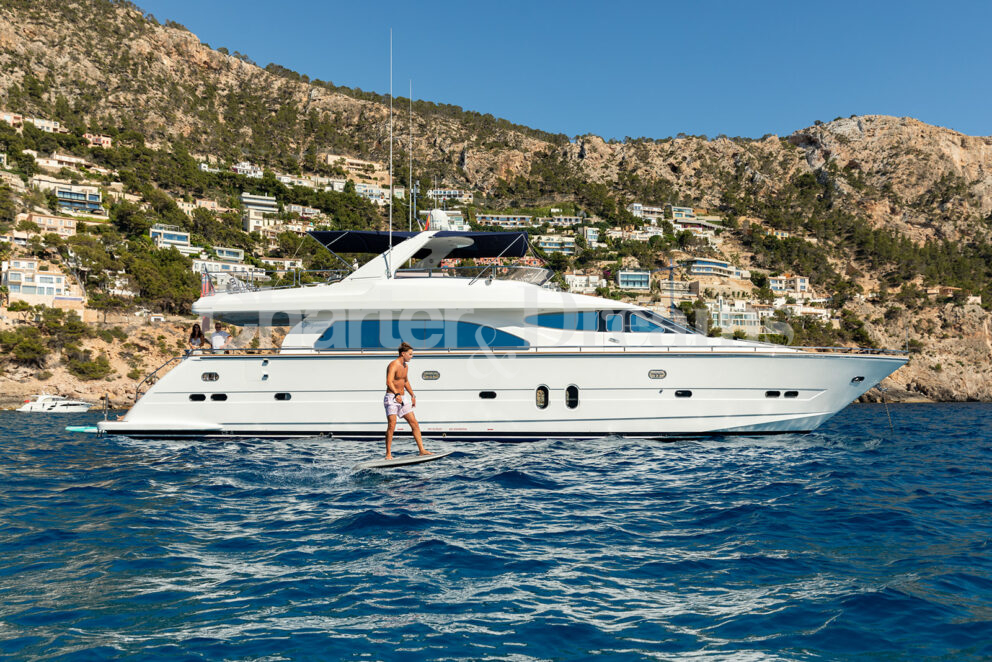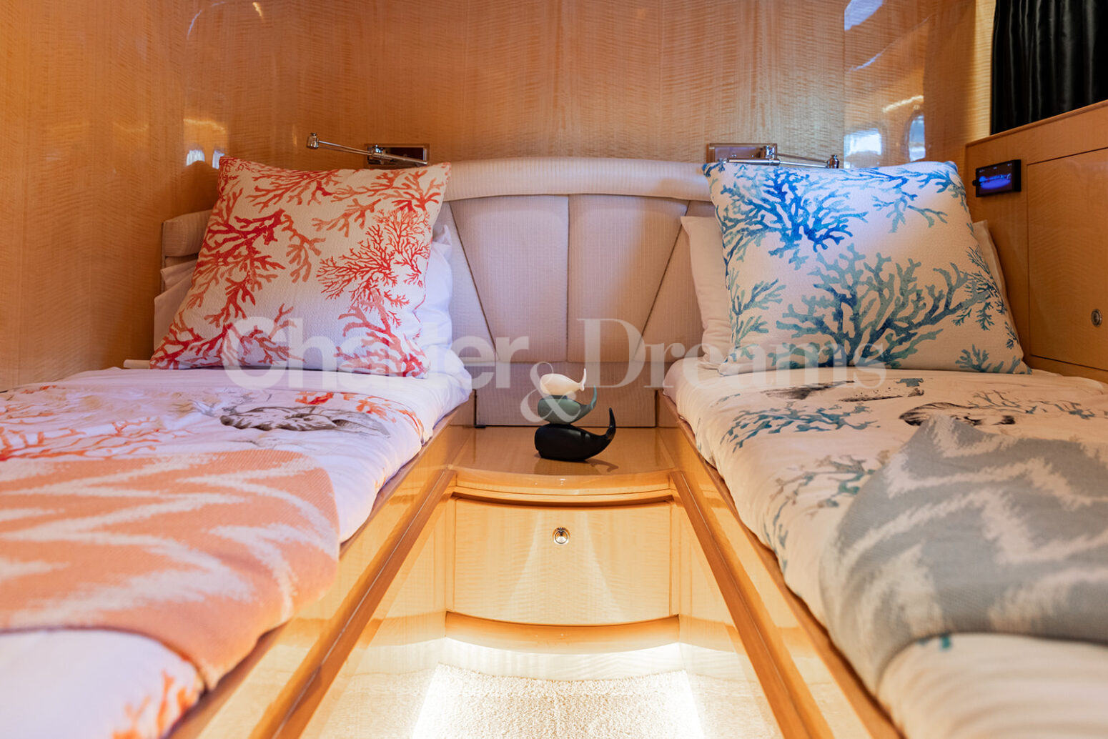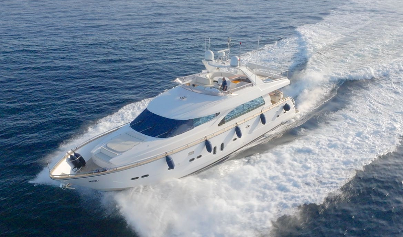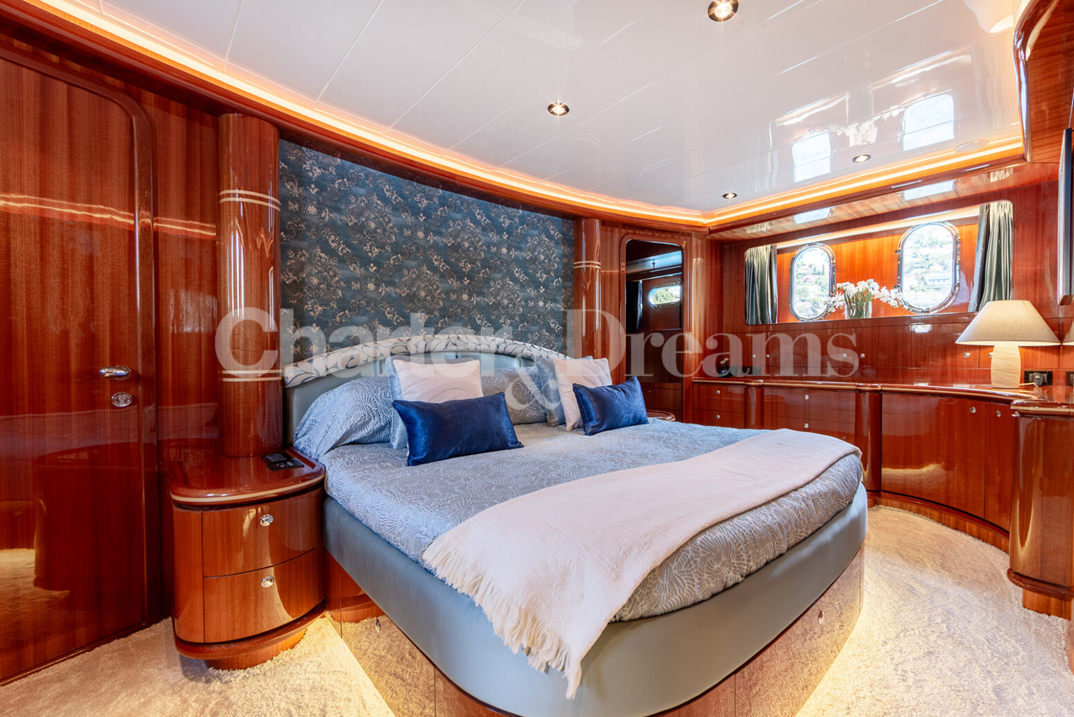 EHTHELE es una Horizon Elegance 78 (2004)—antes VIVACE—puesta al día con refit integral la última temporada. Su perfil clásico envuelve interiores amplios y equilibrados. Ofrece tres cabinas de invitados con baño—Master, VIP y una tercera convertible a doble o twin—además de una doble adicional a popa.