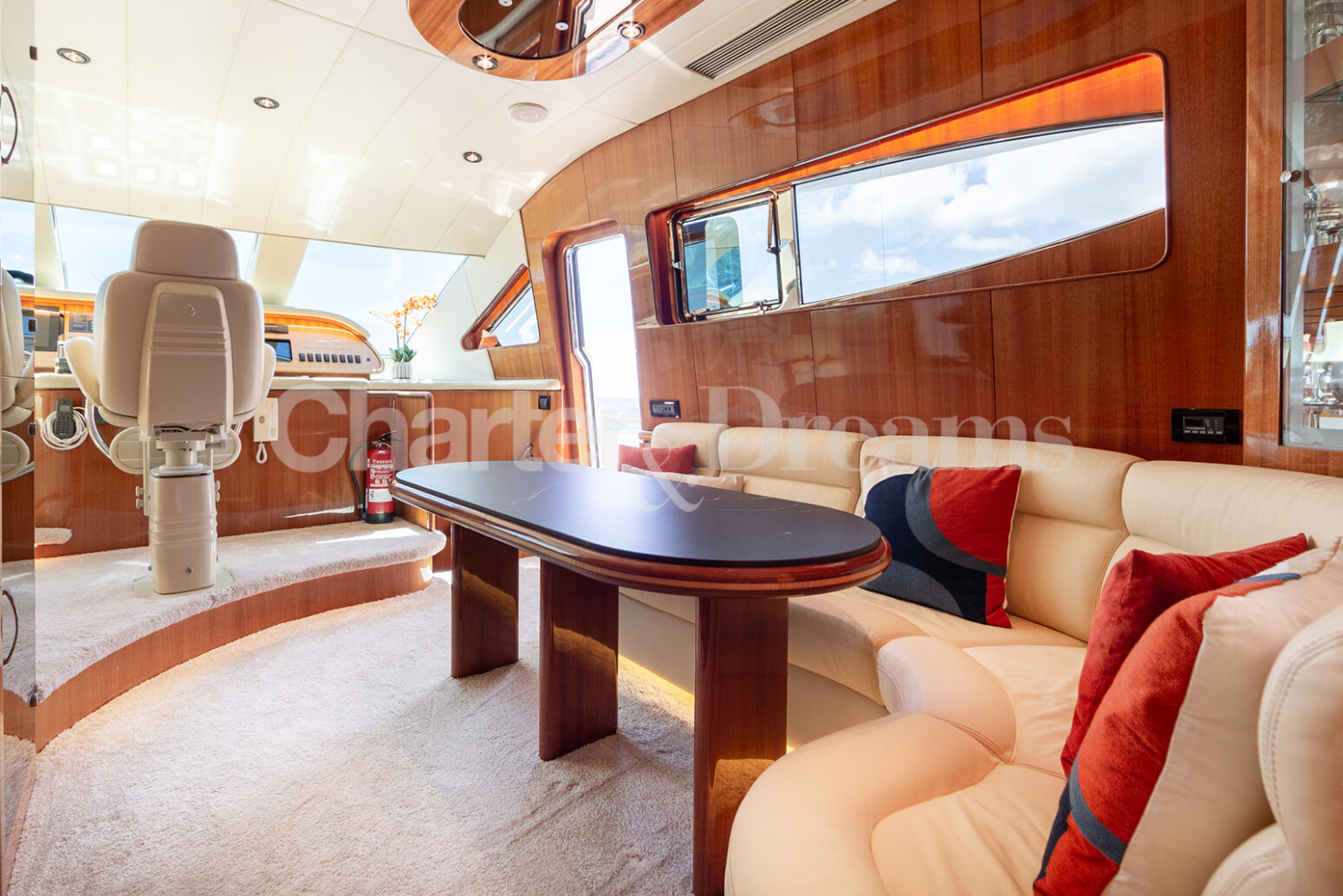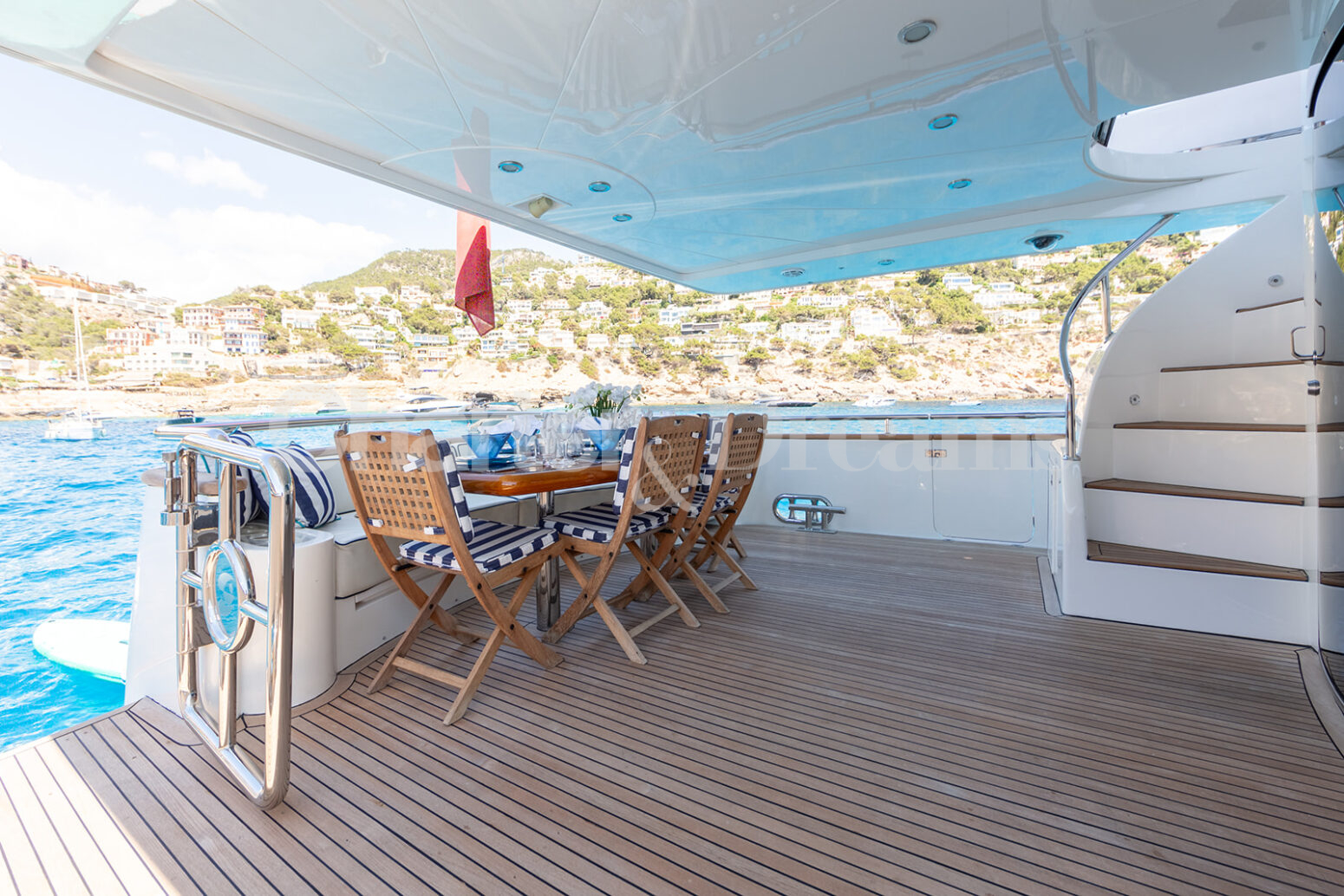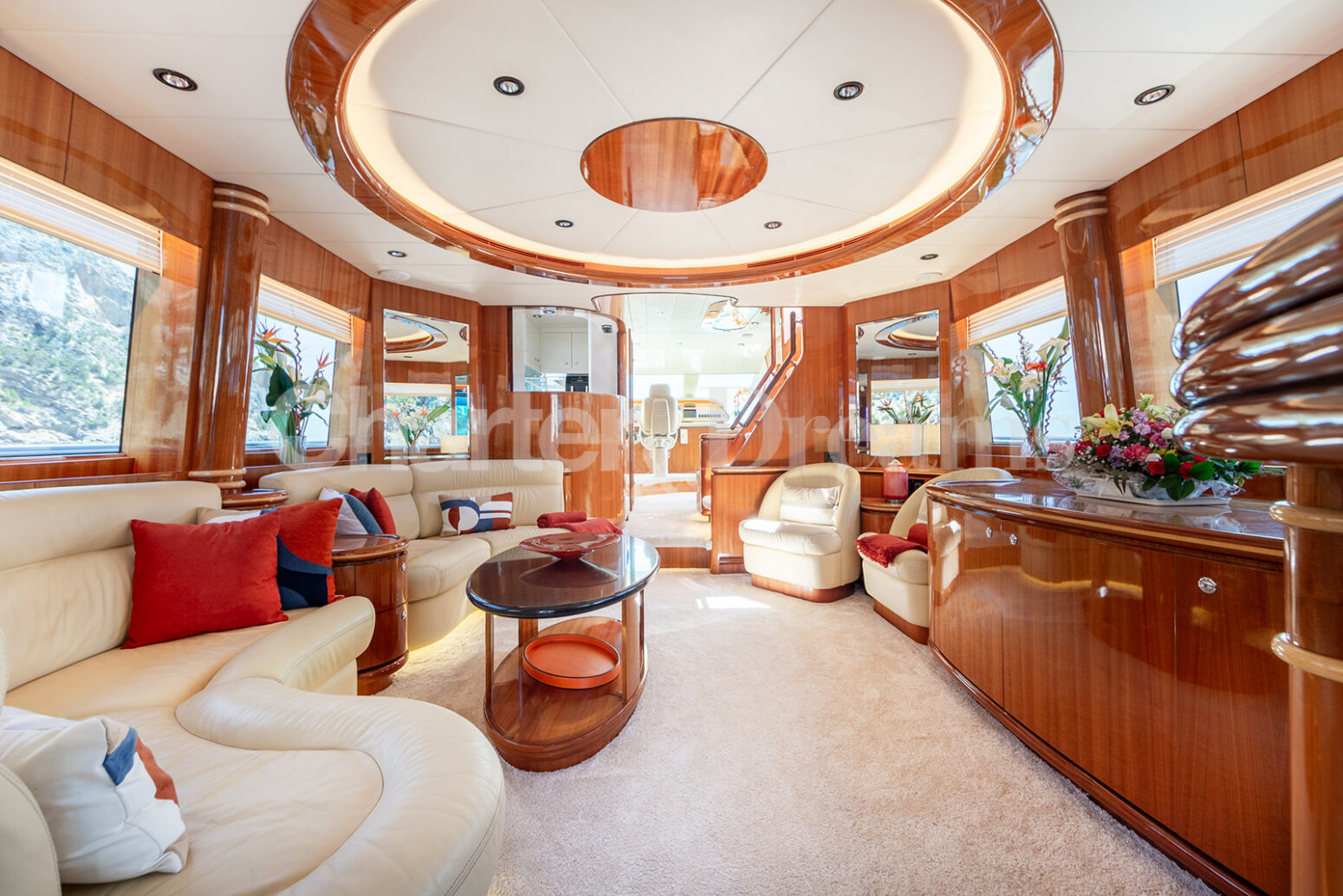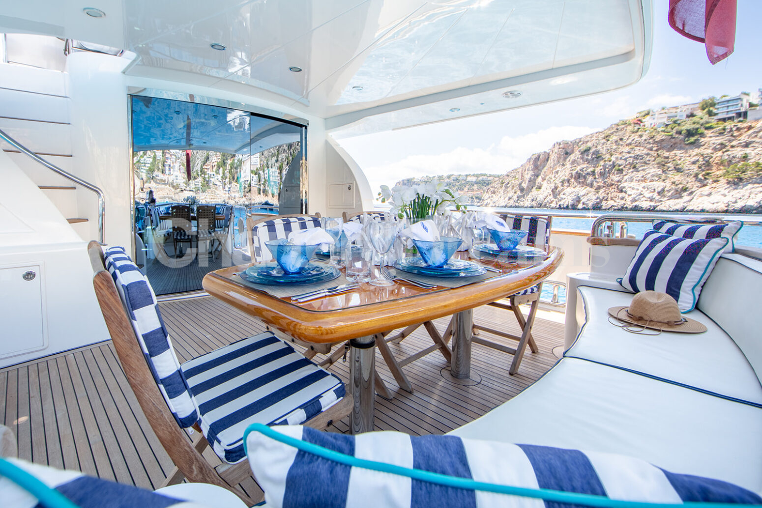 EHTHELE es una Horizon Elegance 78 (2004)—antes VIVACE—puesta al día con refit integral la última temporada. Su perfil clásico envuelve interiores amplios y equilibrados. Ofrece tres cabinas de invitados con baño—Master, VIP y una tercera convertible a doble o twin—además de una doble adicional a popa.