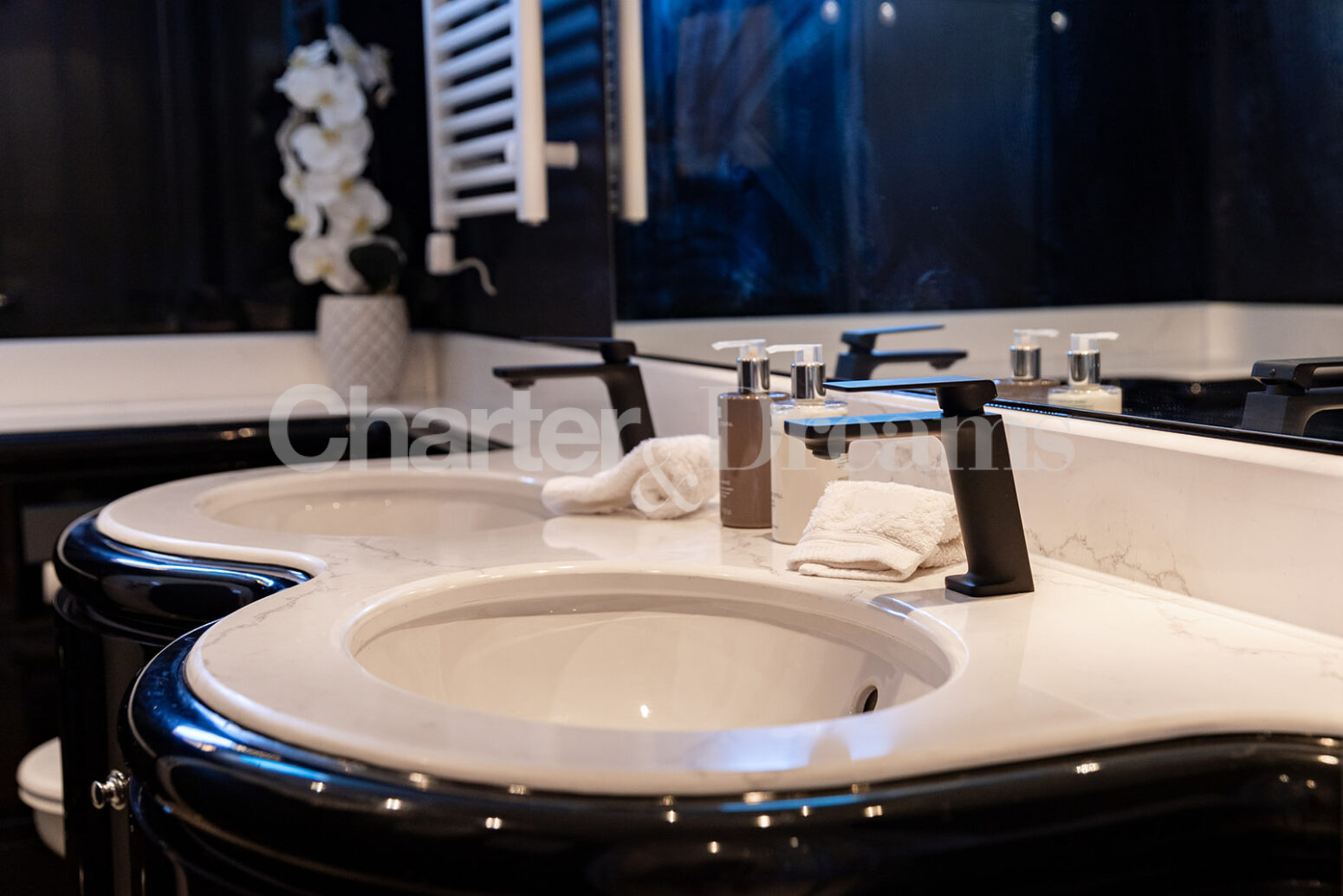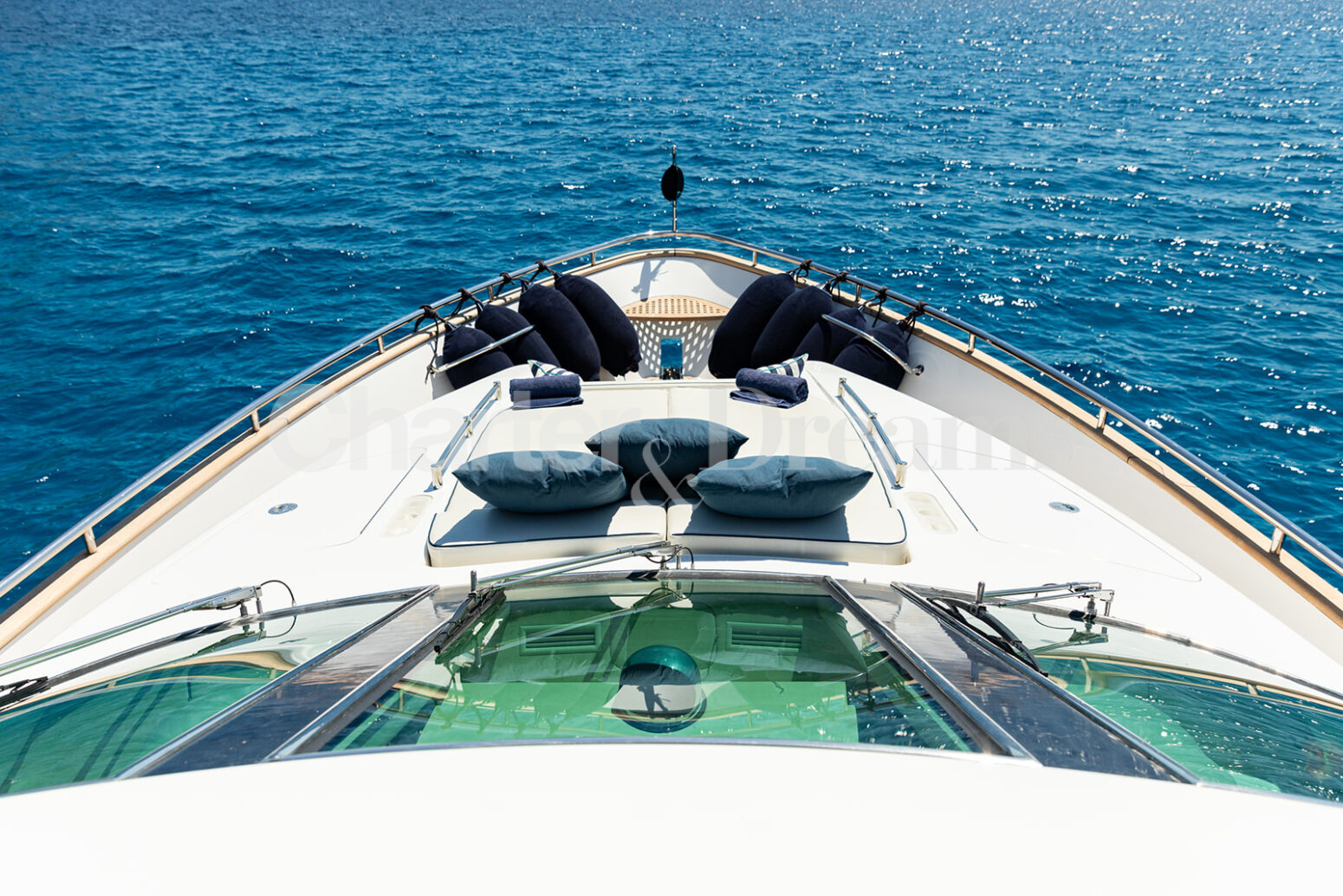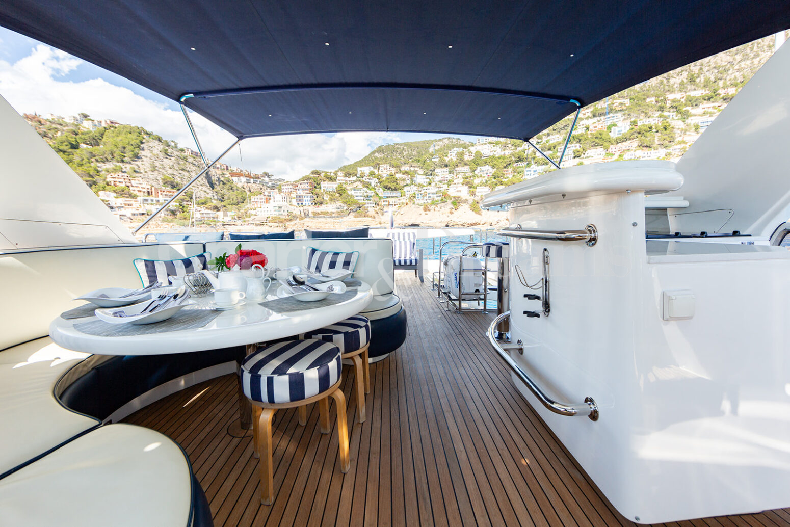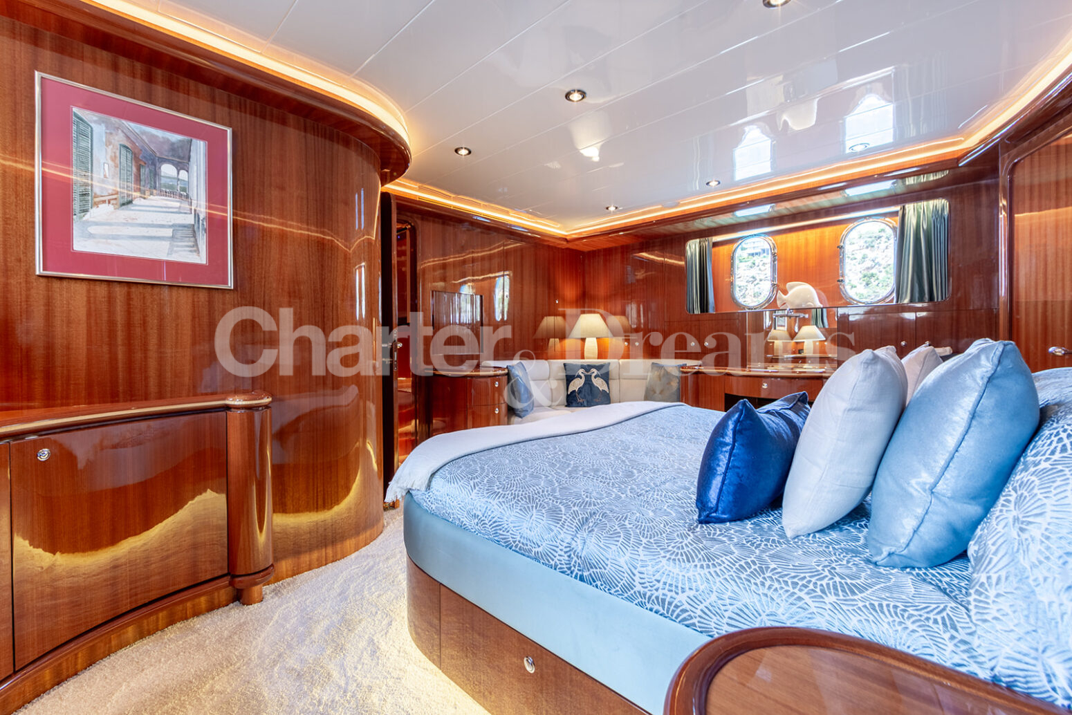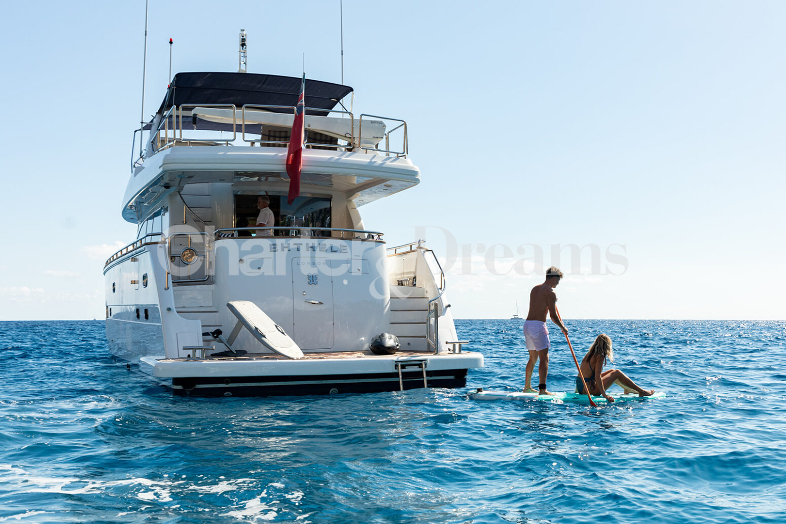 EHTHELE es una Horizon Elegance 78 (2004)—antes VIVACE—puesta al día con refit integral la última temporada. Su perfil clásico envuelve interiores amplios y equilibrados. Ofrece tres cabinas de invitados con baño—Master, VIP y una tercera convertible a doble o twin—además de una doble adicional a popa.