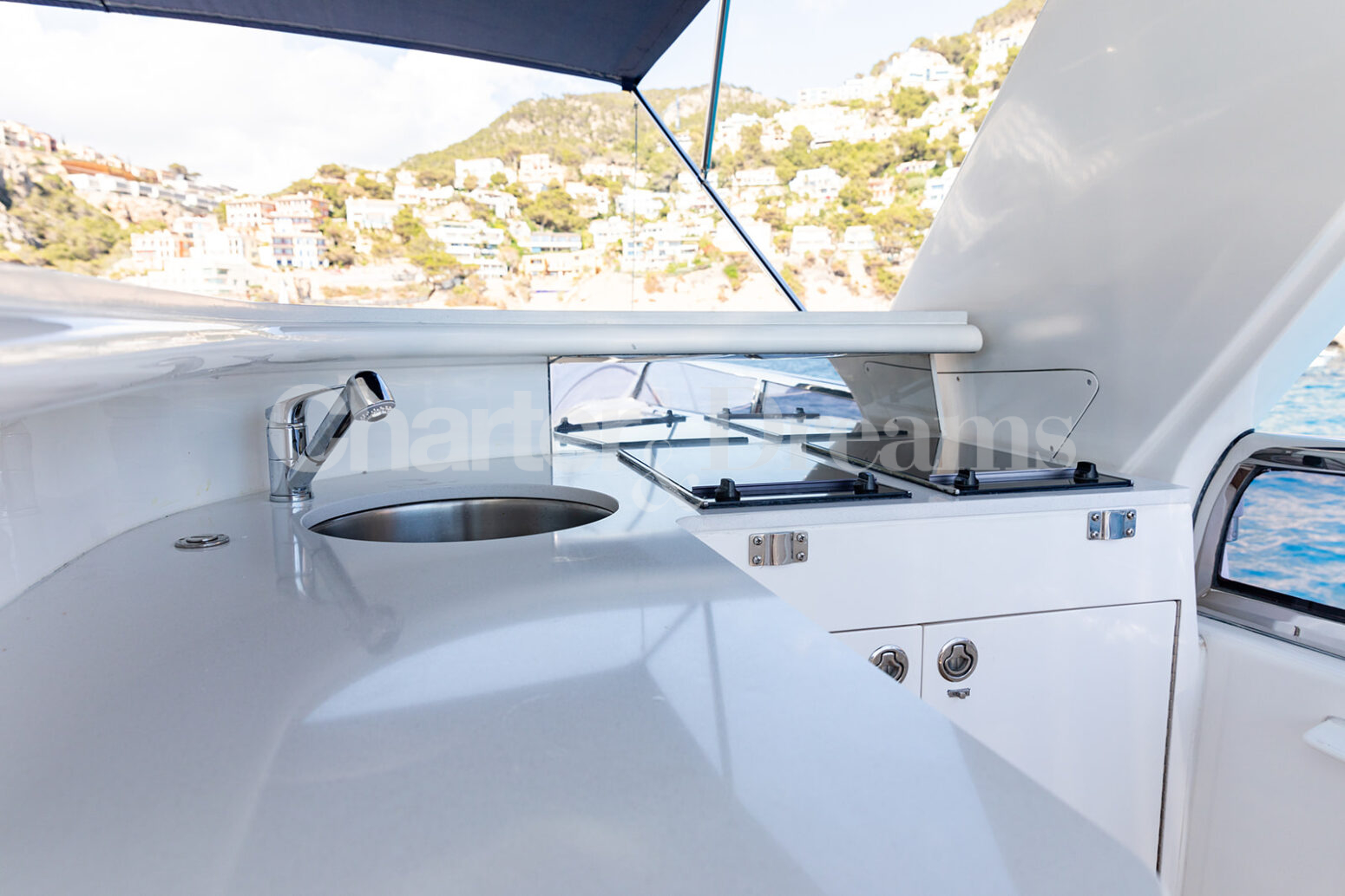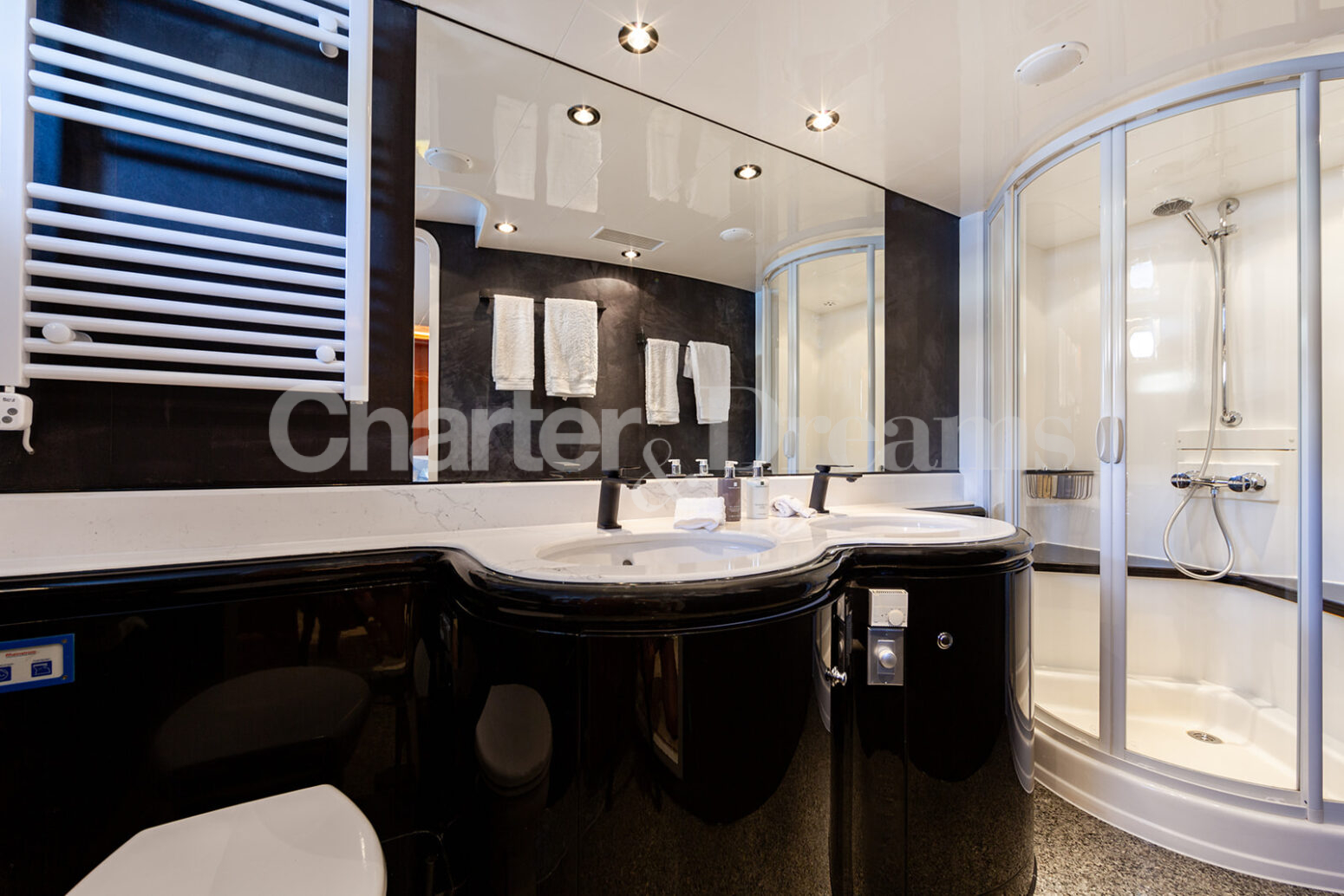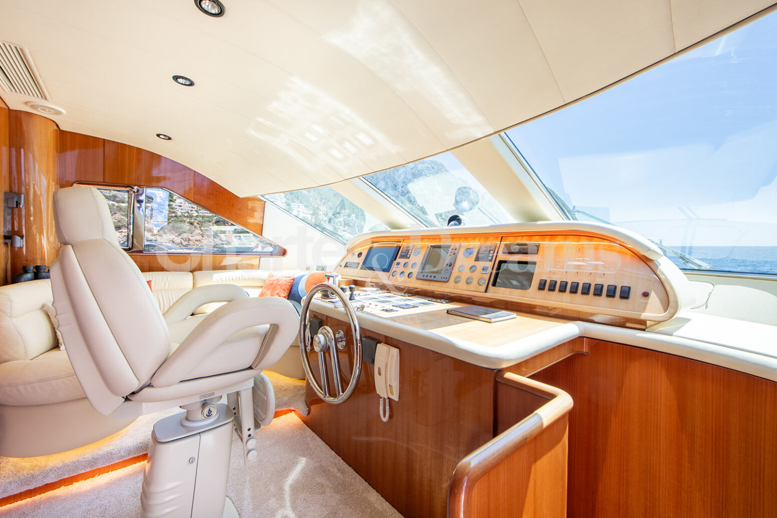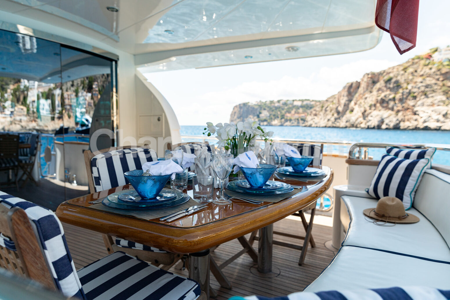 EHTHELE es una Horizon Elegance 78 (2004)—antes VIVACE—puesta al día con refit integral la última temporada. Su perfil clásico envuelve interiores amplios y equilibrados. Ofrece tres cabinas de invitados con baño—Master, VIP y una tercera convertible a doble o twin—además de una doble adicional a popa.