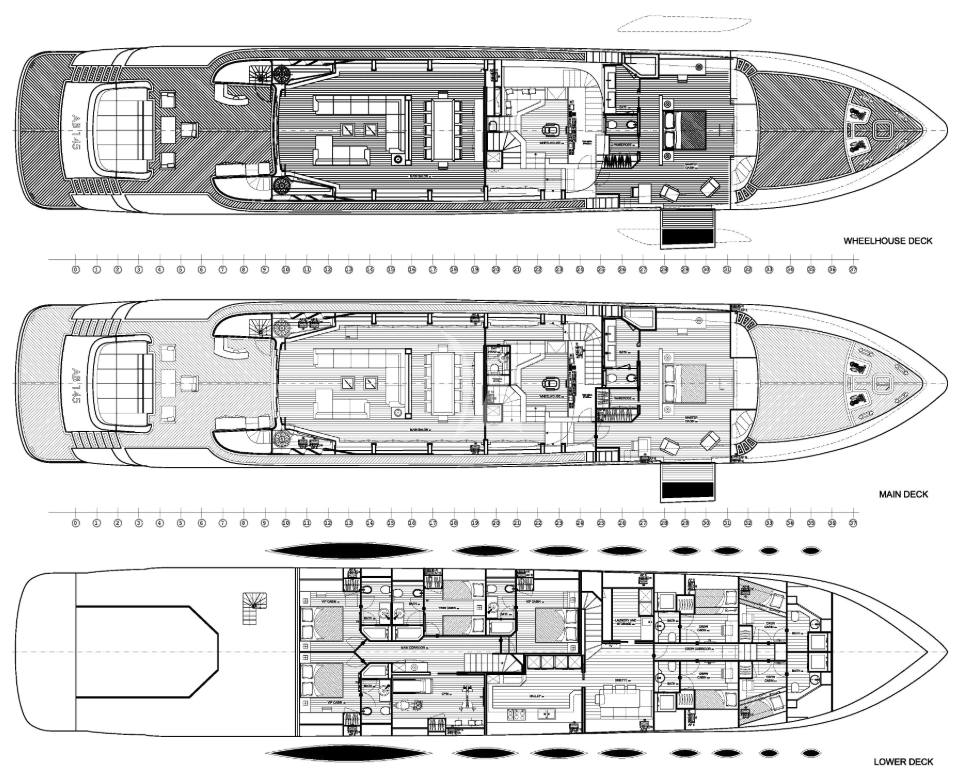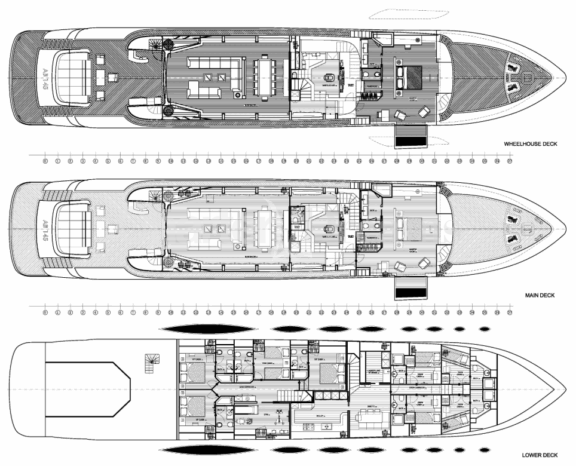 Engines: - 3 x 2,600hp MTU 16V2000 M94 - - Generators: - 2 x 70kW Kohler (silenced) with parallel - - Fuel consumption: - Cruising Speed 20 KTS - Max Speed 42 KTS - - Fuel Consumption: - - - 450 litres per hour at 10kts to 13knots * - 950 litres per hour at 25 knots * - 30+ knots = 1500 lt/hr - - - *. Consumptions figures are estimated and subject to sea, environmental and load conditions.