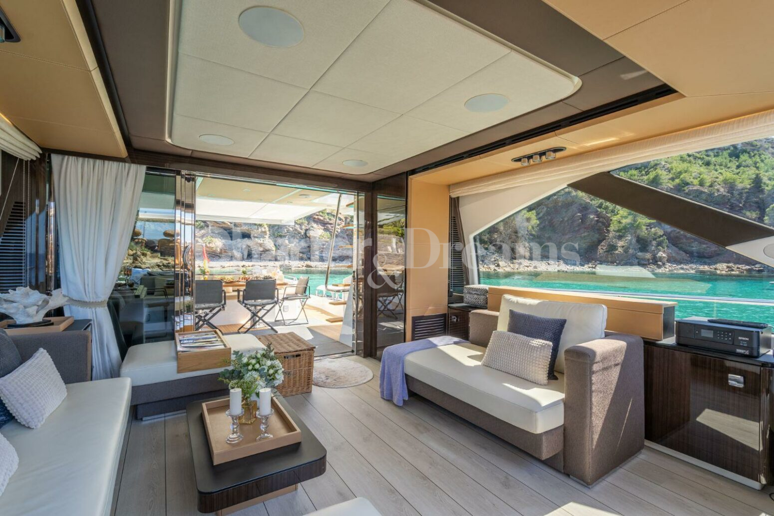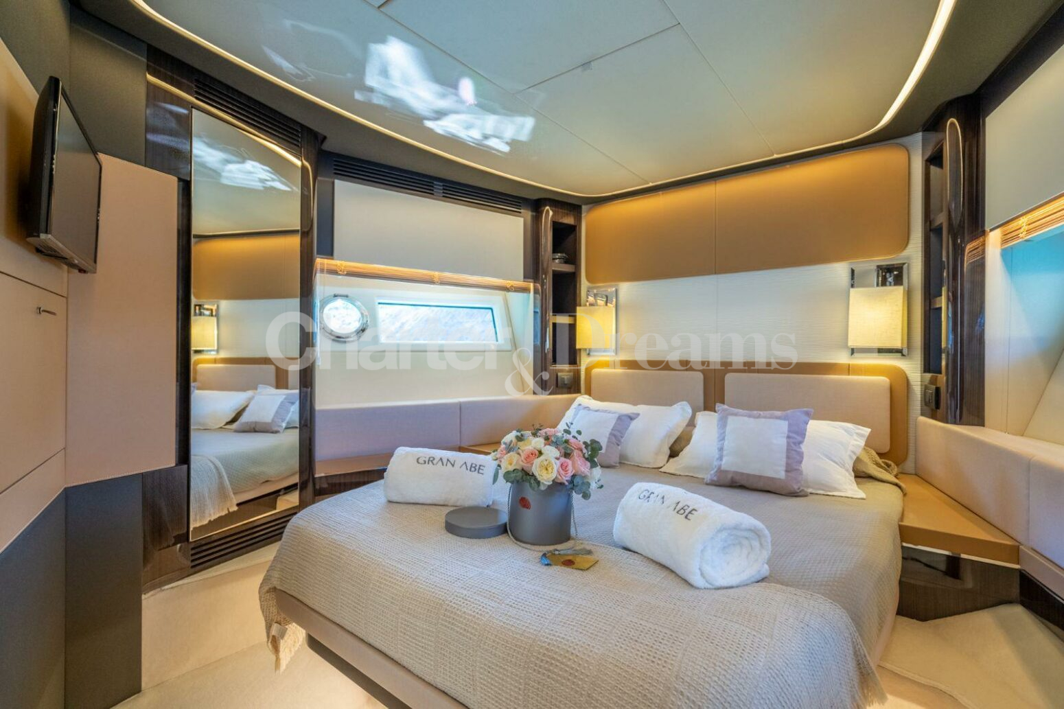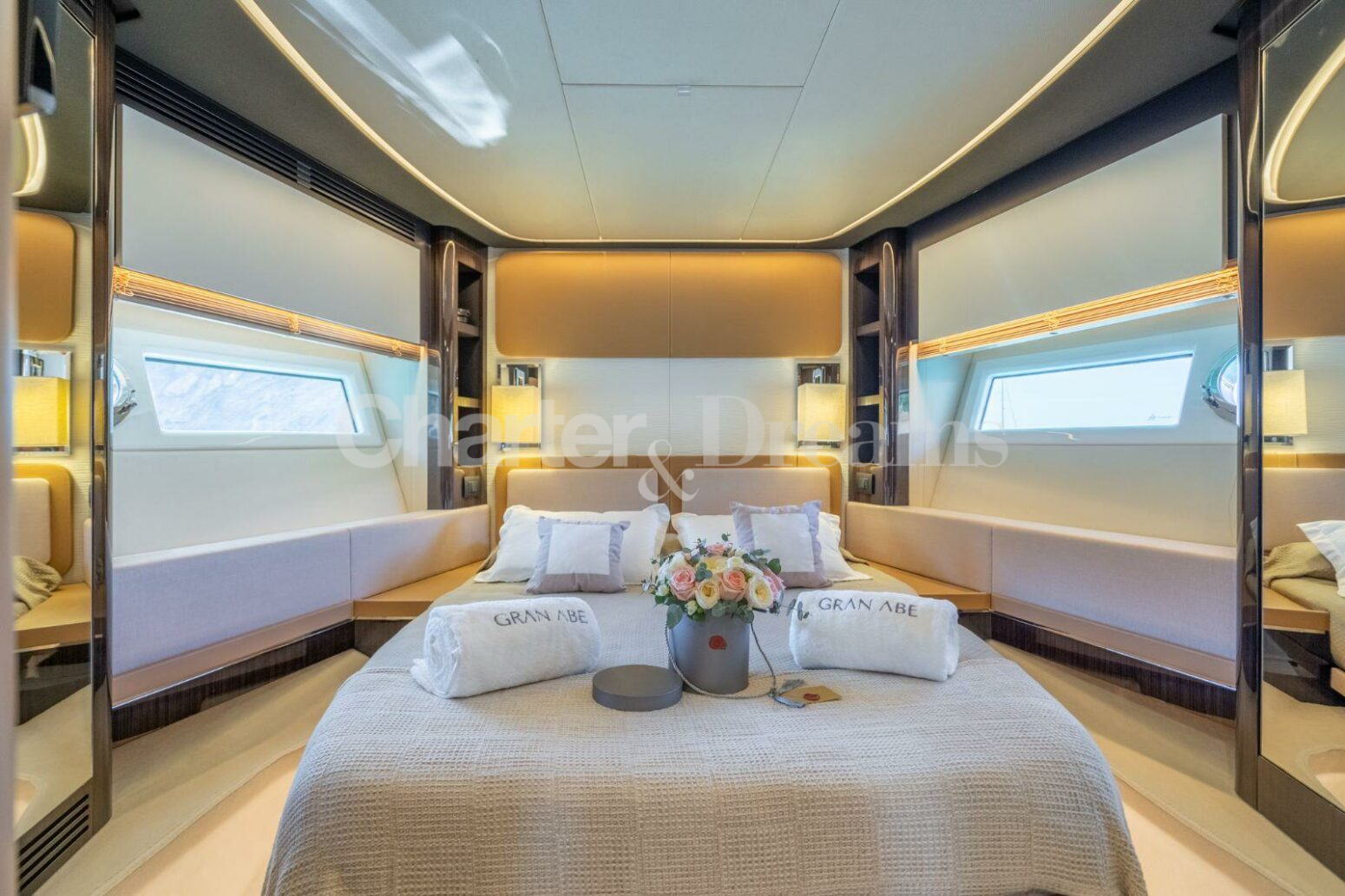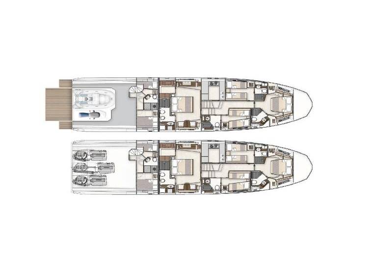 ALOJAMIENTO Y DISTRIBUCION GRAN ABE II tiene un interior elegante y moderno y puede alojar cómodamente hasta 9 huéspedes en 4 camarotes con baño privado, incluyendo un camarote principal, un camarote VIP y dos camarotes dobles. El camarote principal cubre toda la manga con un escritorio y un sofá, el camarote VIP está situado en la proa con mucha luz natural, y de los dos camarotes twin, uno dispone de una litera extra. El yate cuenta con un sofisticado diseño exterior de Stefano Righini y su diseño interior es obra de Carlo Galeazzi. Dispone de generosas zonas para tomar el sol en proa, popa y flybridge. La puerta de su garaje se abre hidráulicamente, creando una zona de «club de playa» muy espaciosa con tumbonas reclinables, perfecta para una tarde de deportes acuáticos o un cóctel nocturno. En el interior, el salón cuenta con grandes ventanales que permiten disfrutar de la luz natural mientras se relaja en el sofá en forma de L. PERFORMANCE