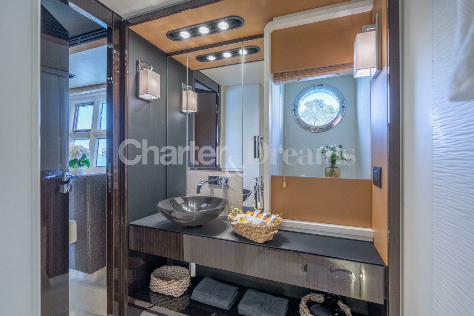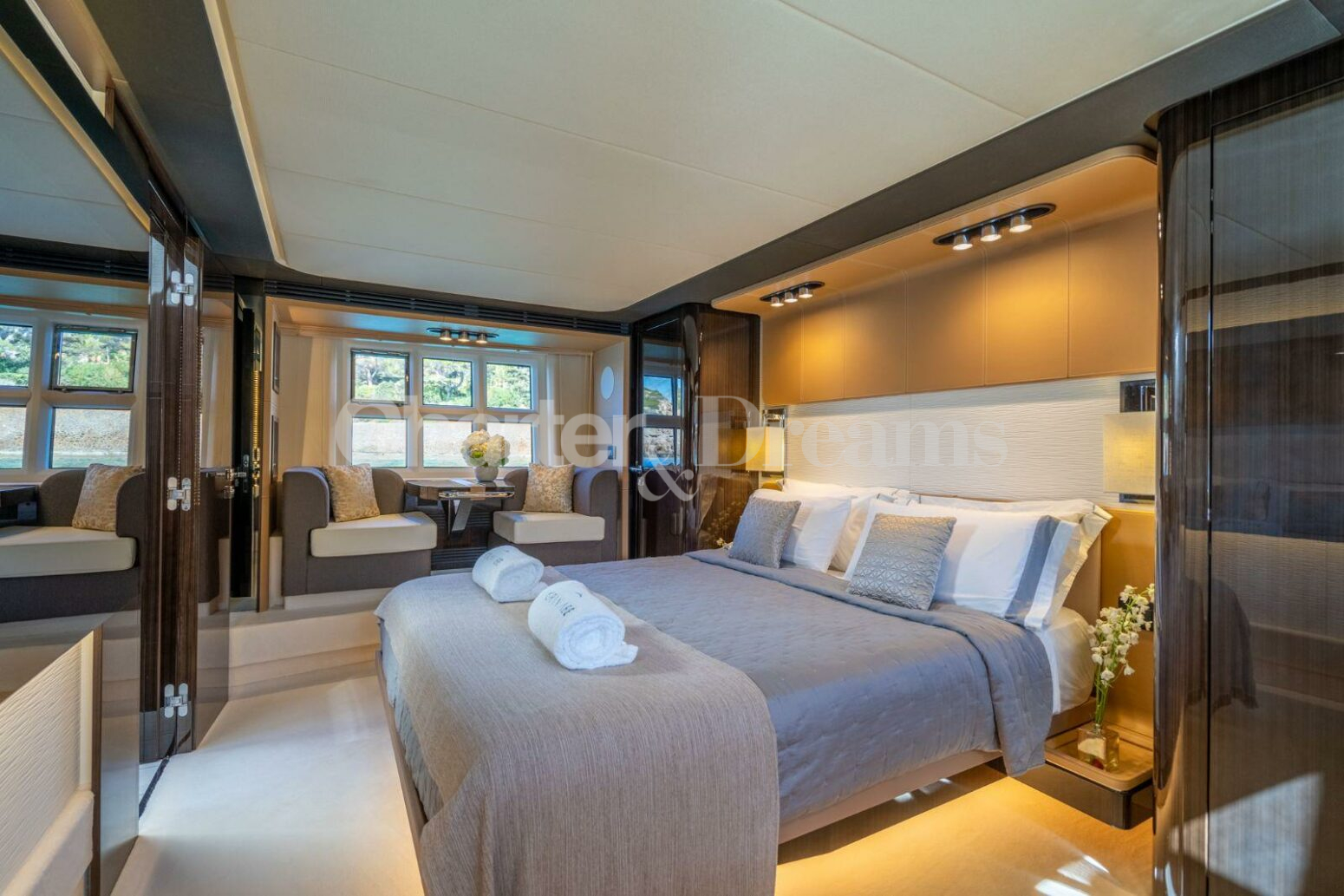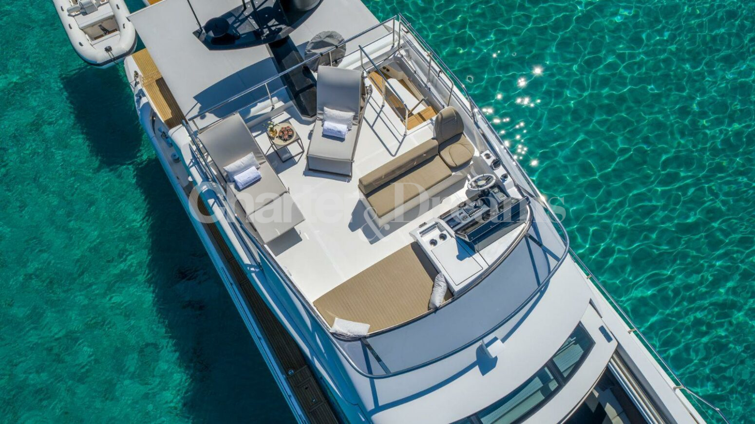 ALOJAMIENTO Y DISTRIBUCION GRAN ABE II tiene un interior elegante y moderno y puede alojar cómodamente hasta 9 huéspedes en 4 camarotes con baño privado, incluyendo un camarote principal, un camarote VIP y dos camarotes dobles. El camarote principal cubre toda la manga con un escritorio y un sofá, el camarote VIP está situado en la proa con mucha luz natural, y de los dos camarotes twin, uno dispone de una litera extra. El yate cuenta con un sofisticado diseño exterior de Stefano Righini y su diseño interior es obra de Carlo Galeazzi. Dispone de generosas zonas para tomar el sol en proa, popa y flybridge. La puerta de su garaje se abre hidráulicamente, creando una zona de «club de playa» muy espaciosa con tumbonas reclinables, perfecta para una tarde de deportes acuáticos o un cóctel nocturno. En el interior, el salón cuenta con grandes ventanales que permiten disfrutar de la luz natural mientras se relaja en el sofá en forma de L. PERFORMANCE