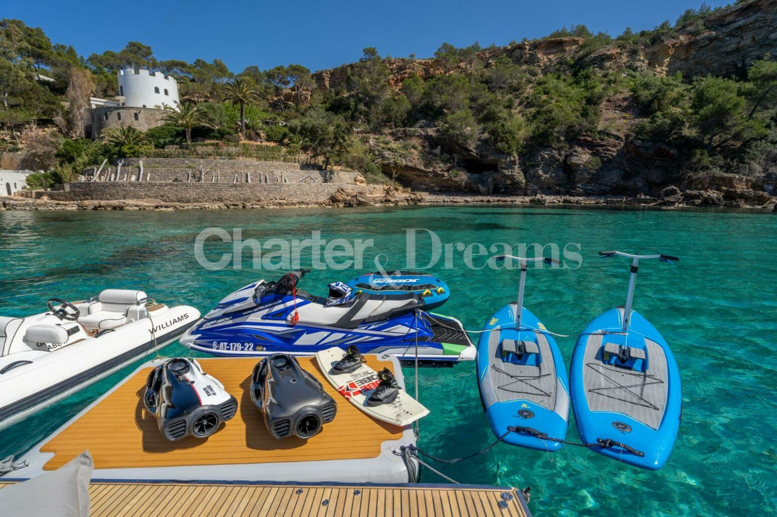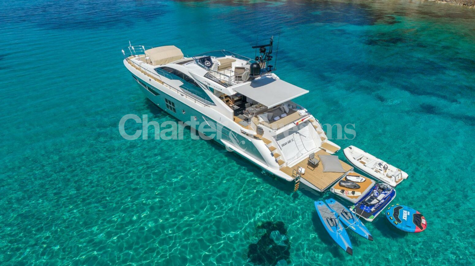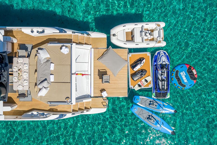 GRAN ABE II cuenta con una muy amplia gama juguetes de agua, con una embarcación auxiliar Williams 385, un jetski, dos seabobs, dos Hobbie Mirage Eclipse Pedalboards, una plataforma inflable y equipo de snorkel. Disfrute de sus verano inolvidable con este fabuloso yate.