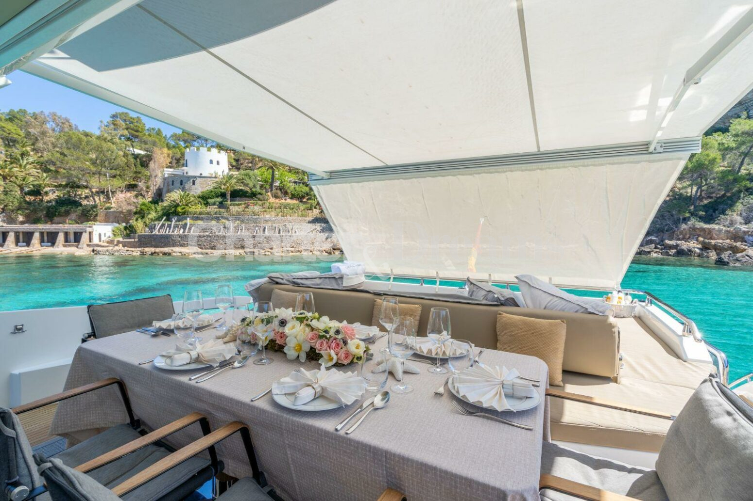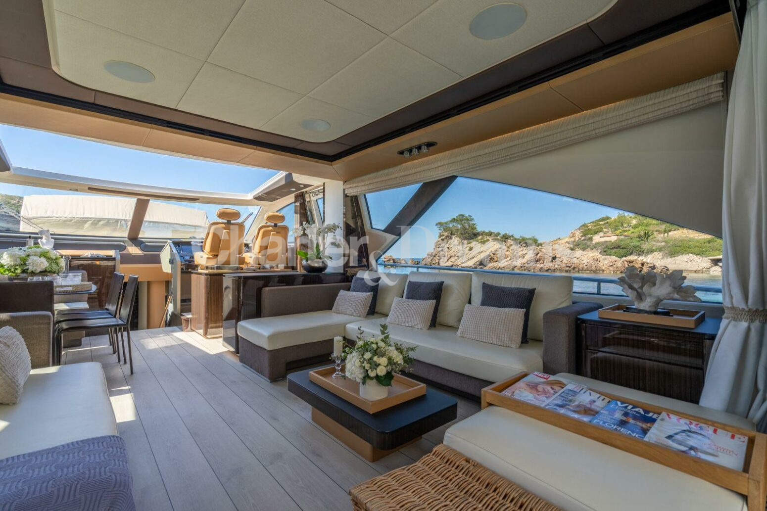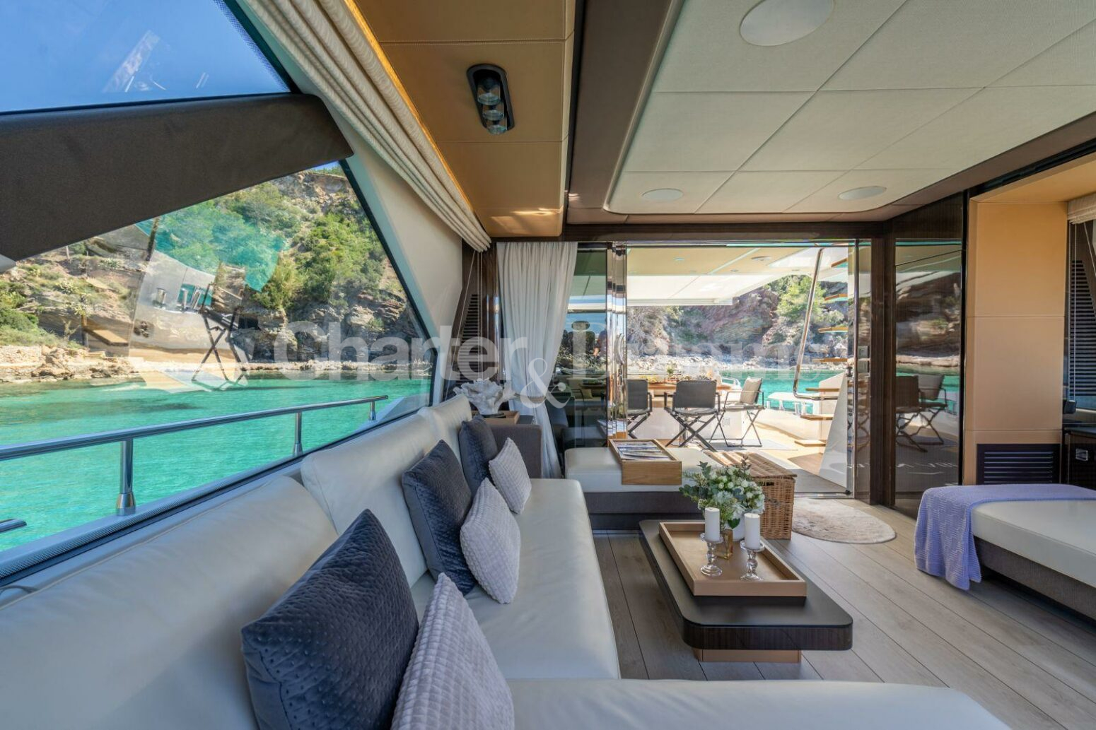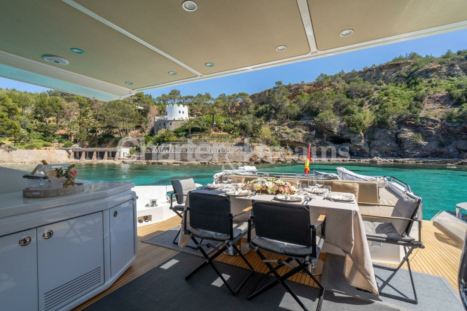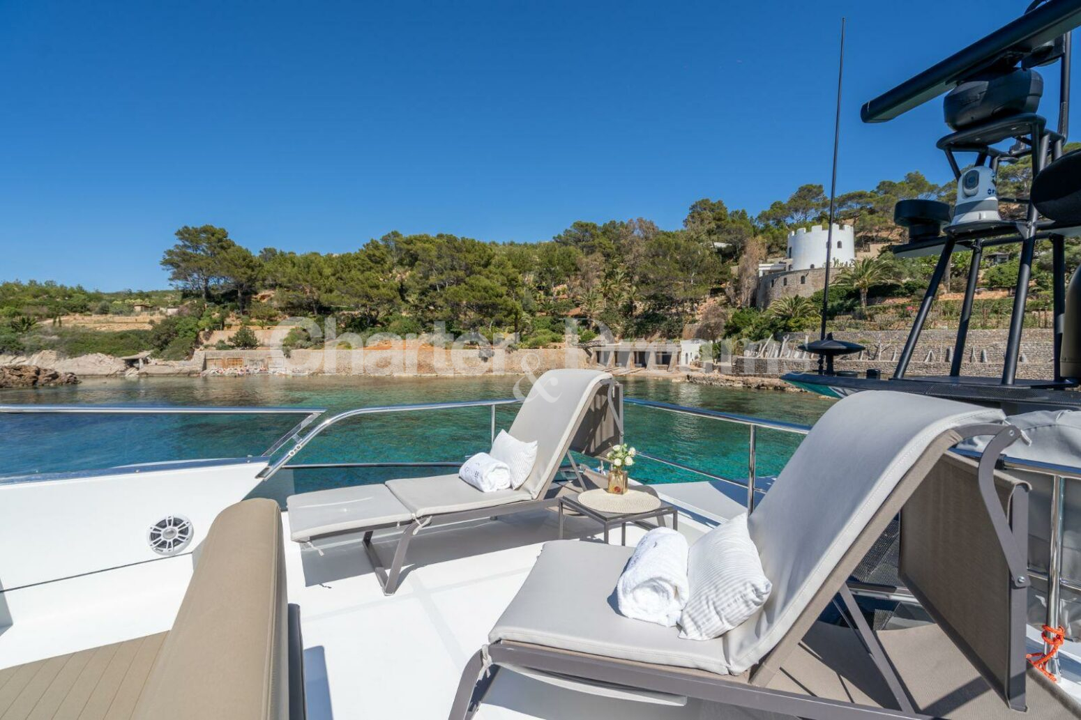 Amarre en Marina Ibiza incluido en el precio, en la zona VIP justo enfrente de todas las boutiques de lujo y a sólo unos pasos del famoso restaurante Lio