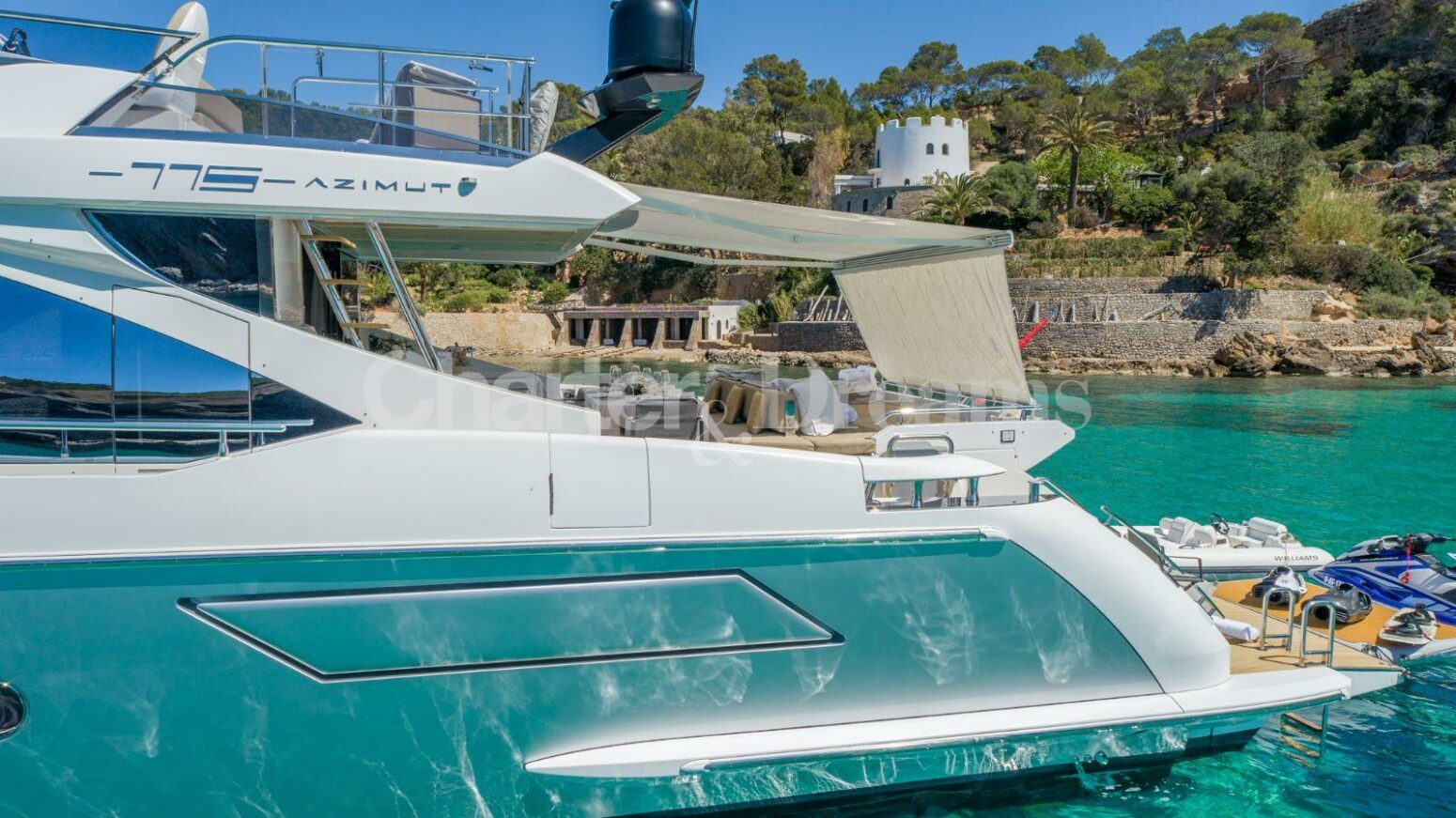 EQUIPAMIENTO Este Azimut está totalmente equipado con toda la electrónica necesaria. Incluso está equipado con estabilizadores para garantizar un ambiente tranquilo cuando está fondeado y cuando navega.