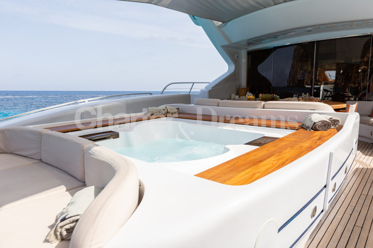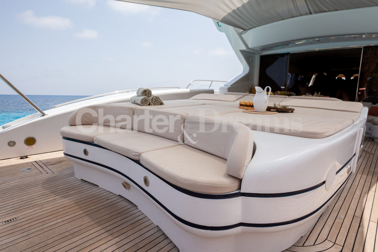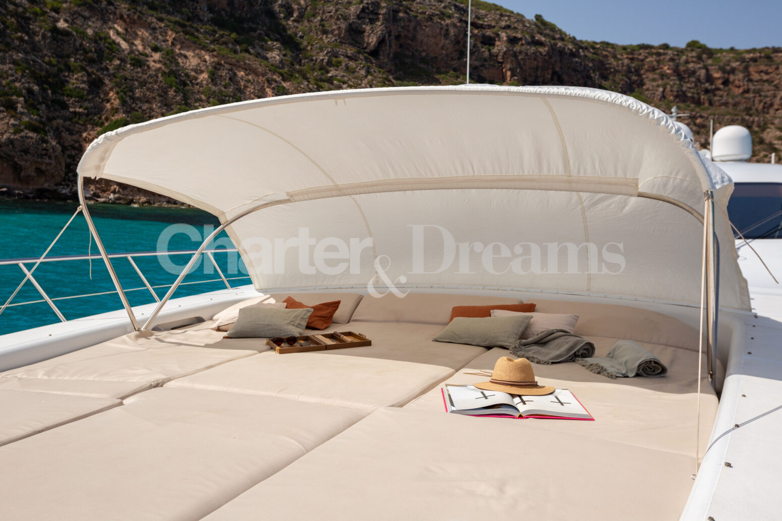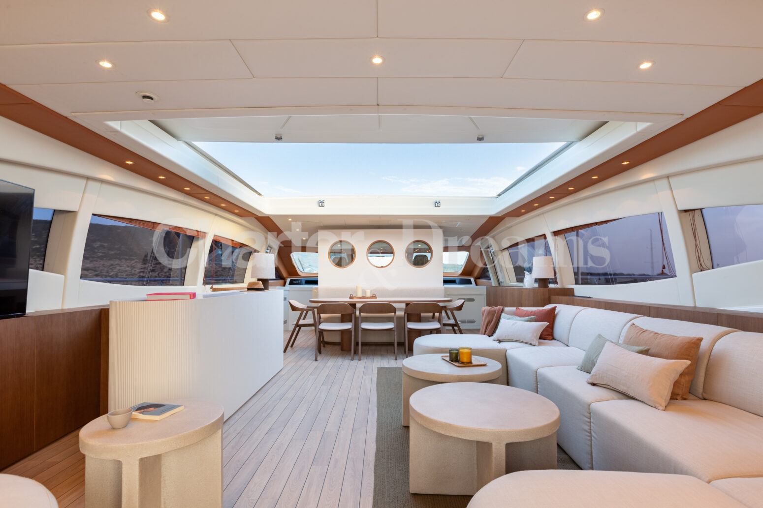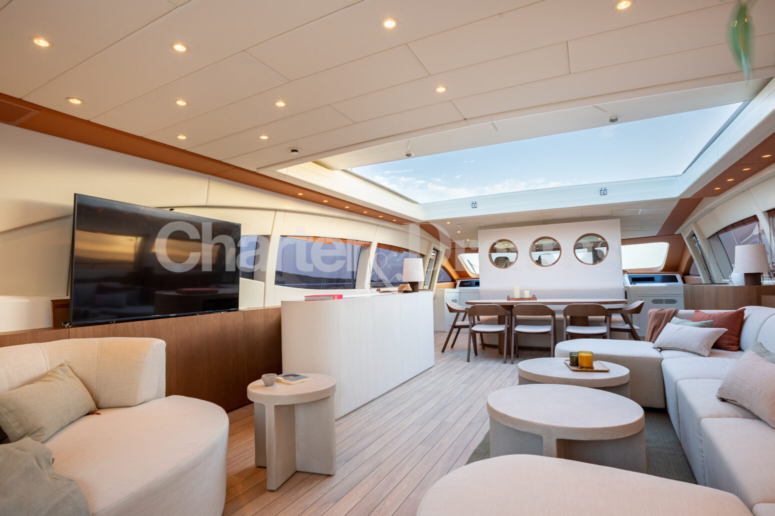 El salón, renovado, es amplio y luminoso: zona de sofás a estribor, barra enfrente, gran mesa de comedor y un techo parcialmente abatible que inunda de luz el espacio. En el exterior, mesa de popa a medida para ocho, soláriums en proa y popa y jacuzzi oculto bajo el sunpad de popa; toldos retráctiles en ambos extremos aseguran sombra.