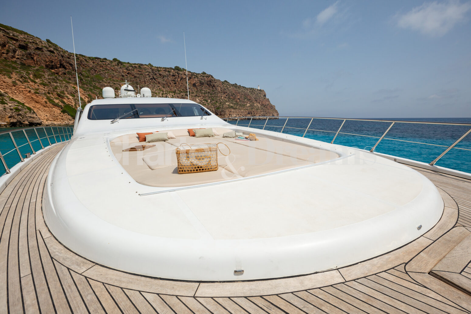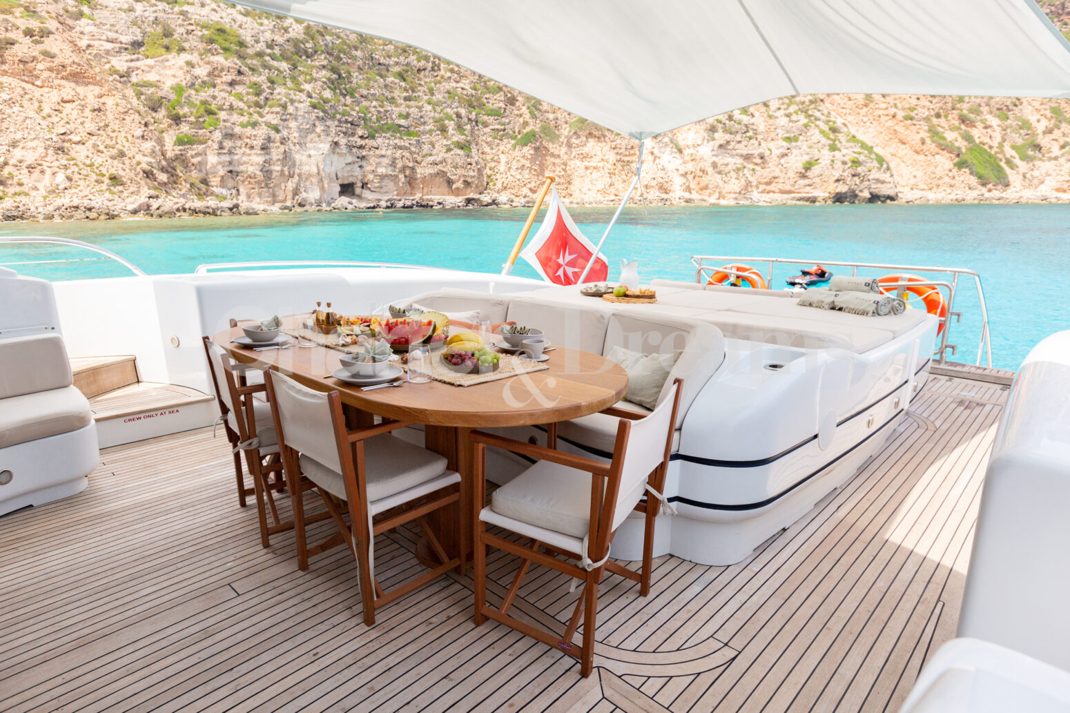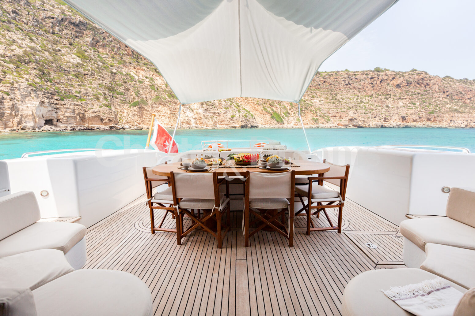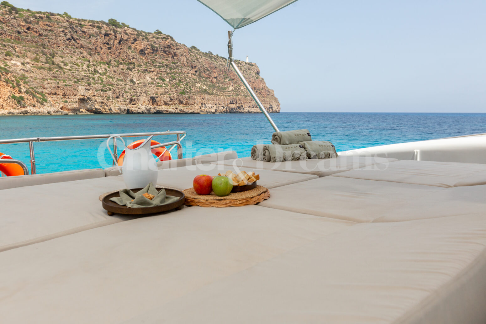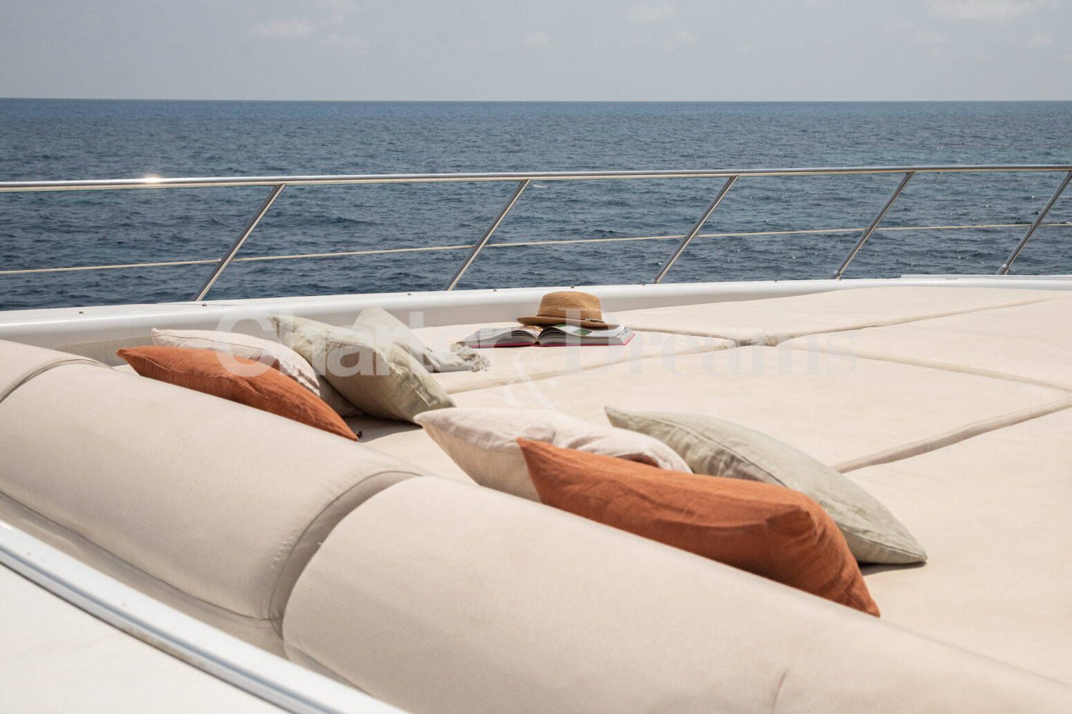 El salón, renovado, es amplio y luminoso: zona de sofás a estribor, barra enfrente, gran mesa de comedor y un techo parcialmente abatible que inunda de luz el espacio. En el exterior, mesa de popa a medida para ocho, soláriums en proa y popa y jacuzzi oculto bajo el sunpad de popa; toldos retráctiles en ambos extremos aseguran sombra.