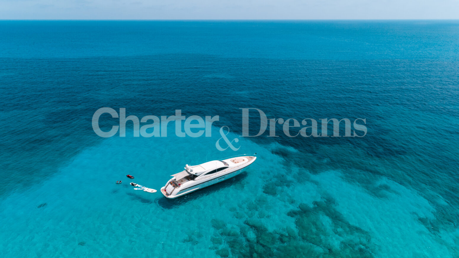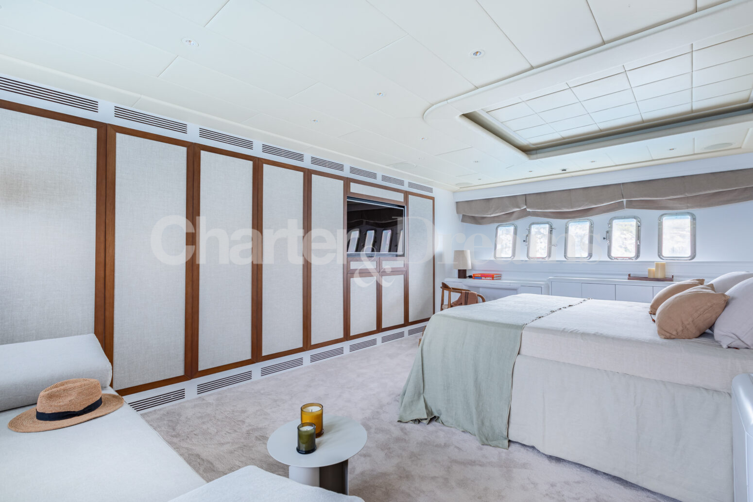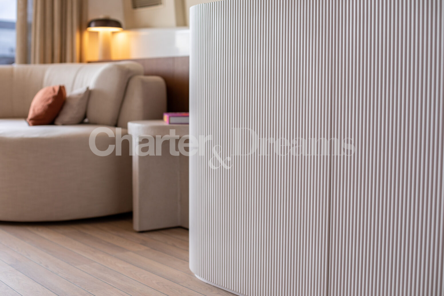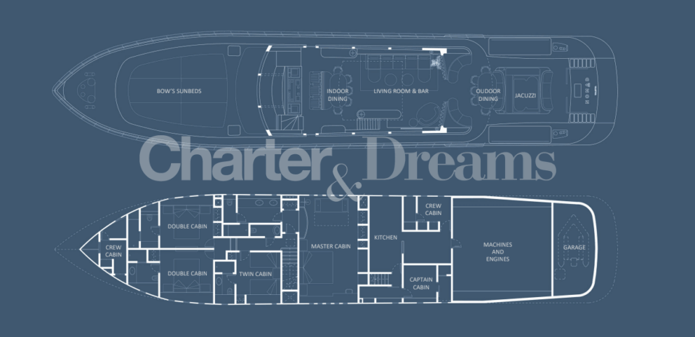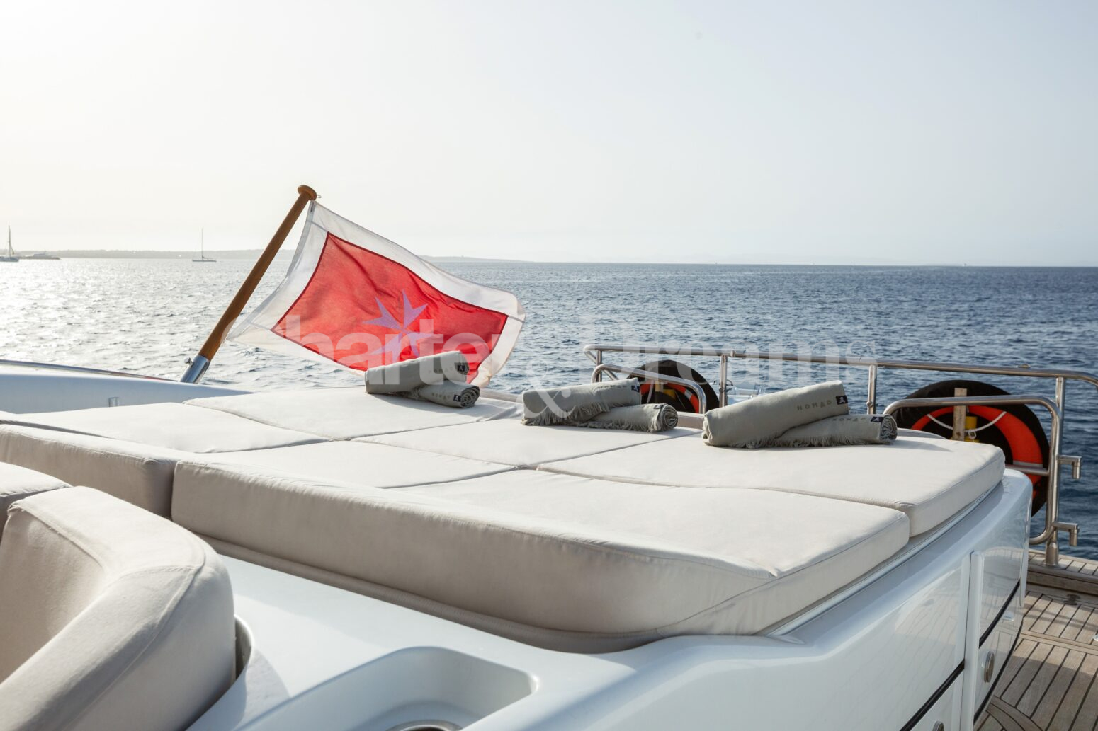 El salón, renovado, es amplio y luminoso: zona de sofás a estribor, barra enfrente, gran mesa de comedor y un techo parcialmente abatible que inunda de luz el espacio. En el exterior, mesa de popa a medida para ocho, soláriums en proa y popa y jacuzzi oculto bajo el sunpad de popa; toldos retráctiles en ambos extremos aseguran sombra.