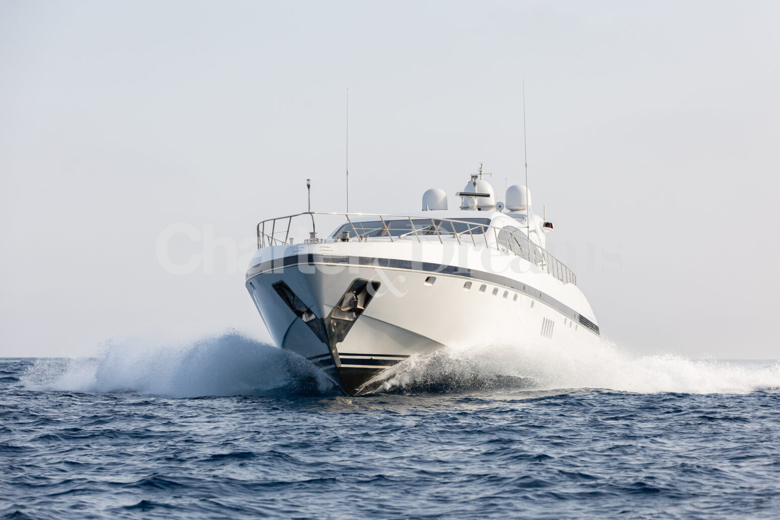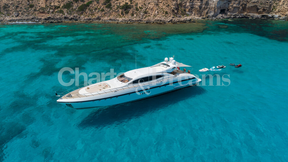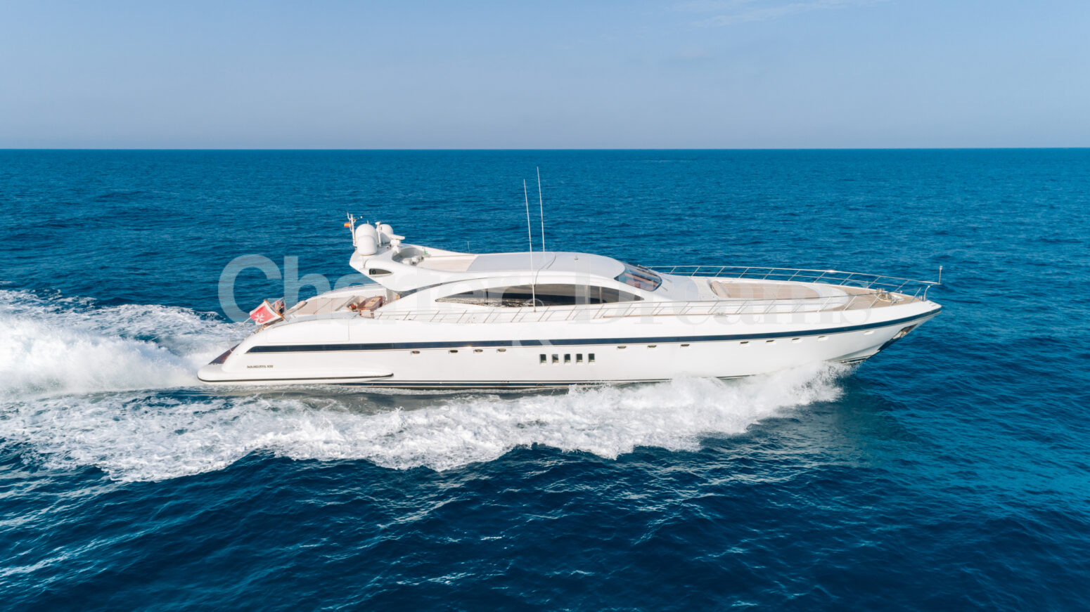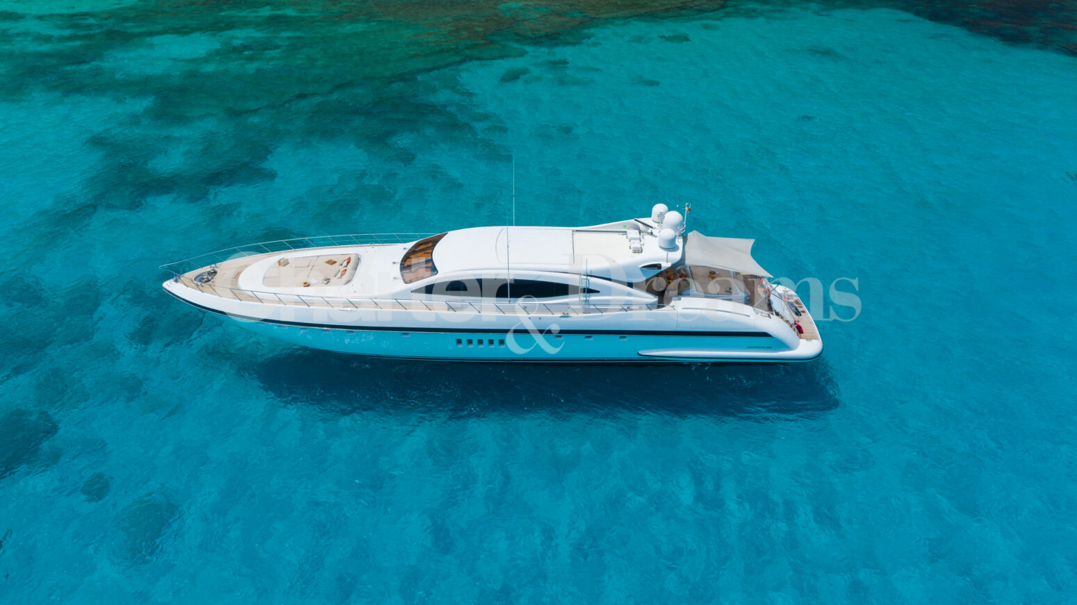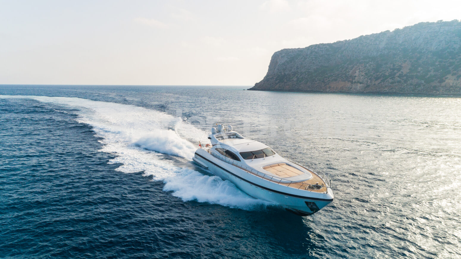 NOMAD es una Mangusta 108—33,50 m × 7,12 m—un yate open de alto rendimiento que combina líneas italianas con potencia real. Mantiene 28 nudos de crucero y alcanza 38 nudos gracias a dos MTU (2 × 2.775 CV); el giroscopio Seakeeper aporta estabilidad.