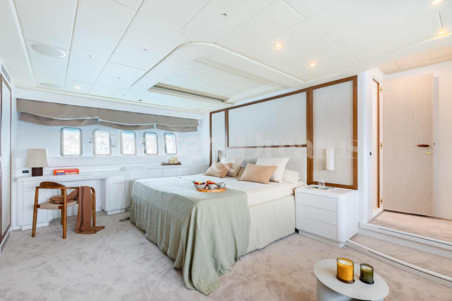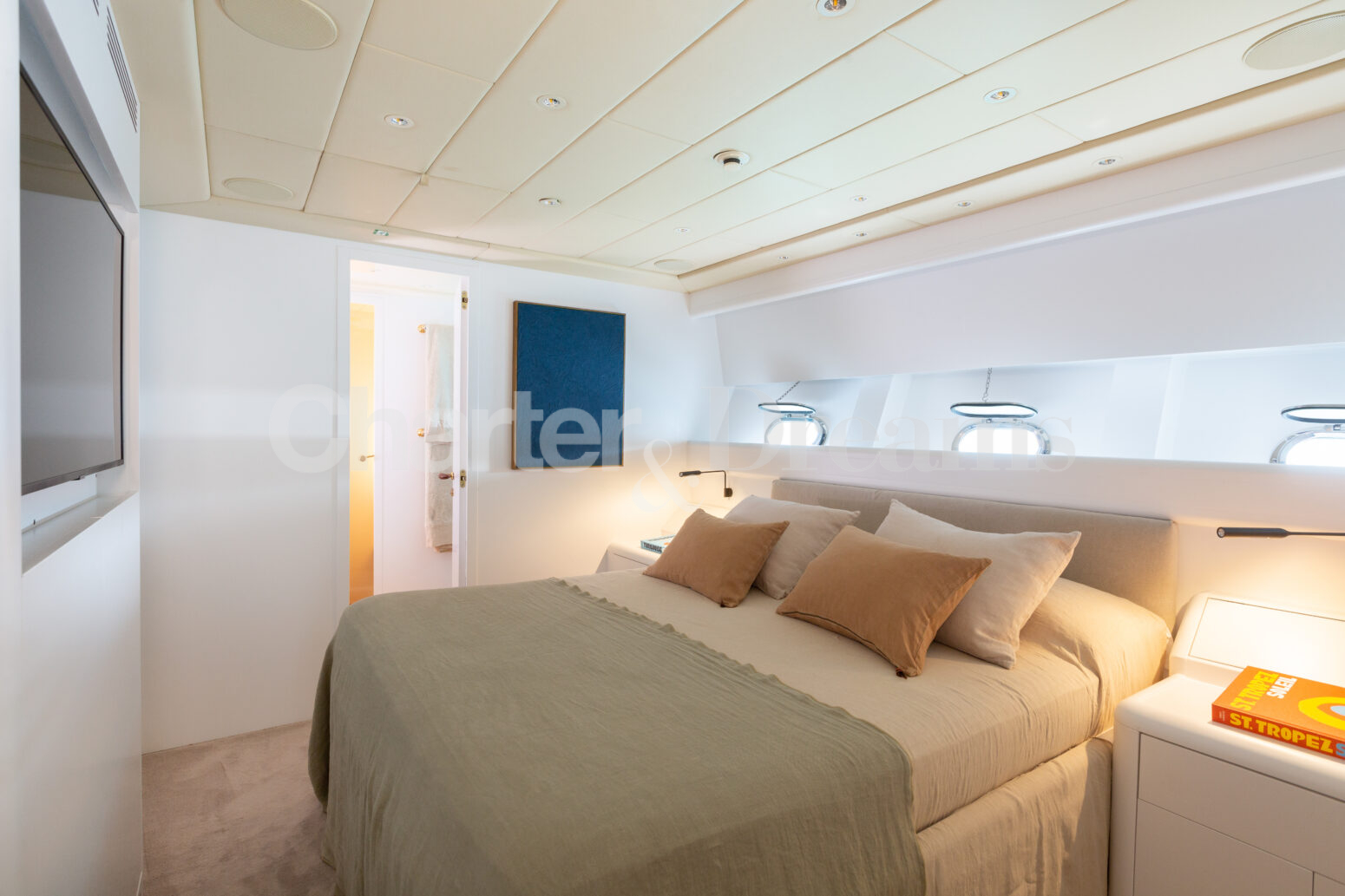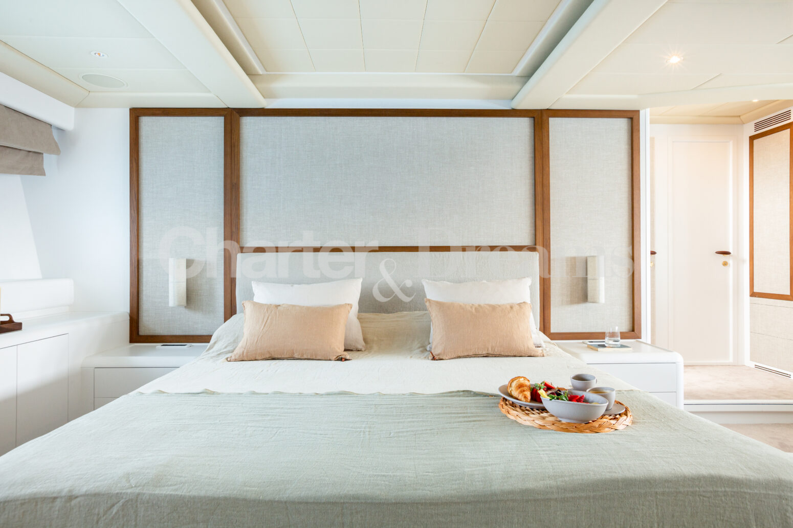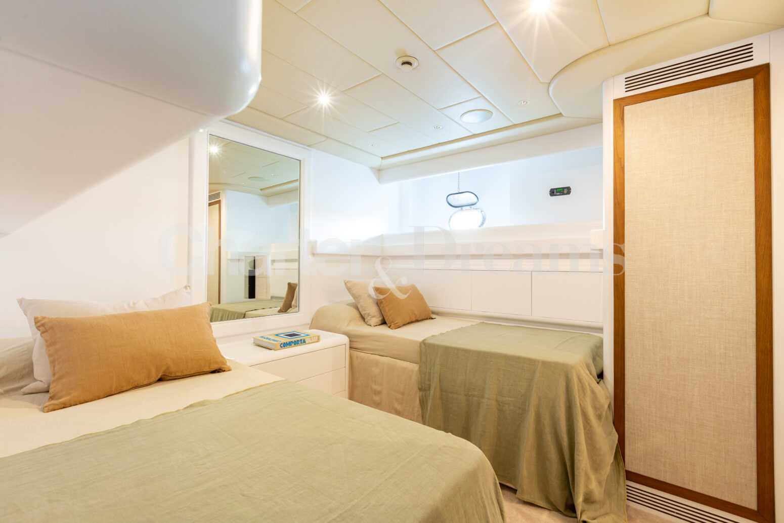 El alojamiento contempla 10 invitados en 4 cabinas con baño—master a toda manga, dos VIP dobles iguales y una twin con dos camas individuales más dos literas abatibles—además de aseo de día.