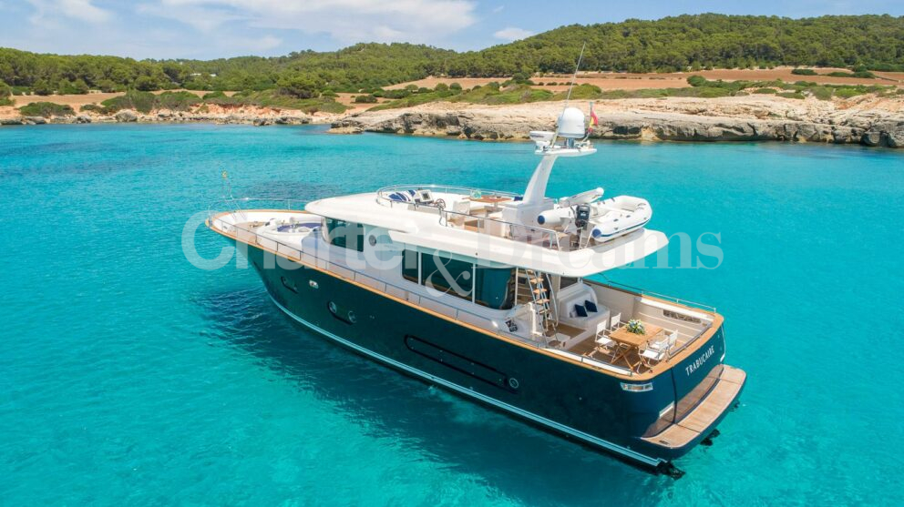 TRABUCAIRE es un yate con alma mediterránea. Este Maestro 65 de 20 metros, construido por el astillero italiano Apreamare, conserva la esencia de la navegación clásica sin renunciar a la tecnología moderna. Su elegante casco azul marino y sus acabados en madera evocan el auténtico espíritu marinero, ofreciendo una experiencia cálida, auténtica y refinada a quienes buscan disfrutar del mar con estilo.