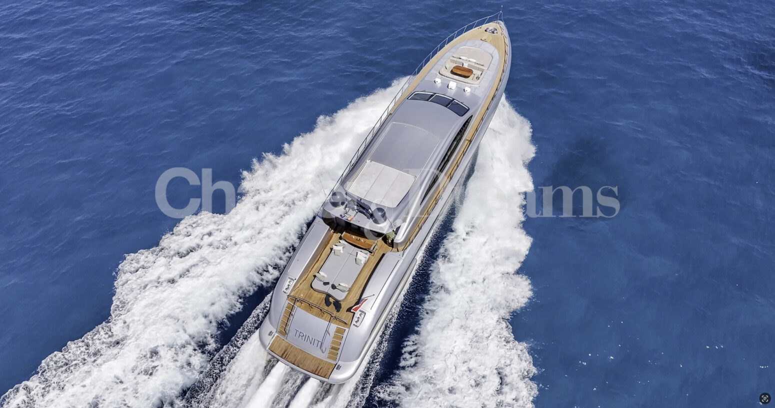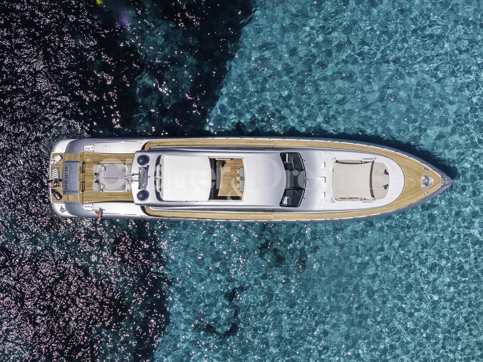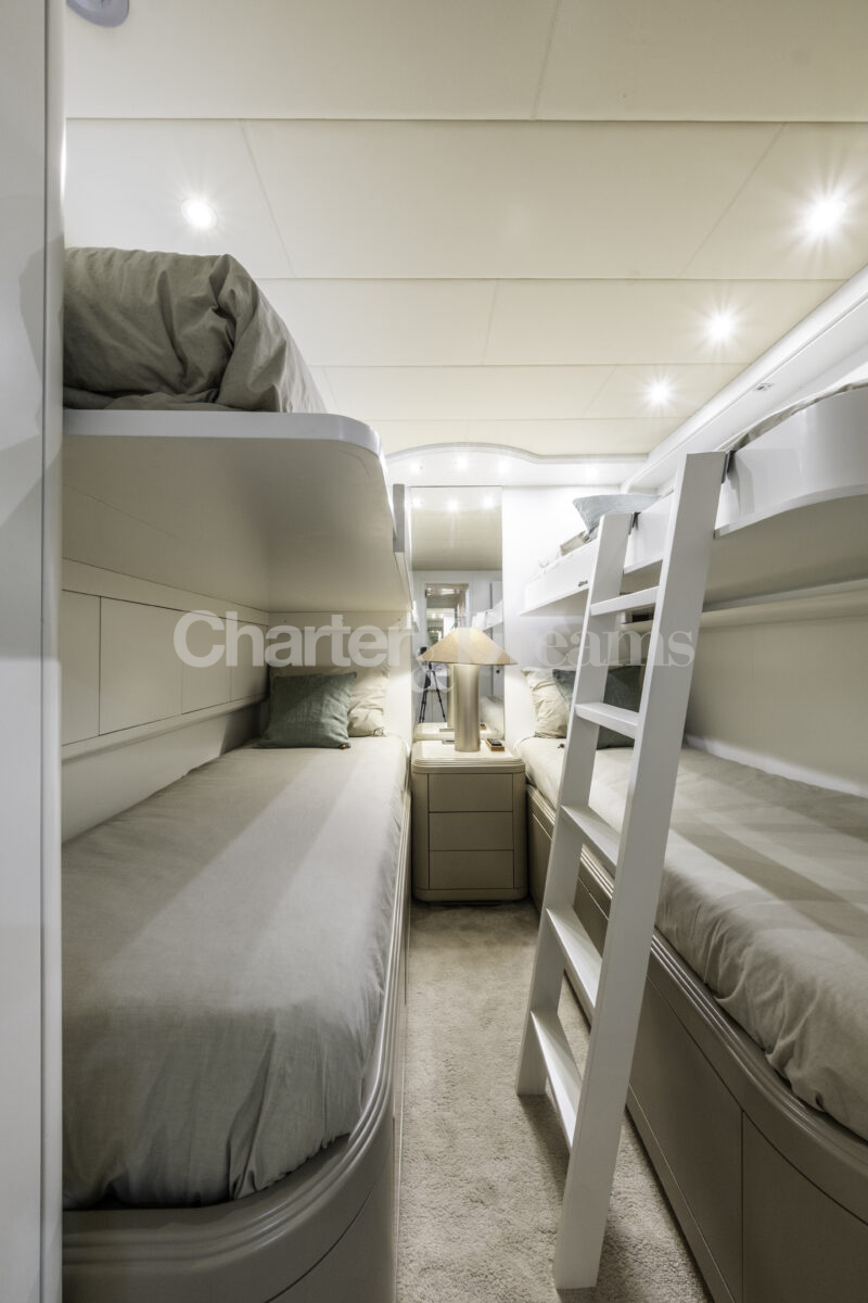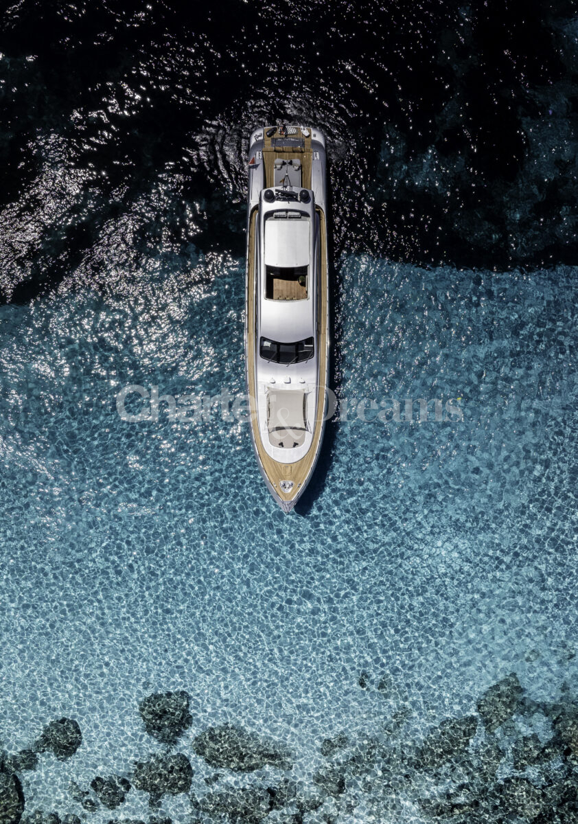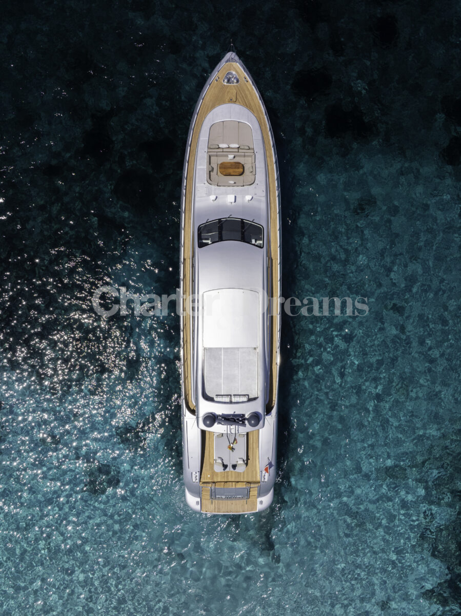 TRINITI ist eine Mangusta 108—33,50 m (108’) Open-Sportyacht, die italienisches Design mit hoher Performance verbindet. Reisegeschwindigkeit 28 Knoten, Spitze 38 Knoten, angetrieben von 2 × MTU (je 2.775 PS). Unter Deck gibt es fünf Kabinen mit Bad en suite für bis zu 12 Gäste: eine großzügige Master, zwei VIP-Doppelkabinen, eine Twin mit zwei Einzelbetten plus zwei Klappkojen sowie eine Einzelkabine mit Etagenbett.