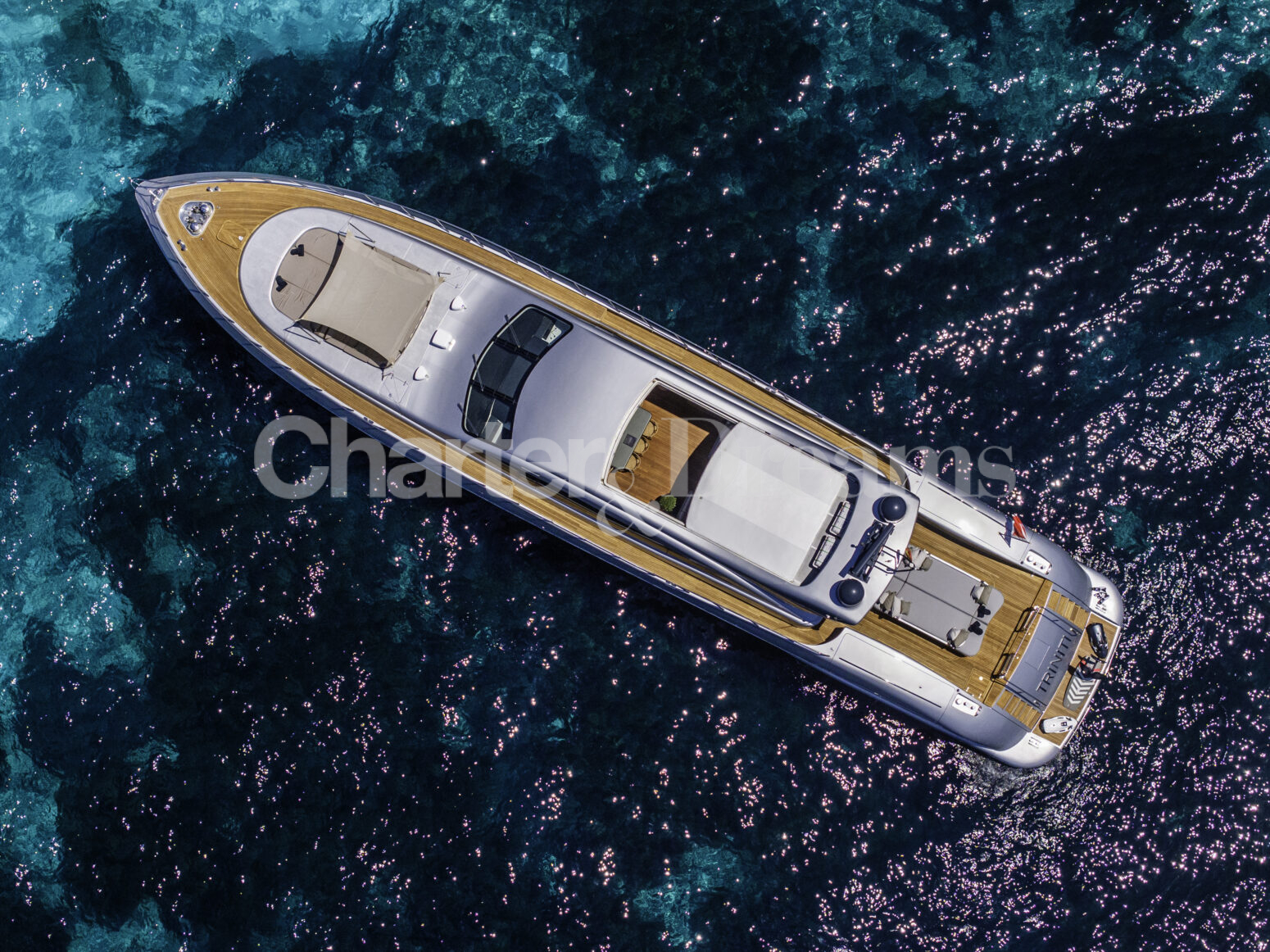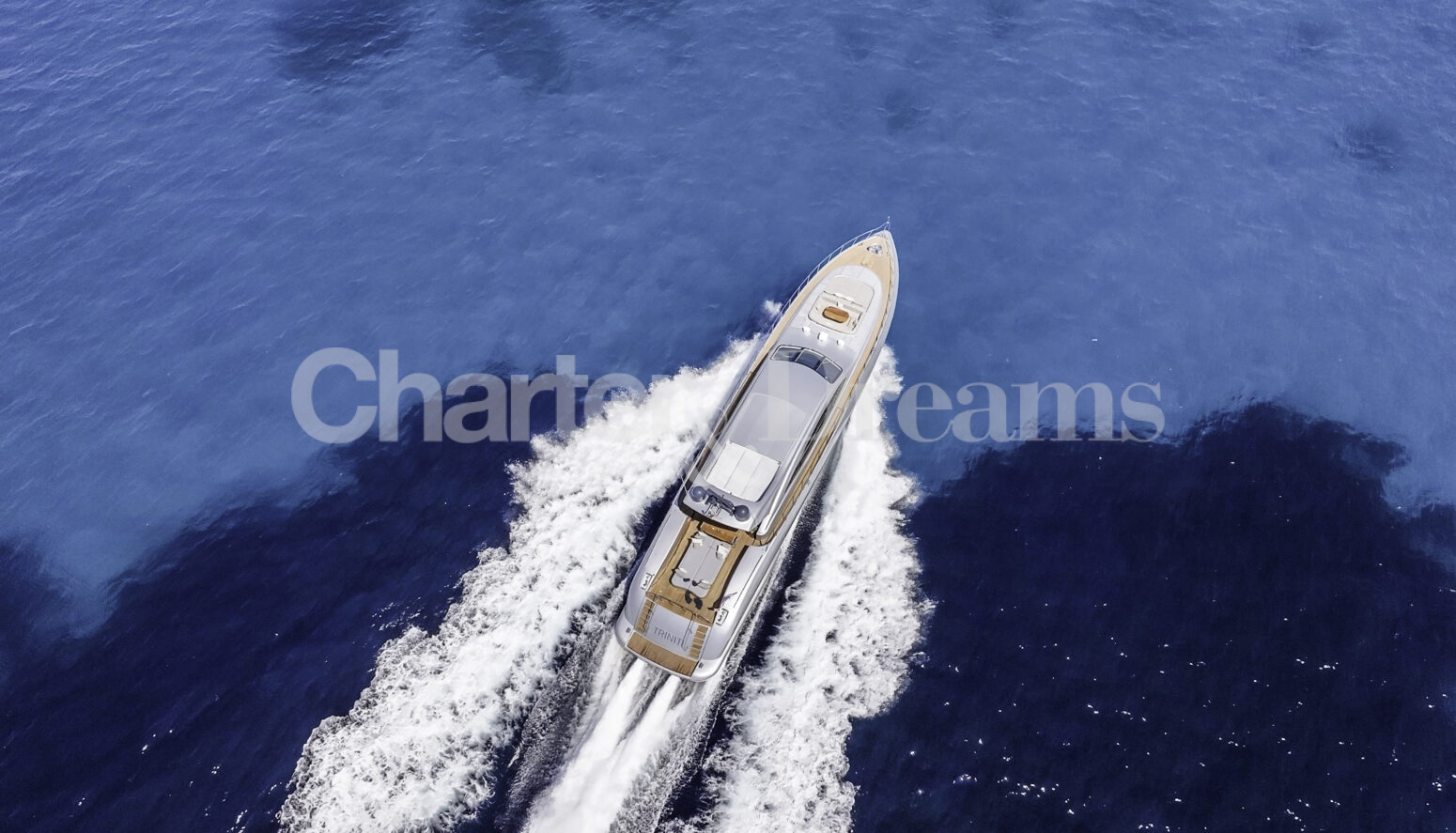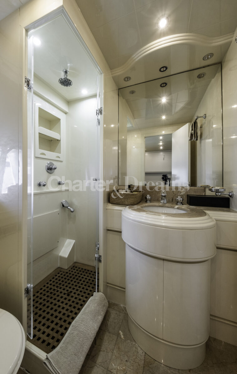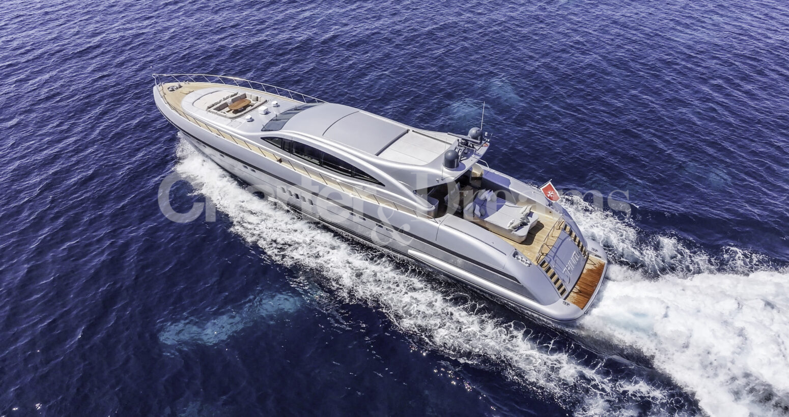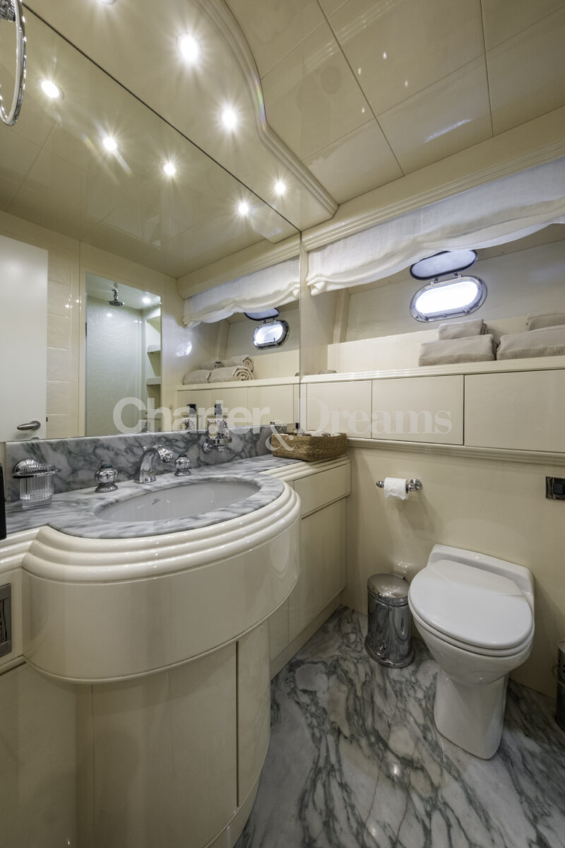 TRINITI ist eine Mangusta 108—33,50 m (108’) Open-Sportyacht, die italienisches Design mit hoher Performance verbindet. Reisegeschwindigkeit 28 Knoten, Spitze 38 Knoten, angetrieben von 2 × MTU (je 2.775 PS). Unter Deck gibt es fünf Kabinen mit Bad en suite für bis zu 12 Gäste: eine großzügige Master, zwei VIP-Doppelkabinen, eine Twin mit zwei Einzelbetten plus zwei Klappkojen sowie eine Einzelkabine mit Etagenbett.