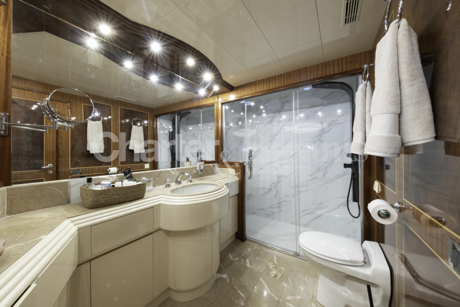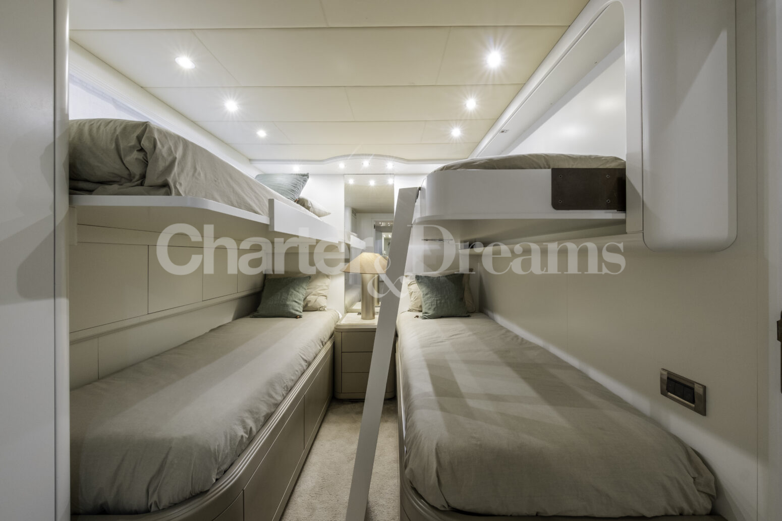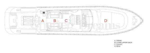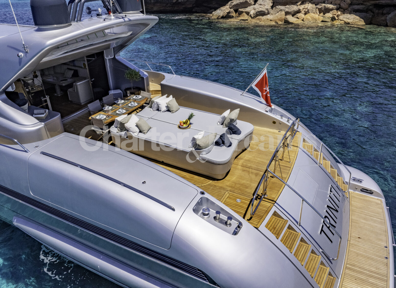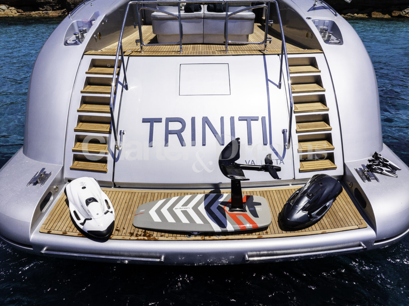 TRINITI ist eine Mangusta 108—33,50 m (108’) Open-Sportyacht, die italienisches Design mit hoher Performance verbindet. Reisegeschwindigkeit 28 Knoten, Spitze 38 Knoten, angetrieben von 2 × MTU (je 2.775 PS). Unter Deck gibt es fünf Kabinen mit Bad en suite für bis zu 12 Gäste: eine großzügige Master, zwei VIP-Doppelkabinen, eine Twin mit zwei Einzelbetten plus zwei Klappkojen sowie eine Einzelkabine mit Etagenbett.