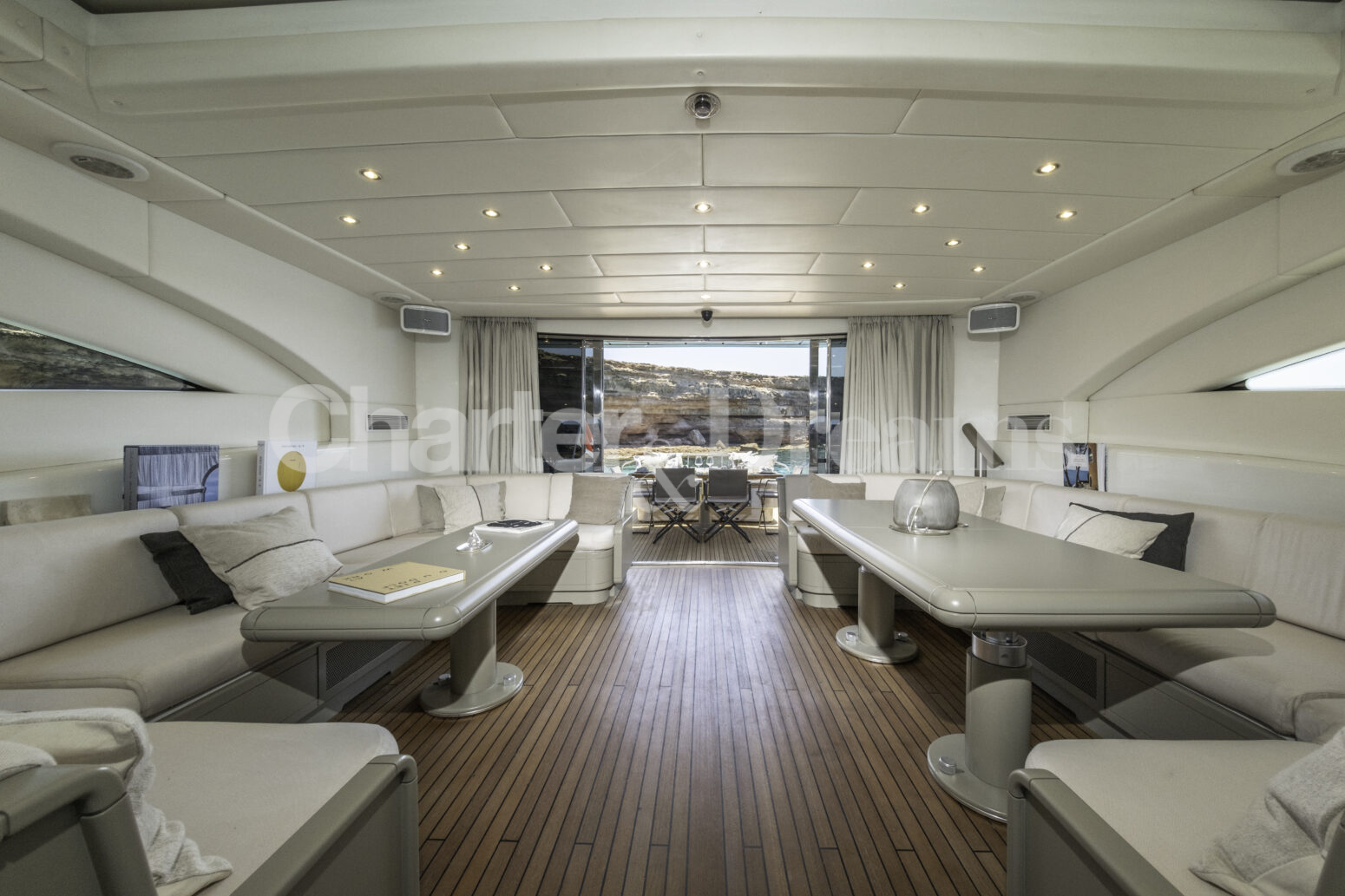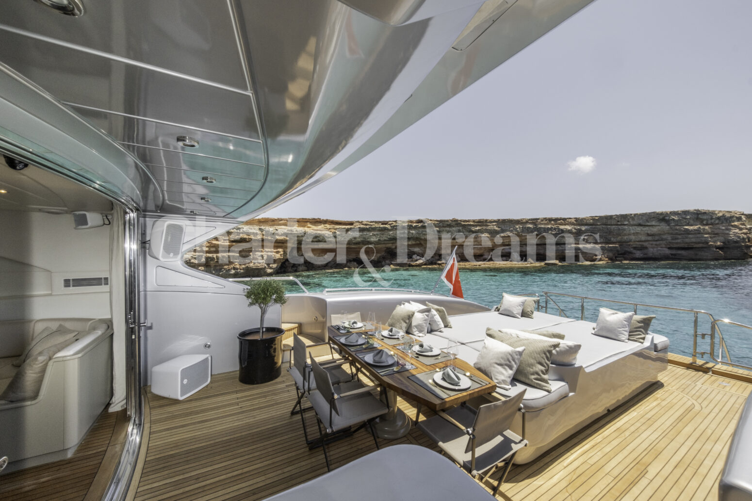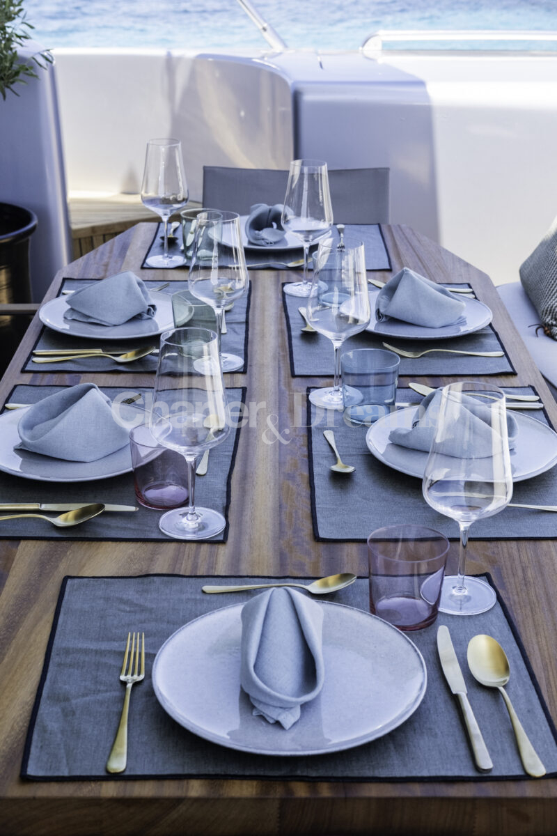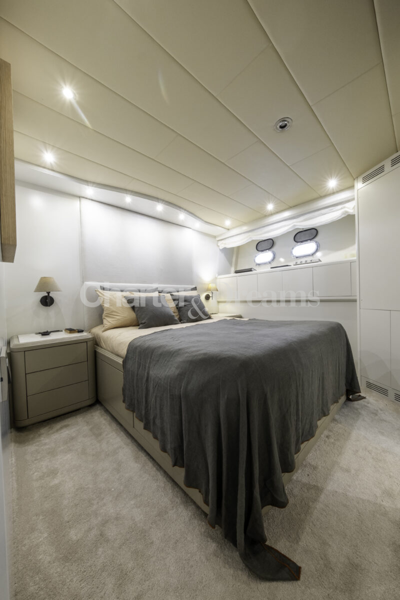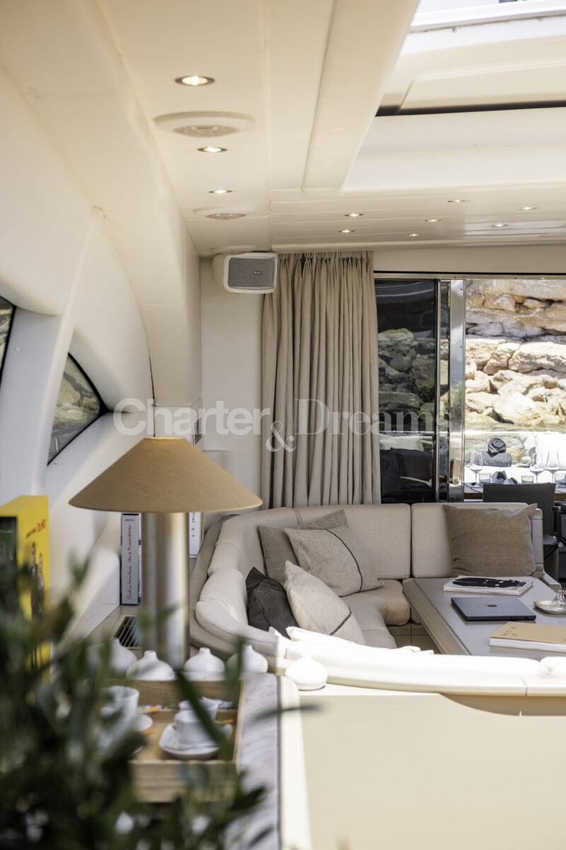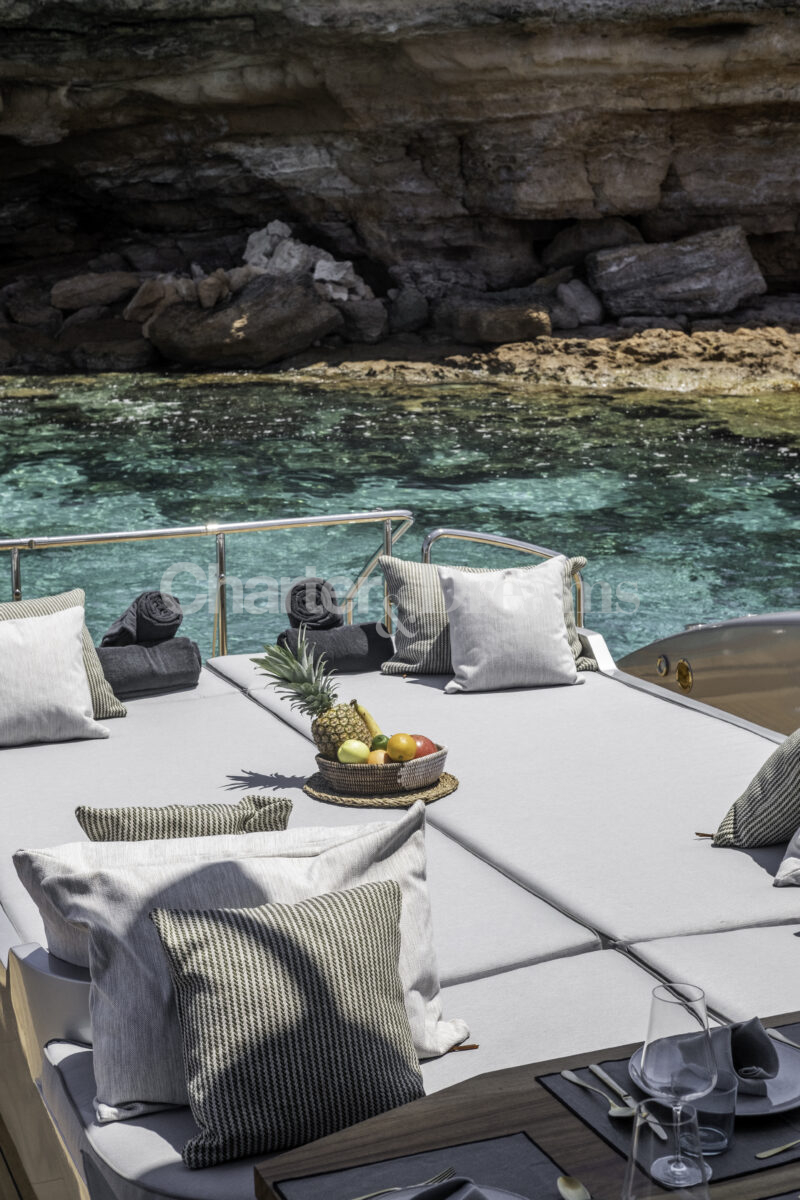 Im Hauptdeck-Salon liegt der Esstisch vorn und die Lounge achtern; zusätzlich steht auf dem Unterdeck ein zweiter, gemütlicher Loungebereich bereit. Draußen bietet das Vorschiff eine große Sonnenliege mit Sitzgruppe und Tisch, achtern wartet ein breites Sunpad für entspannte Stunden. Zur Ausstattung zählen Starlink-Internet, zonenweises Audiosystem, komplette Klimatisierung sowie einziehbare Sonnensegel vorn und hinten. Kapitän, Koch und zwei Crew sorgen ab Marina Ibiza für einen reibungslosen Ablauf.