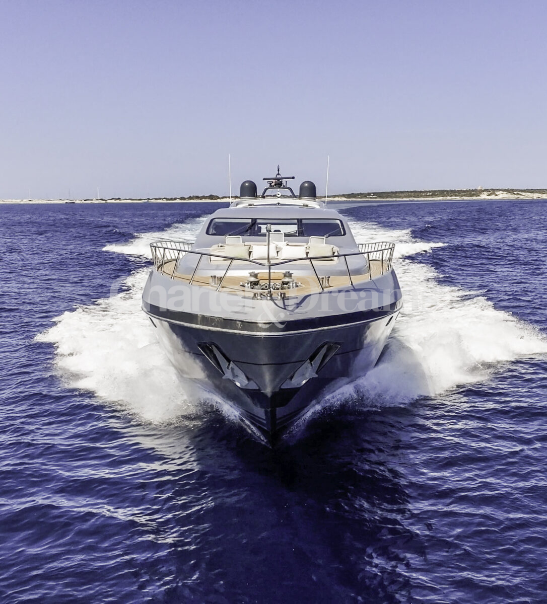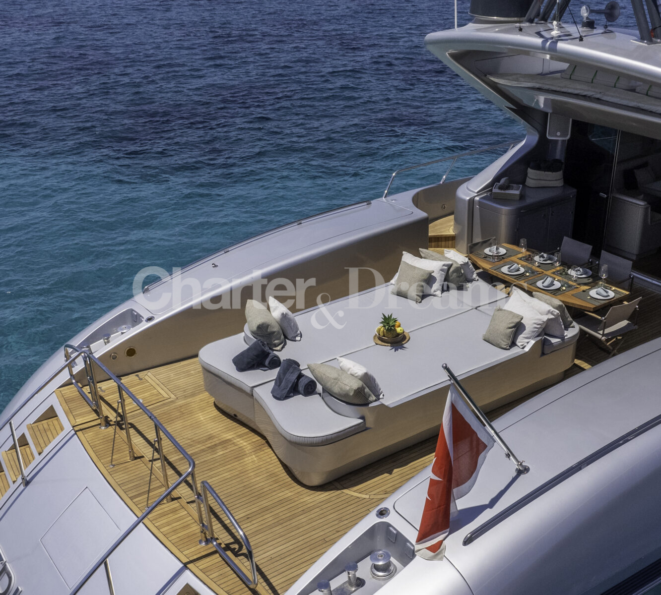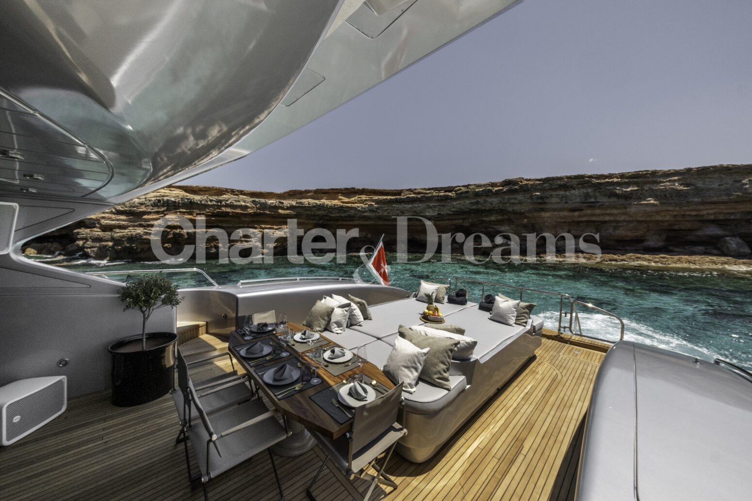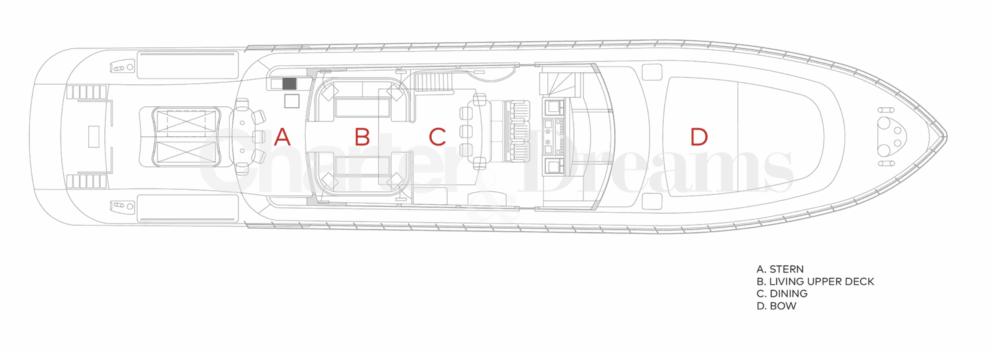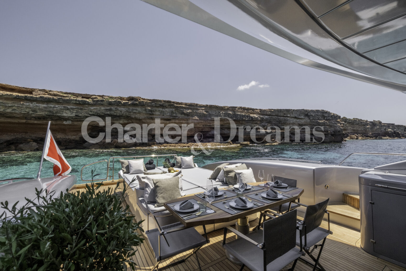 Im Hauptdeck-Salon liegt der Esstisch vorn und die Lounge achtern; zusätzlich steht auf dem Unterdeck ein zweiter, gemütlicher Loungebereich bereit. Draußen bietet das Vorschiff eine große Sonnenliege mit Sitzgruppe und Tisch, achtern wartet ein breites Sunpad für entspannte Stunden. Zur Ausstattung zählen Starlink-Internet, zonenweises Audiosystem, komplette Klimatisierung sowie einziehbare Sonnensegel vorn und hinten. Kapitän, Koch und zwei Crew sorgen ab Marina Ibiza für einen reibungslosen Ablauf.