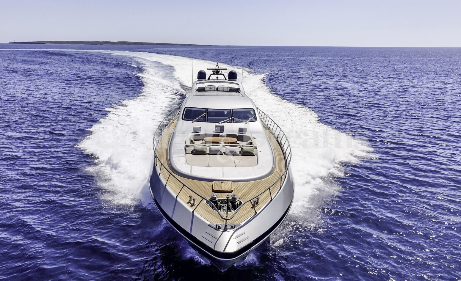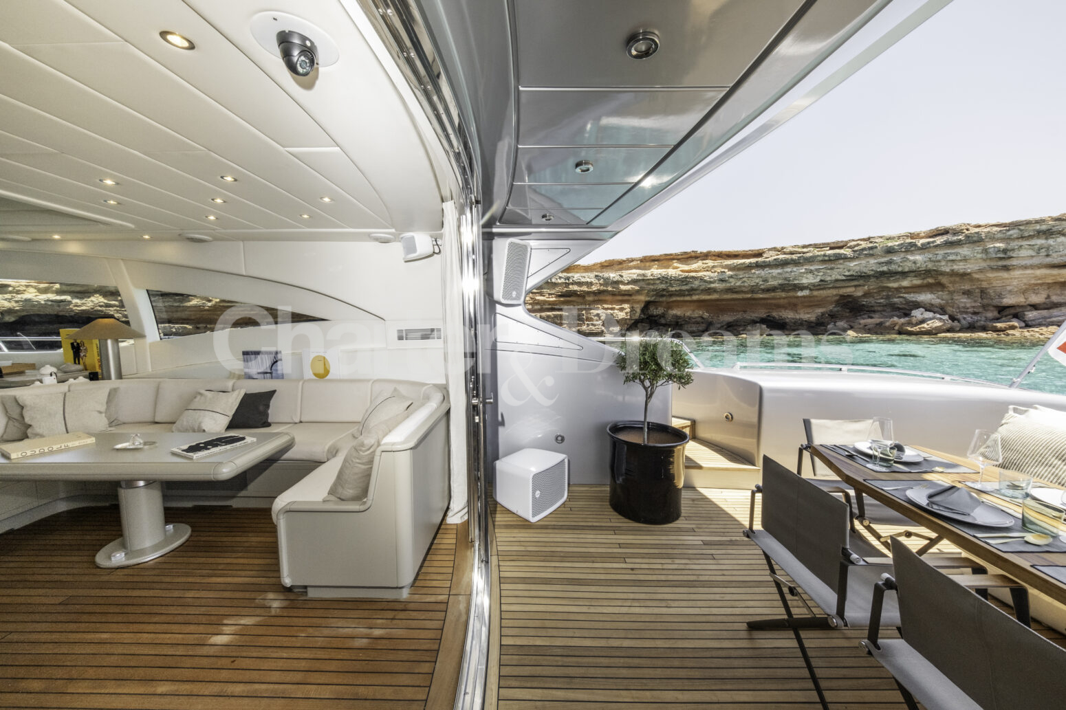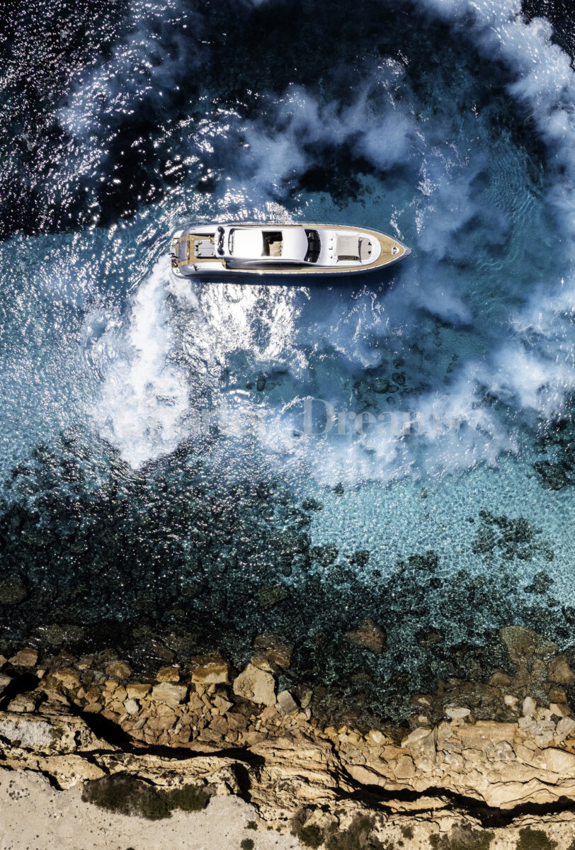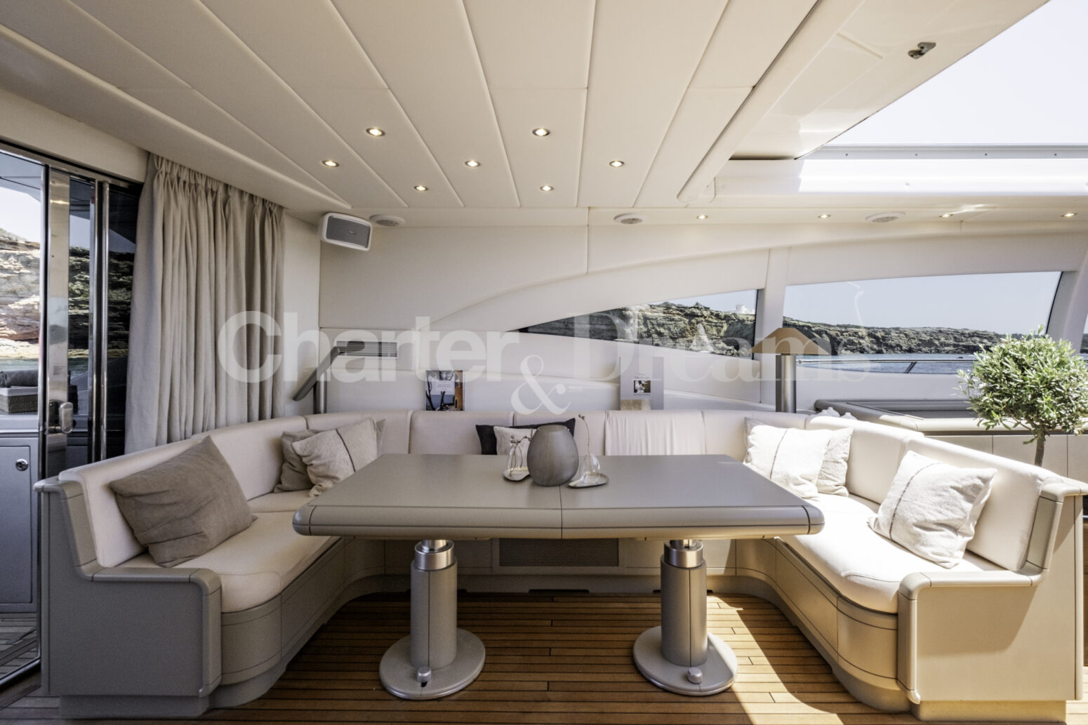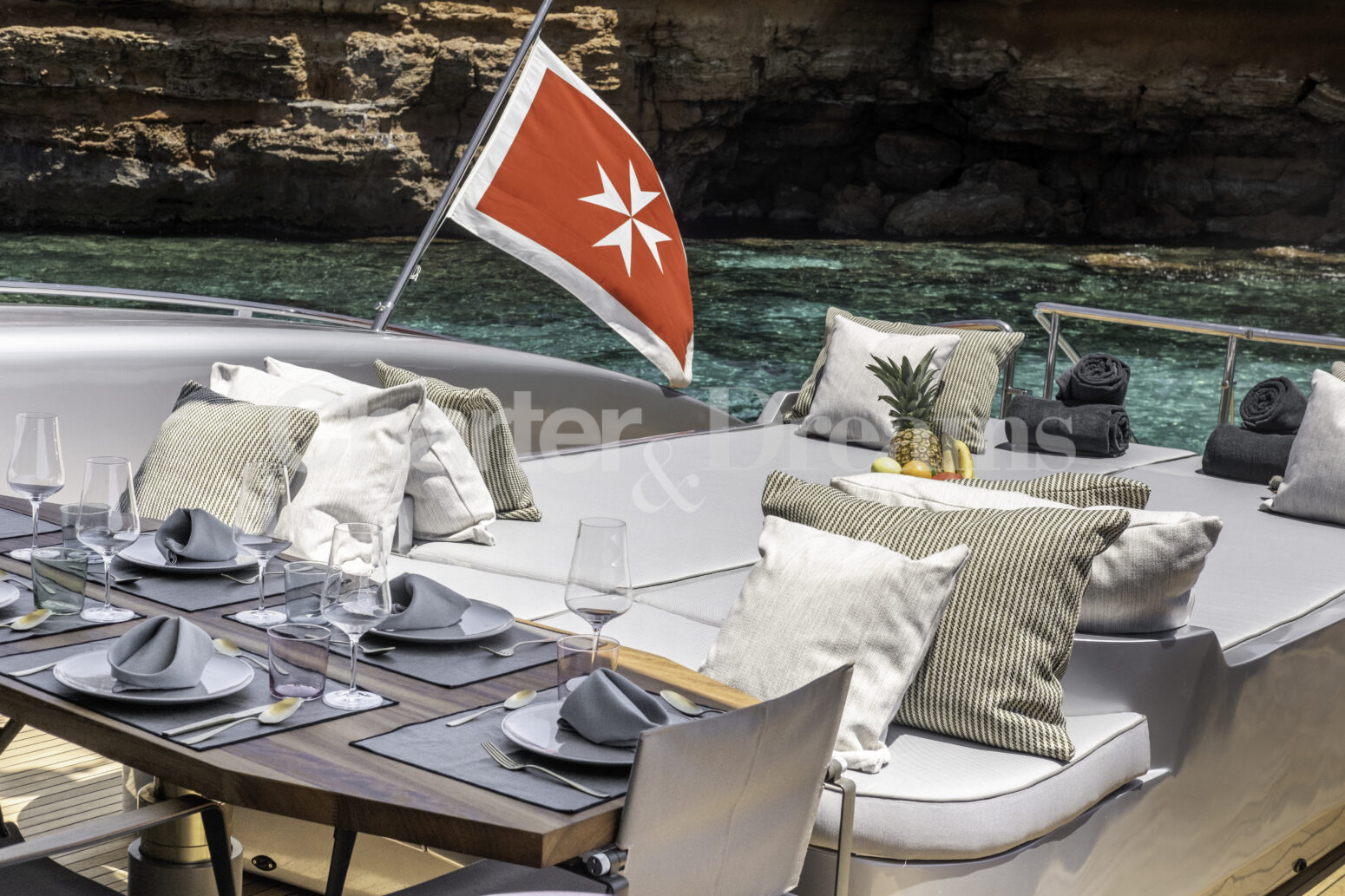 Im Hauptdeck-Salon liegt der Esstisch vorn und die Lounge achtern; zusätzlich steht auf dem Unterdeck ein zweiter, gemütlicher Loungebereich bereit. Draußen bietet das Vorschiff eine große Sonnenliege mit Sitzgruppe und Tisch, achtern wartet ein breites Sunpad für entspannte Stunden. Zur Ausstattung zählen Starlink-Internet, zonenweises Audiosystem, komplette Klimatisierung sowie einziehbare Sonnensegel vorn und hinten. Kapitän, Koch und zwei Crew sorgen ab Marina Ibiza für einen reibungslosen Ablauf.