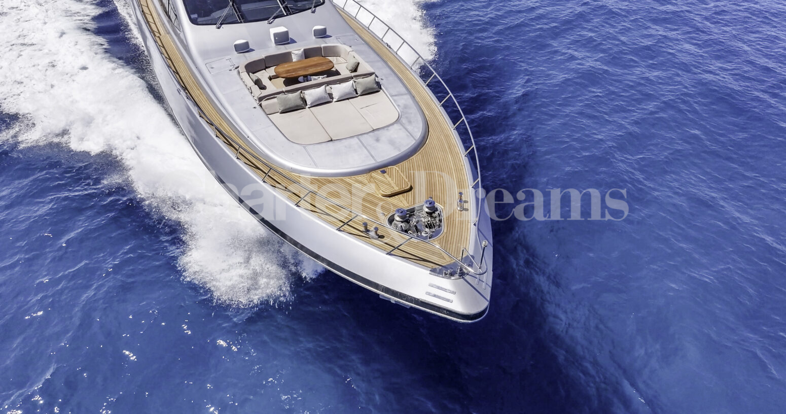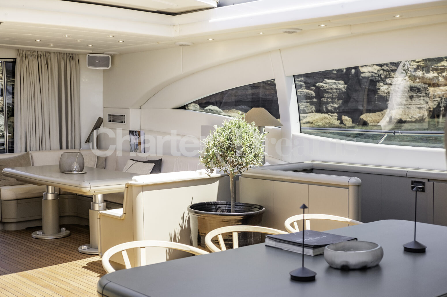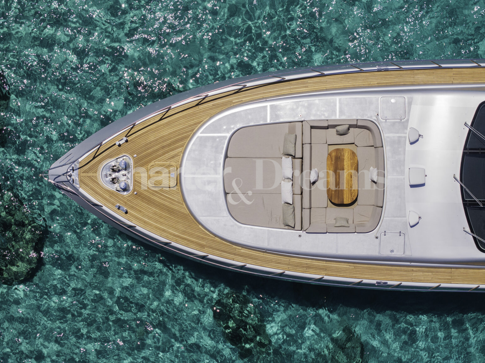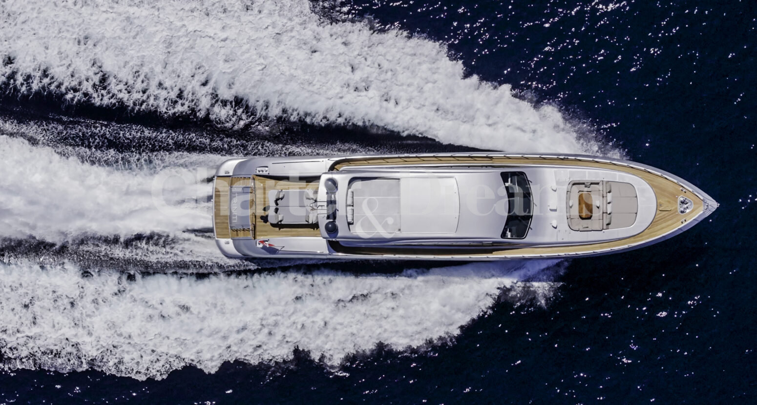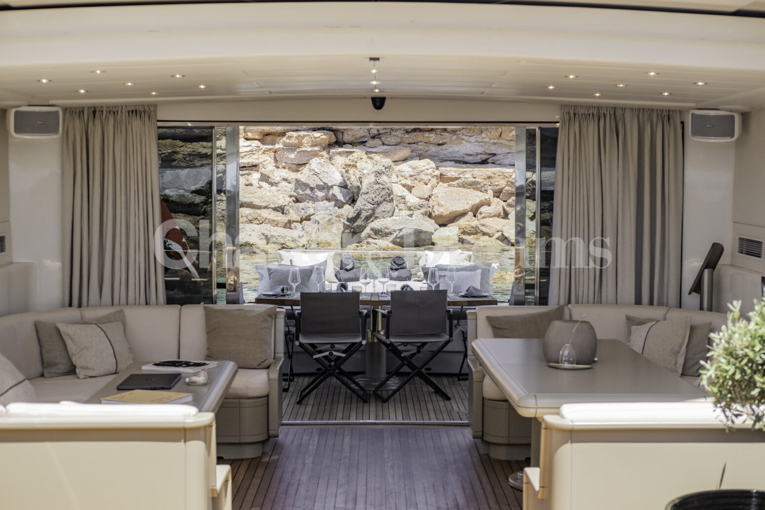 Im Hauptdeck-Salon liegt der Esstisch vorn und die Lounge achtern; zusätzlich steht auf dem Unterdeck ein zweiter, gemütlicher Loungebereich bereit. Draußen bietet das Vorschiff eine große Sonnenliege mit Sitzgruppe und Tisch, achtern wartet ein breites Sunpad für entspannte Stunden. Zur Ausstattung zählen Starlink-Internet, zonenweises Audiosystem, komplette Klimatisierung sowie einziehbare Sonnensegel vorn und hinten. Kapitän, Koch und zwei Crew sorgen ab Marina Ibiza für einen reibungslosen Ablauf.