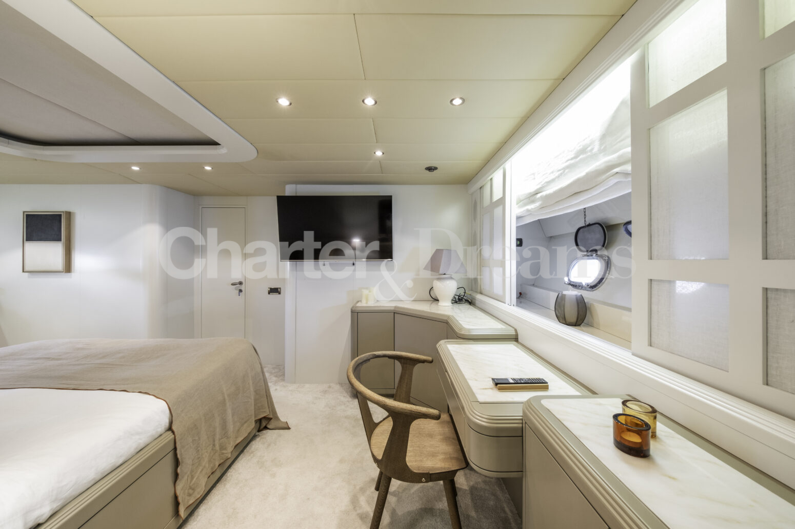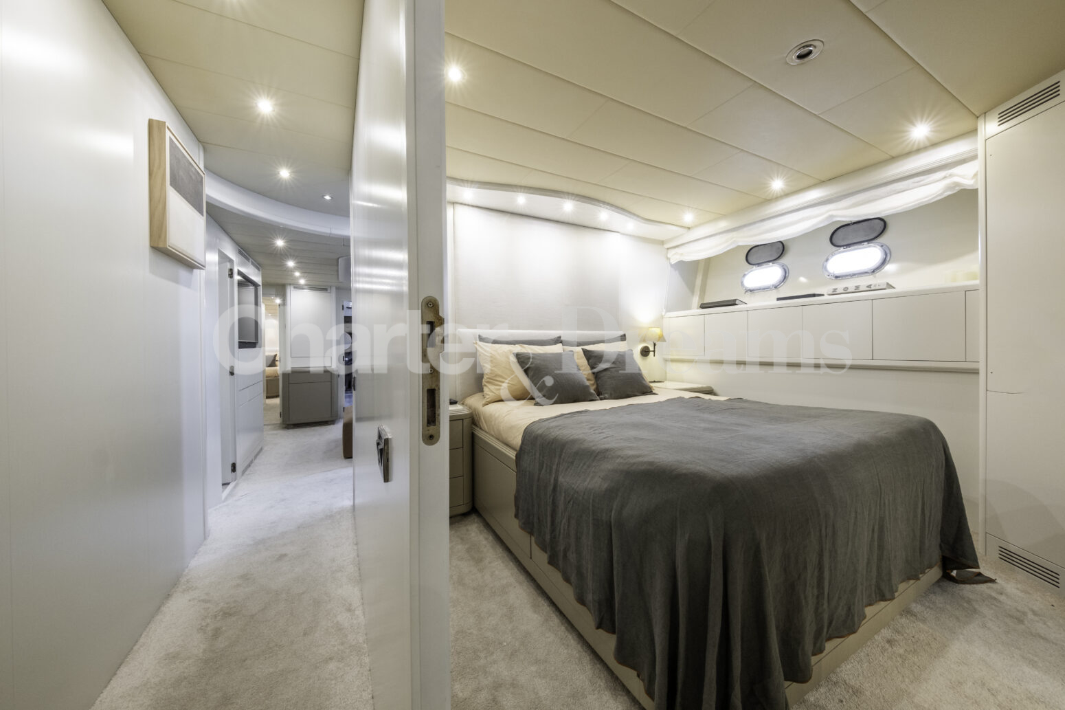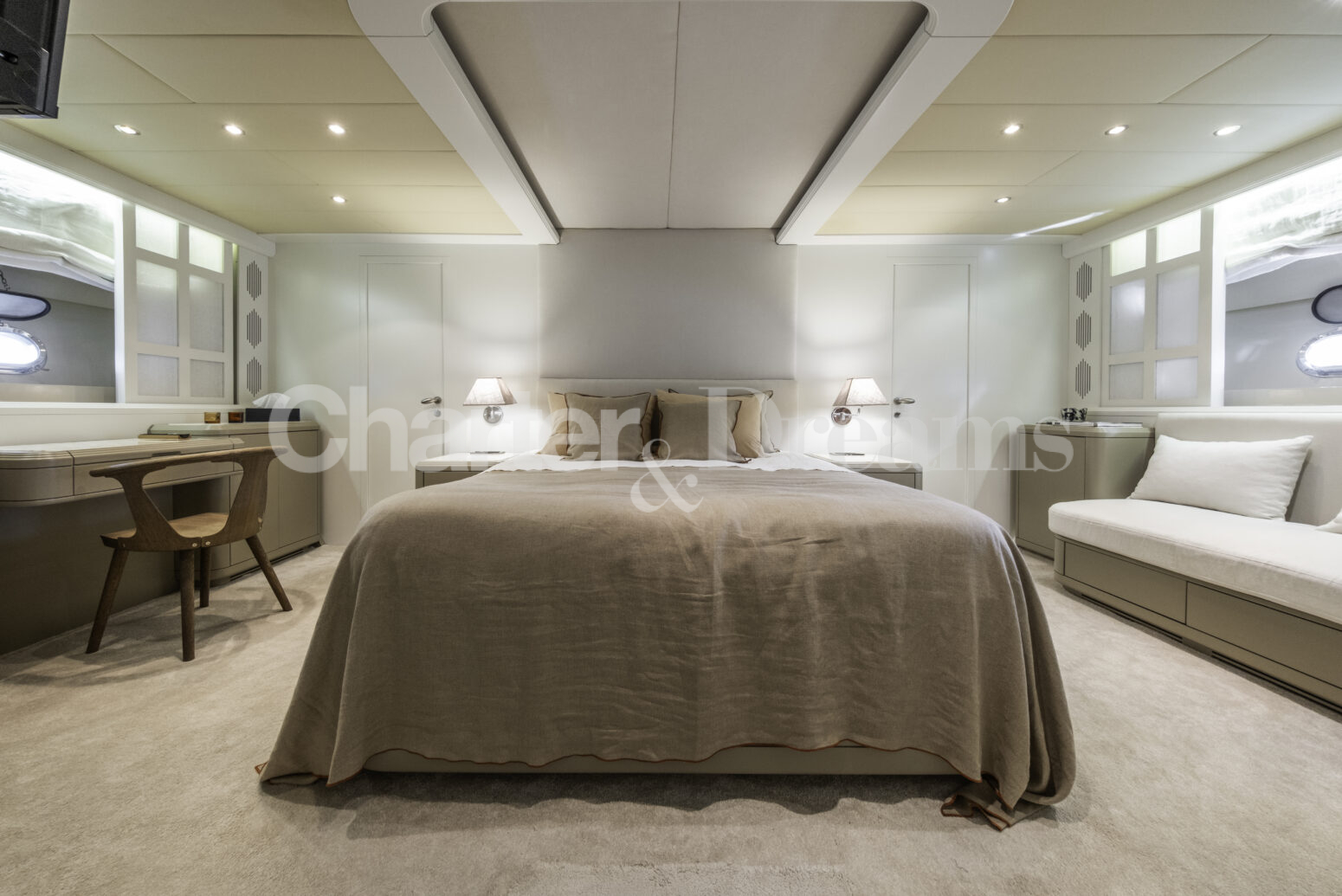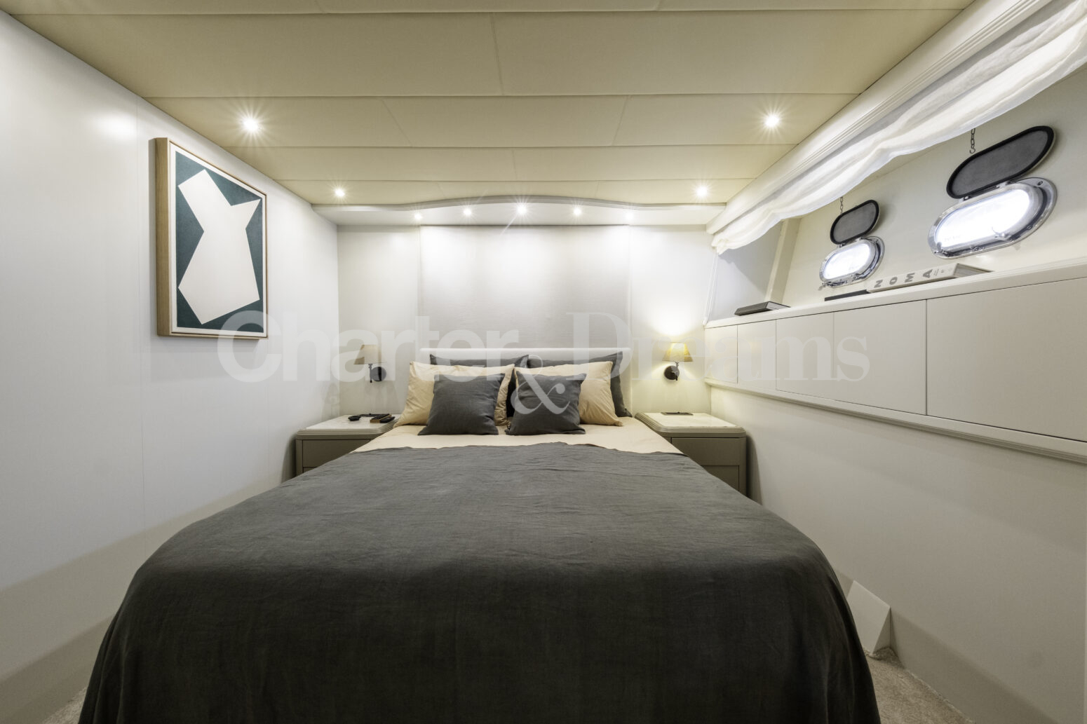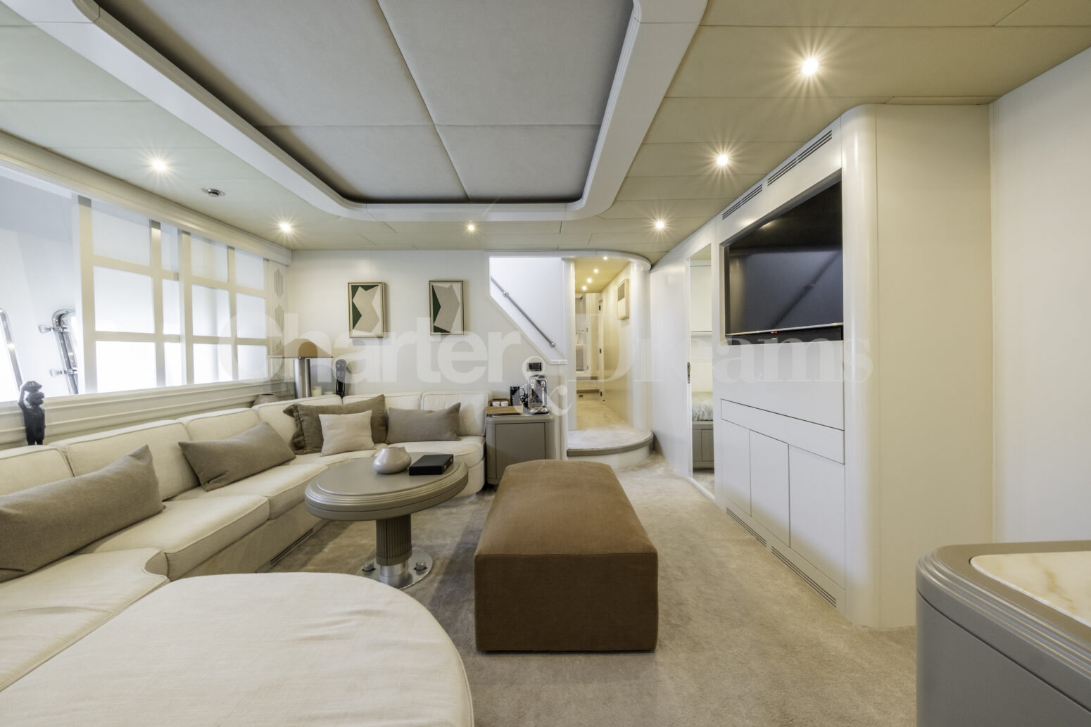 Im Hauptdeck-Salon liegt der Esstisch vorn und die Lounge achtern; zusätzlich steht auf dem Unterdeck ein zweiter, gemütlicher Loungebereich bereit. Draußen bietet das Vorschiff eine große Sonnenliege mit Sitzgruppe und Tisch, achtern wartet ein breites Sunpad für entspannte Stunden. Zur Ausstattung zählen Starlink-Internet, zonenweises Audiosystem, komplette Klimatisierung sowie einziehbare Sonnensegel vorn und hinten. Kapitän, Koch und zwei Crew sorgen ab Marina Ibiza für einen reibungslosen Ablauf.