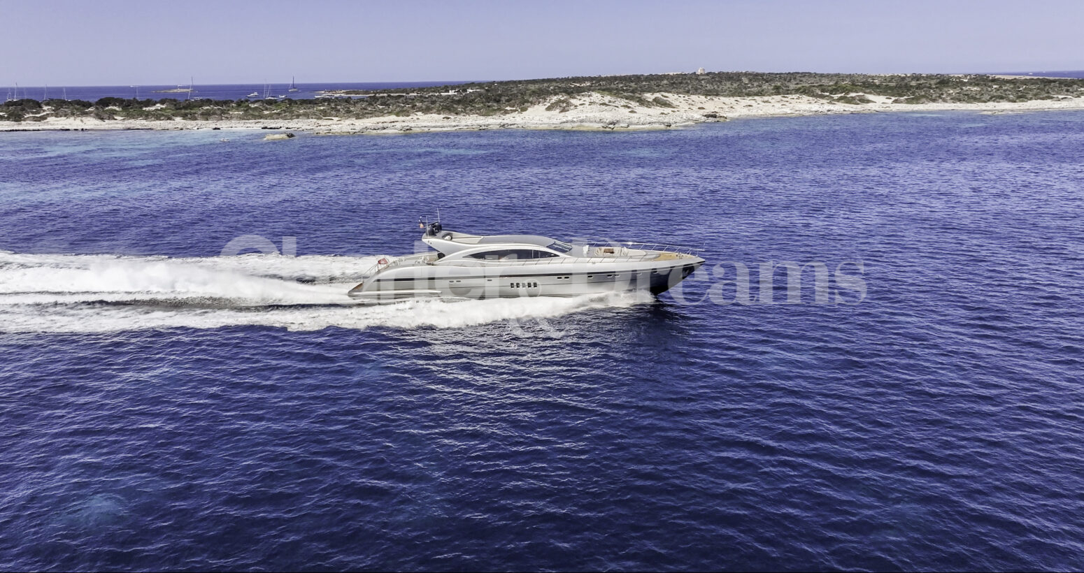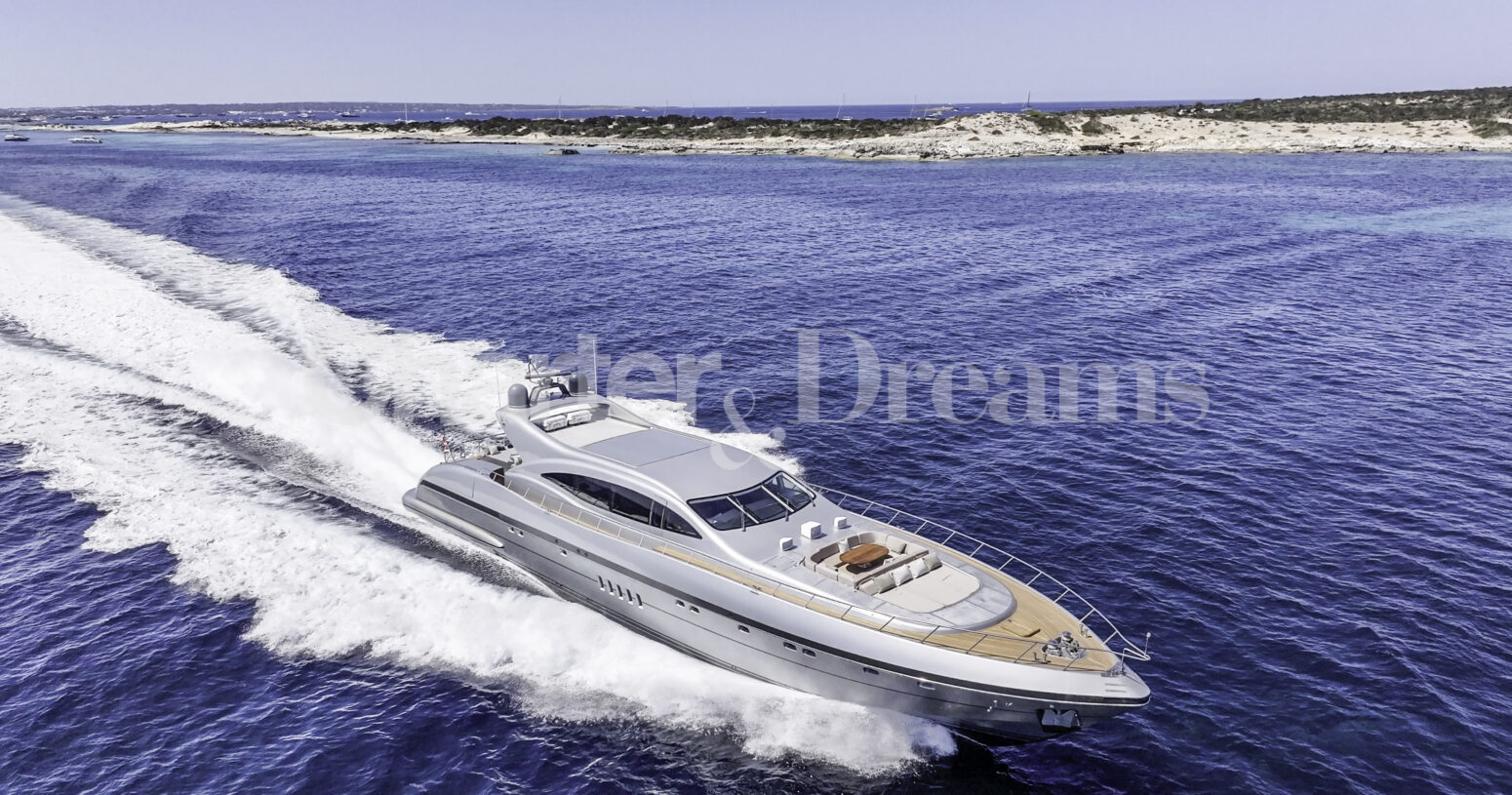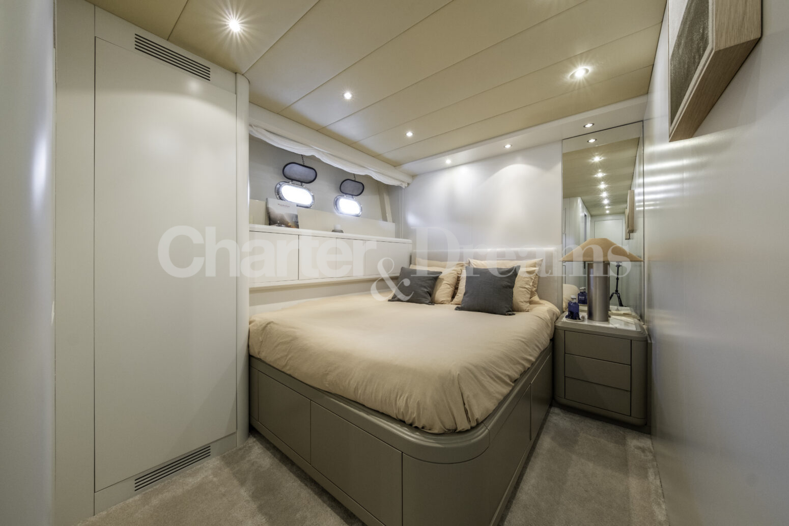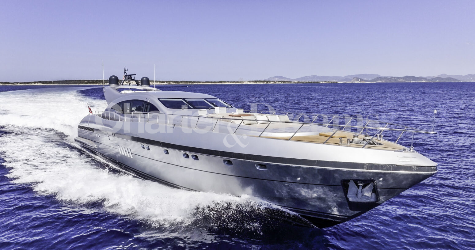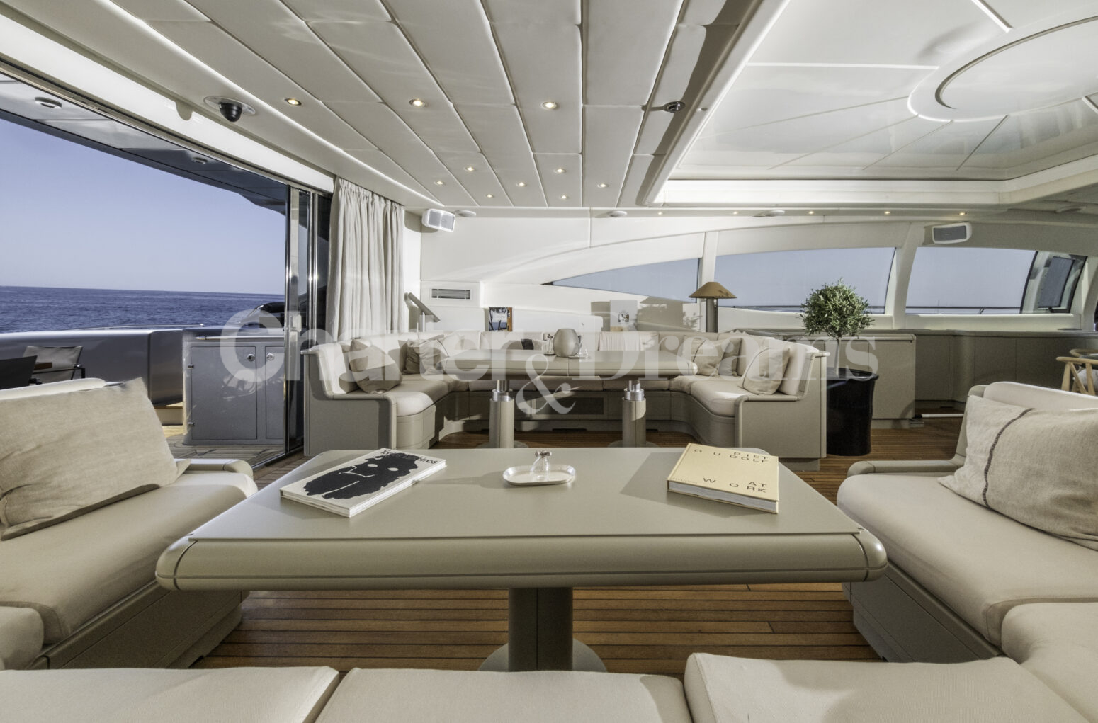 Im Hauptdeck-Salon liegt der Esstisch vorn und die Lounge achtern; zusätzlich steht auf dem Unterdeck ein zweiter, gemütlicher Loungebereich bereit. Draußen bietet das Vorschiff eine große Sonnenliege mit Sitzgruppe und Tisch, achtern wartet ein breites Sunpad für entspannte Stunden. Zur Ausstattung zählen Starlink-Internet, zonenweises Audiosystem, komplette Klimatisierung sowie einziehbare Sonnensegel vorn und hinten. Kapitän, Koch und zwei Crew sorgen ab Marina Ibiza für einen reibungslosen Ablauf.