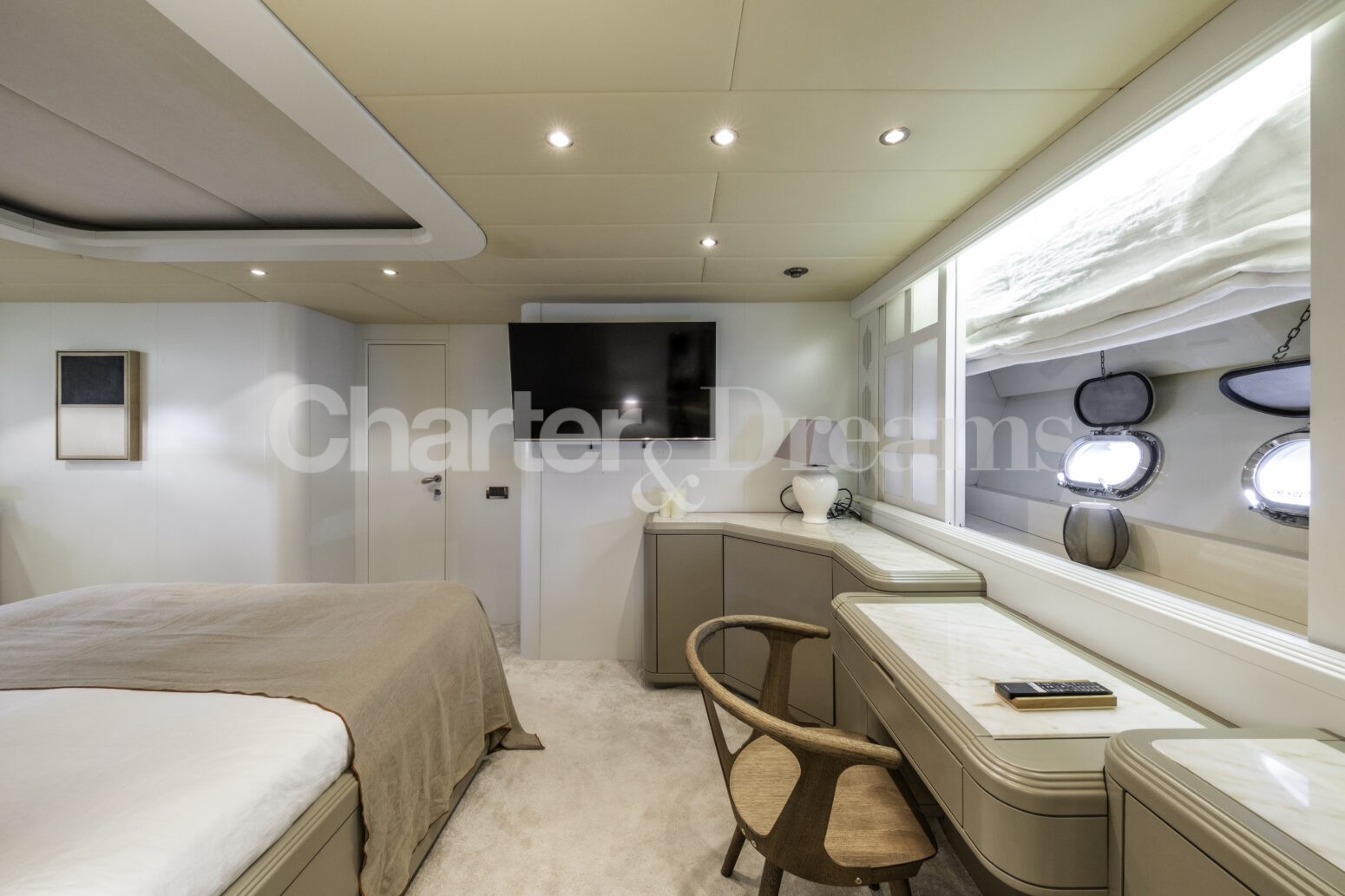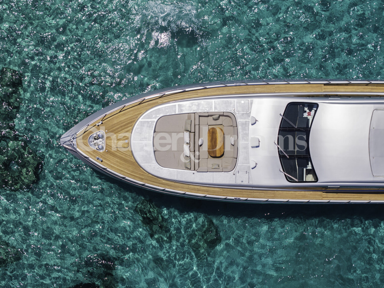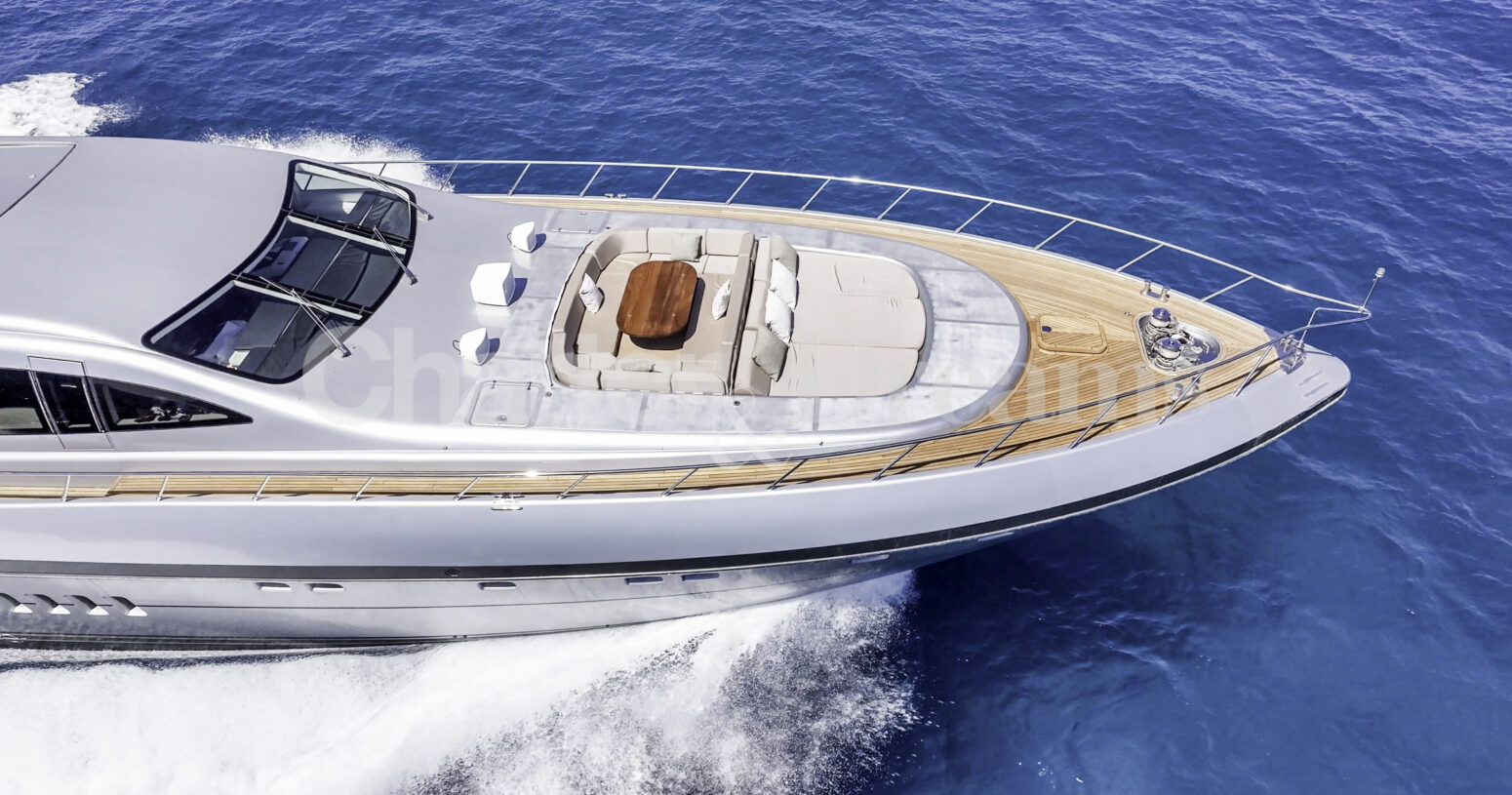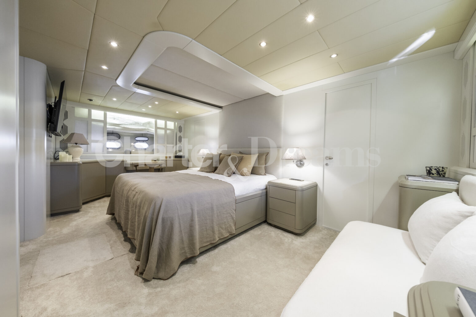 Im Hauptdeck-Salon liegt der Esstisch vorn und die Lounge achtern; zusätzlich steht auf dem Unterdeck ein zweiter, gemütlicher Loungebereich bereit. Draußen bietet das Vorschiff eine große Sonnenliege mit Sitzgruppe und Tisch, achtern wartet ein breites Sunpad für entspannte Stunden. Zur Ausstattung zählen Starlink-Internet, zonenweises Audiosystem, komplette Klimatisierung sowie einziehbare Sonnensegel vorn und hinten. Kapitän, Koch und zwei Crew sorgen ab Marina Ibiza für einen reibungslosen Ablauf.