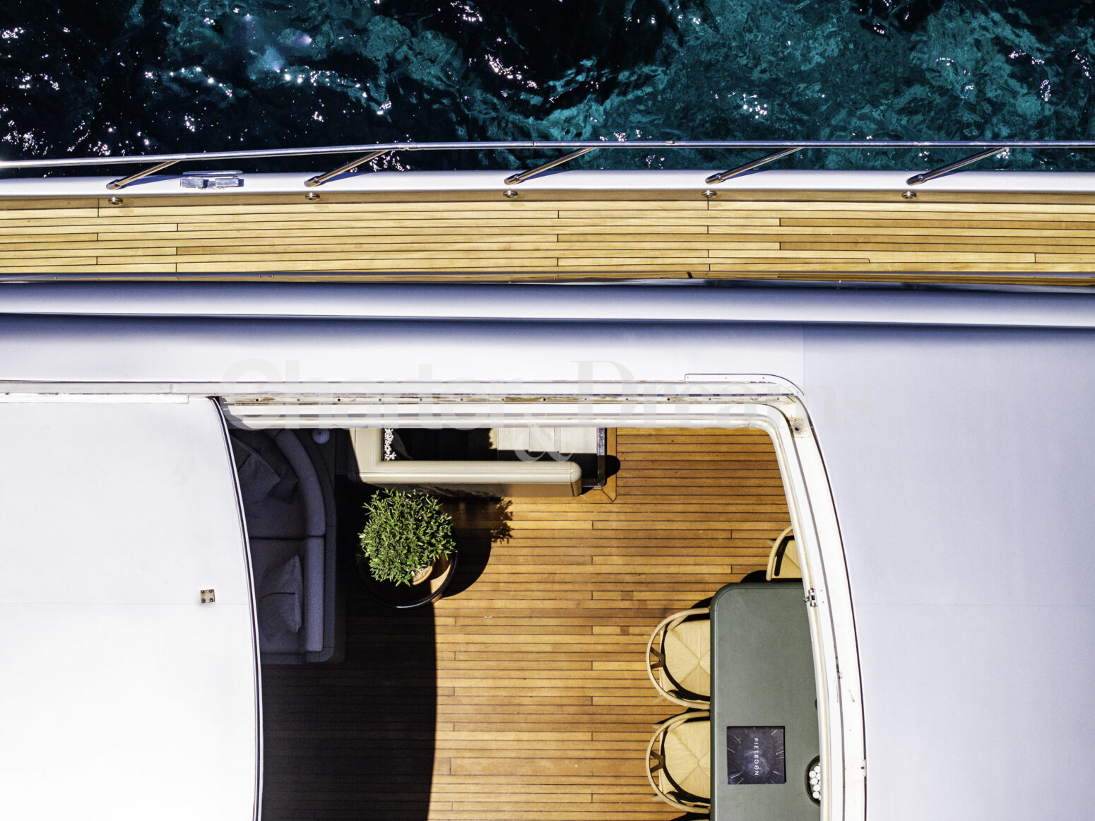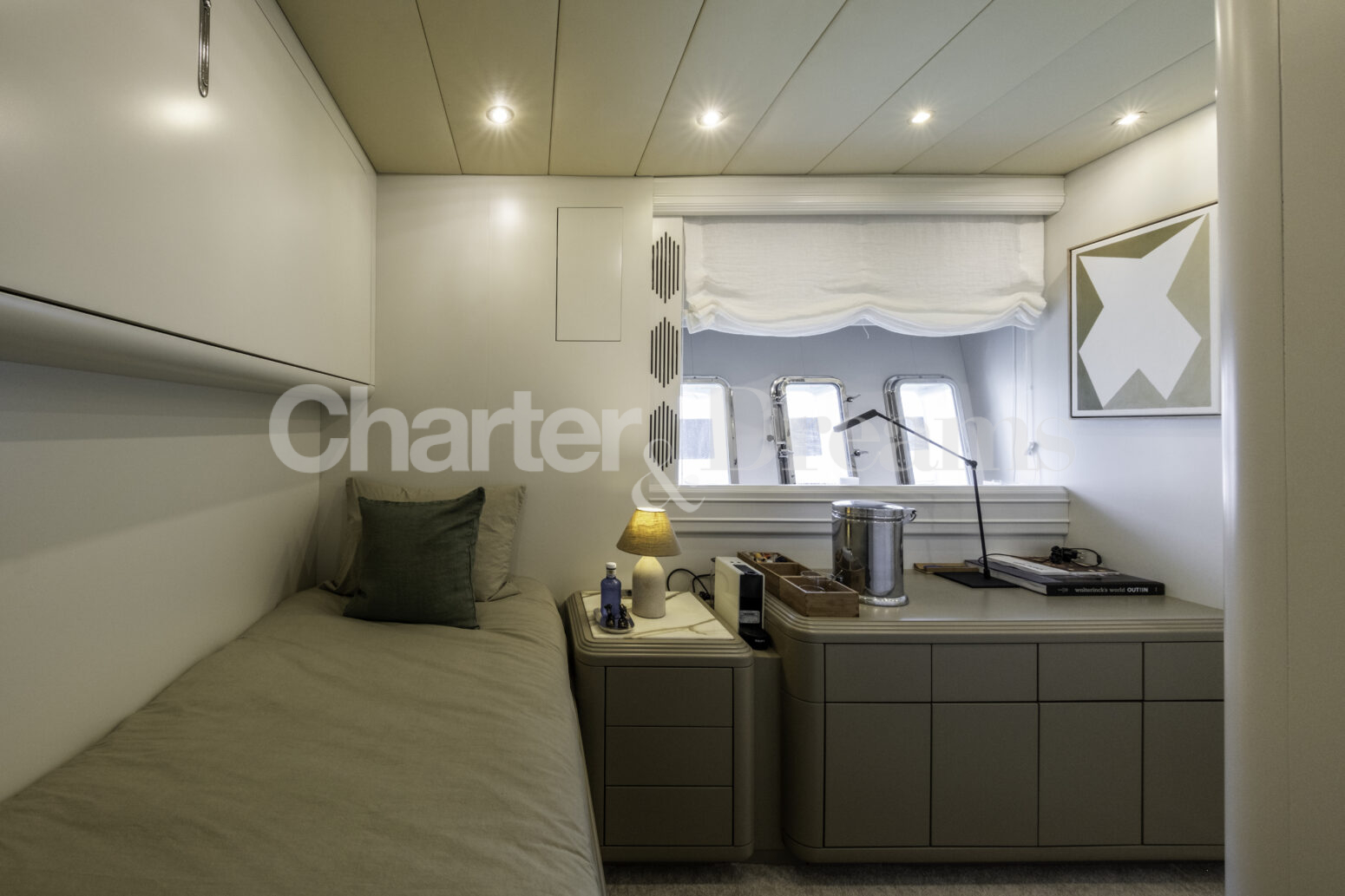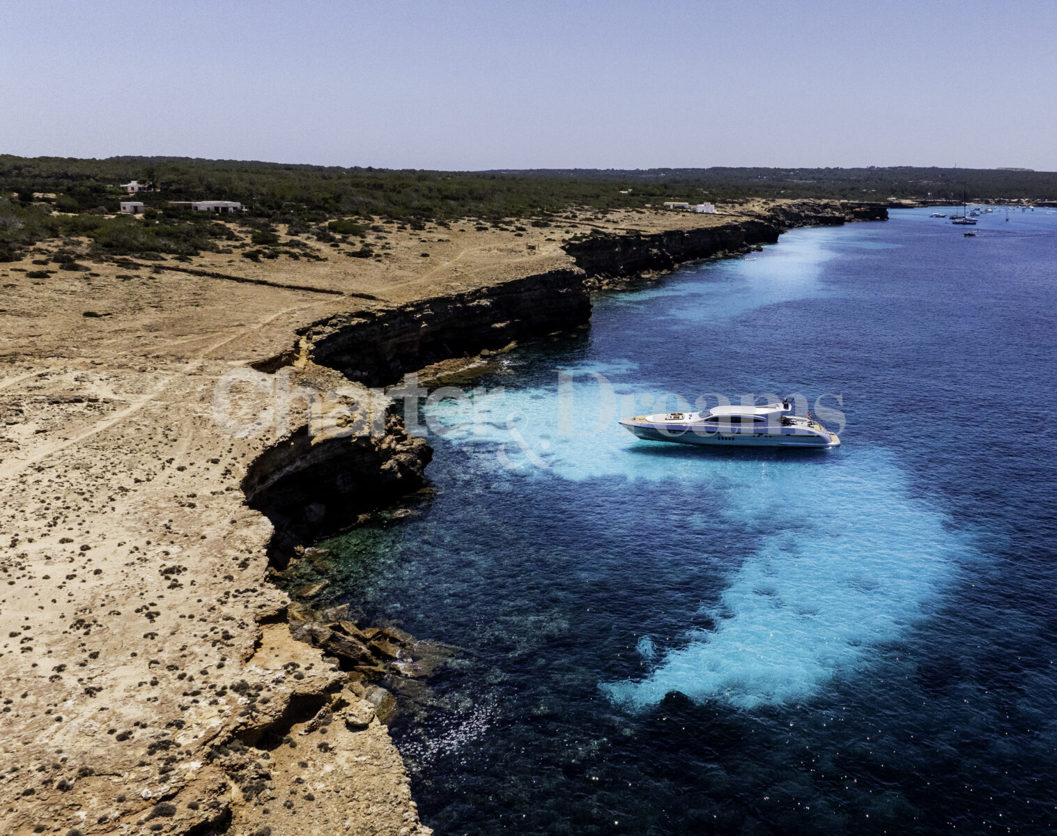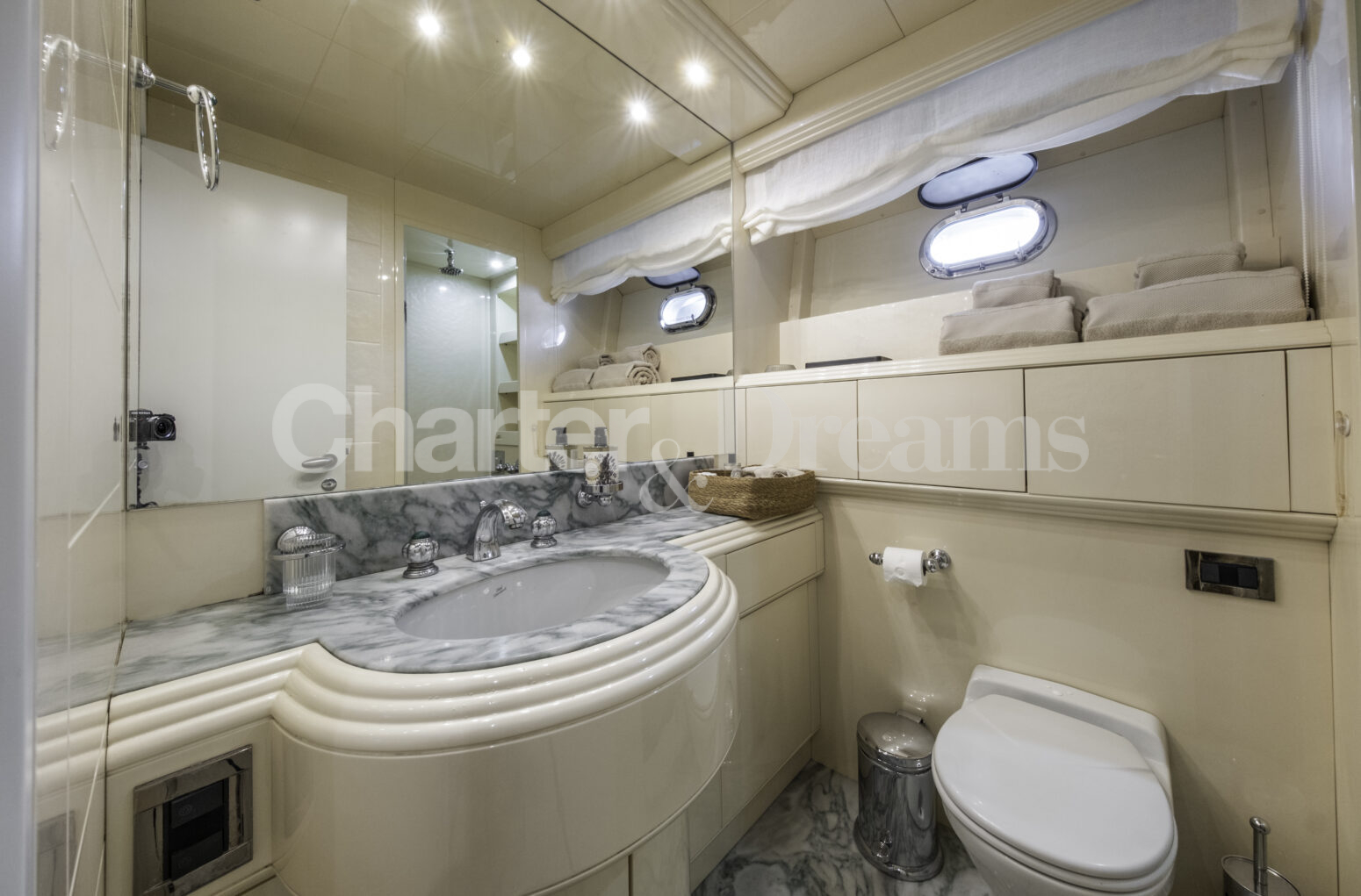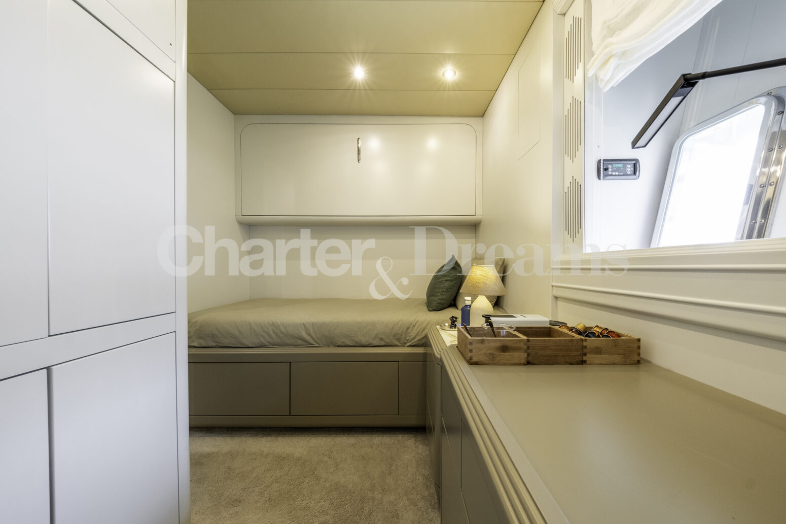 Im Hauptdeck-Salon liegt der Esstisch vorn und die Lounge achtern; zusätzlich steht auf dem Unterdeck ein zweiter, gemütlicher Loungebereich bereit. Draußen bietet das Vorschiff eine große Sonnenliege mit Sitzgruppe und Tisch, achtern wartet ein breites Sunpad für entspannte Stunden. Zur Ausstattung zählen Starlink-Internet, zonenweises Audiosystem, komplette Klimatisierung sowie einziehbare Sonnensegel vorn und hinten. Kapitän, Koch und zwei Crew sorgen ab Marina Ibiza für einen reibungslosen Ablauf.