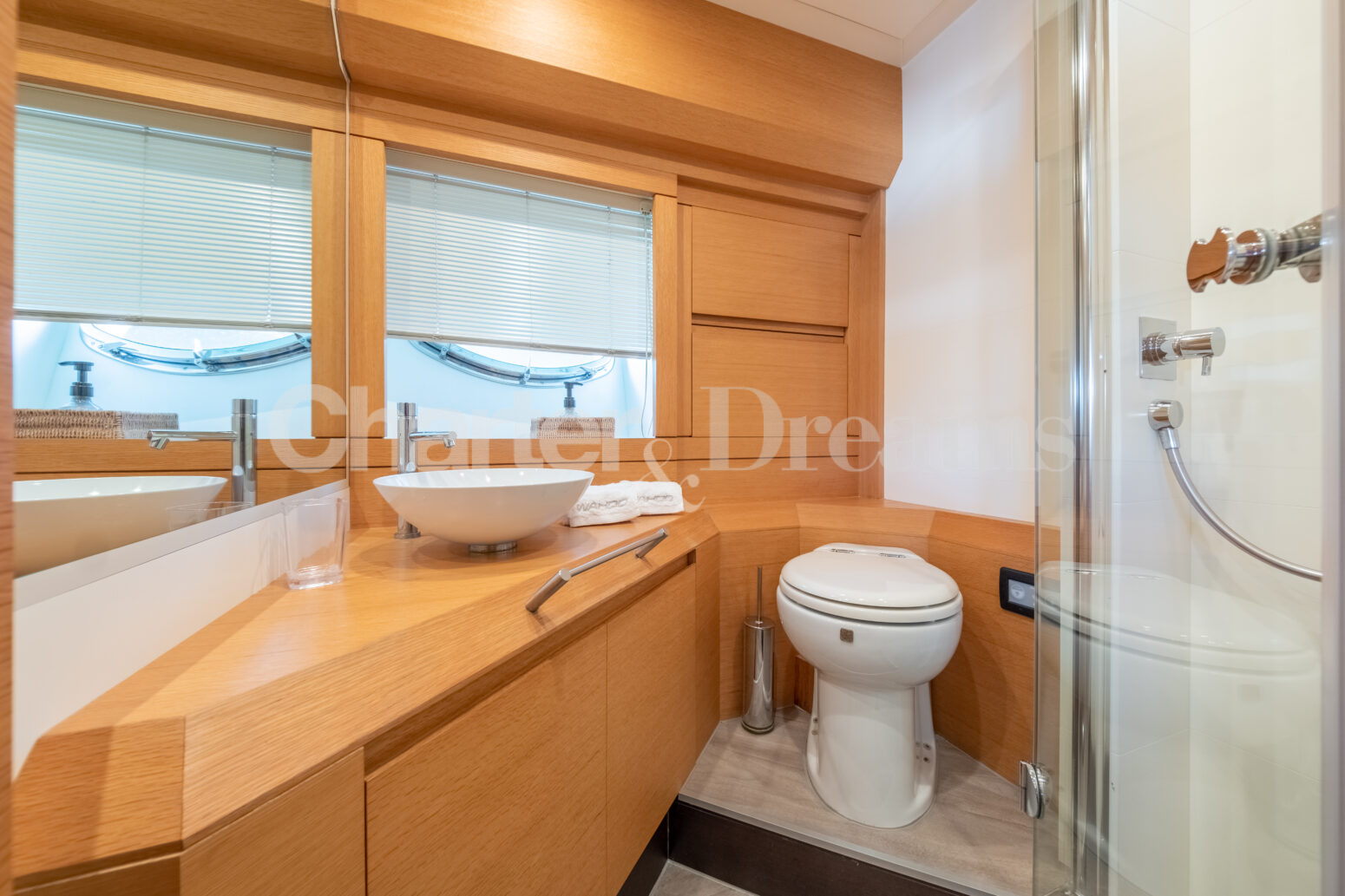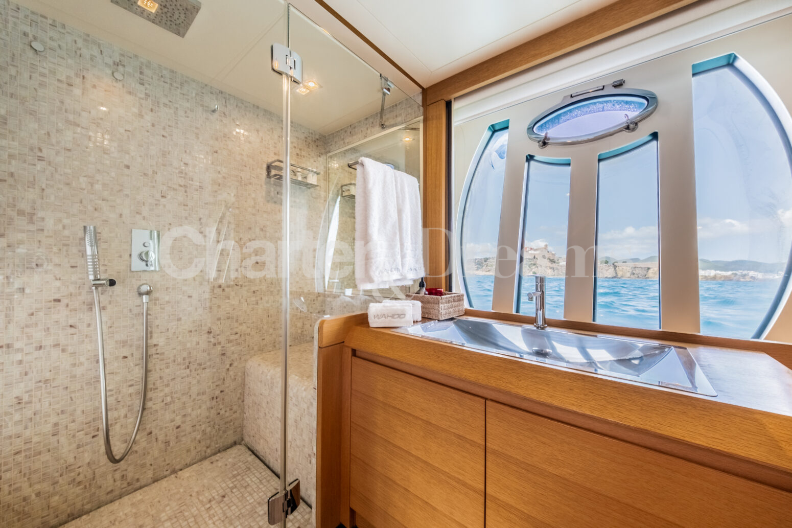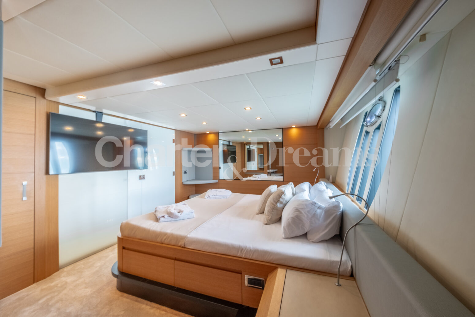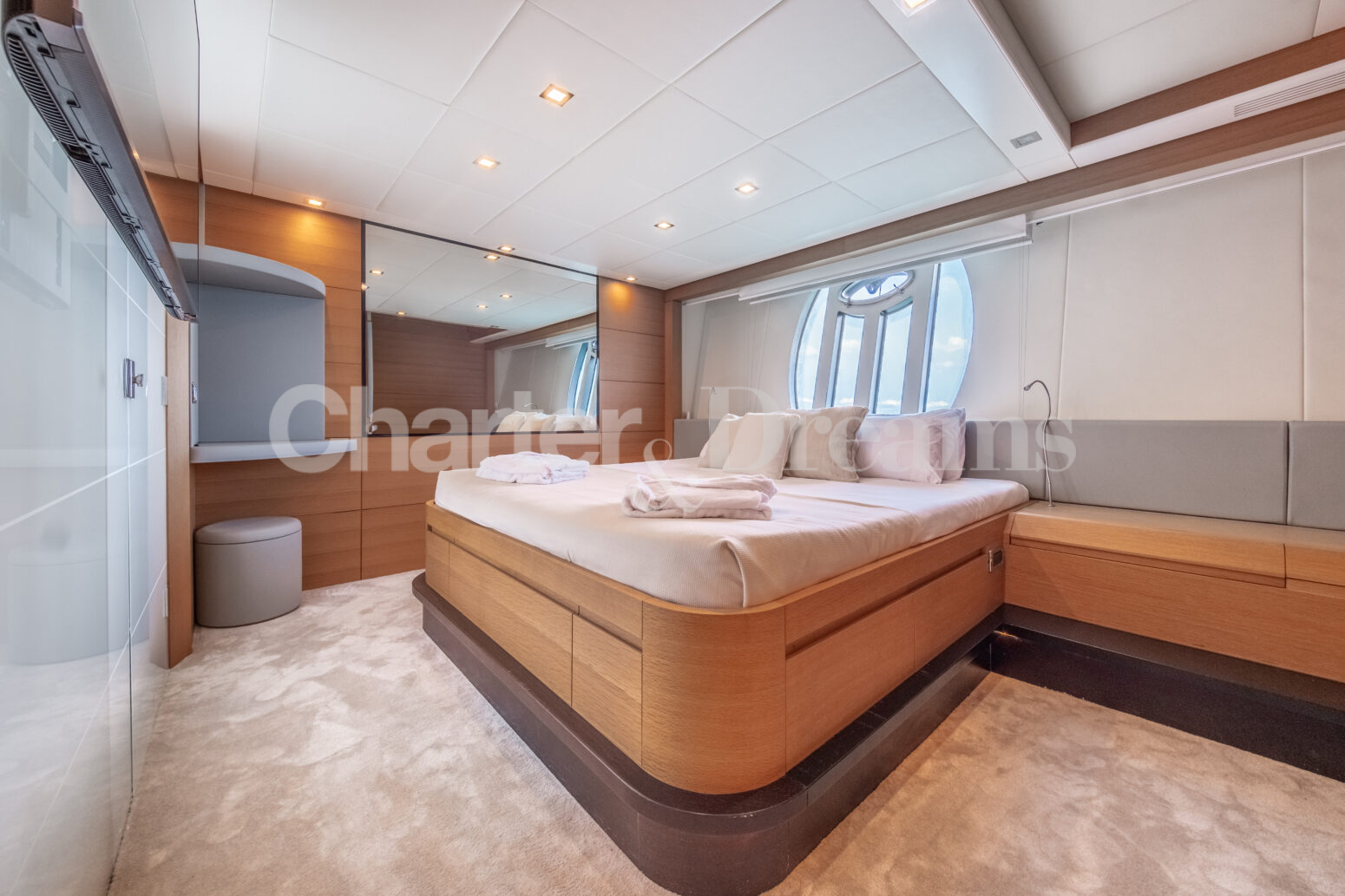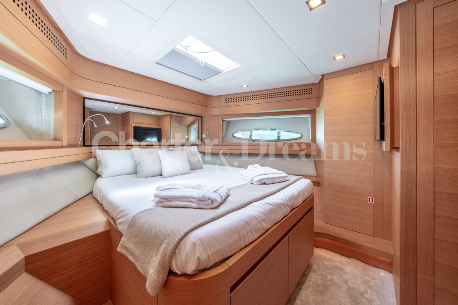 A bordo pernoctan hasta 9 en 4 cabinas: master amplia (cama king, en suite), VIP a proa (king, en suite) y dos twins, una con litera Pullman adicional. En total, 3 baños con acabado contemporáneo.