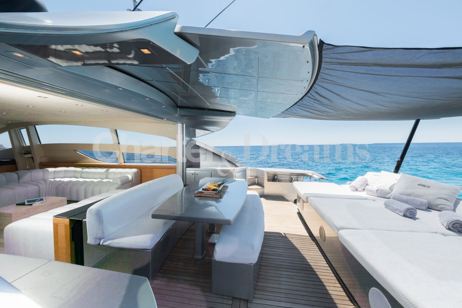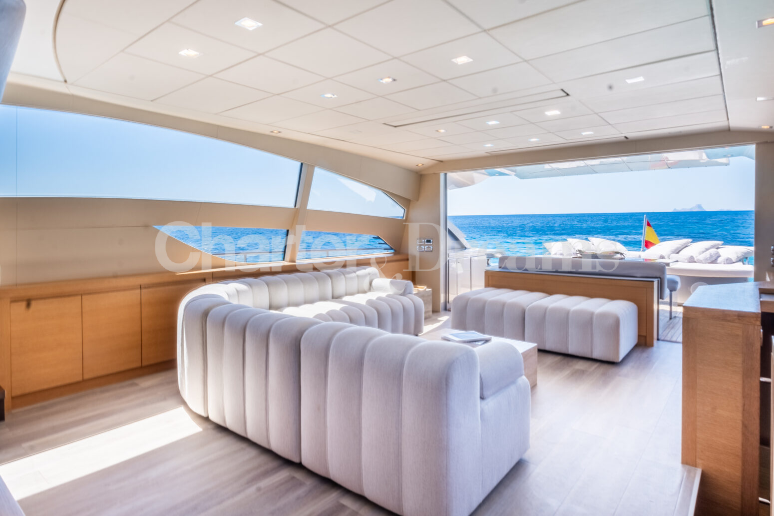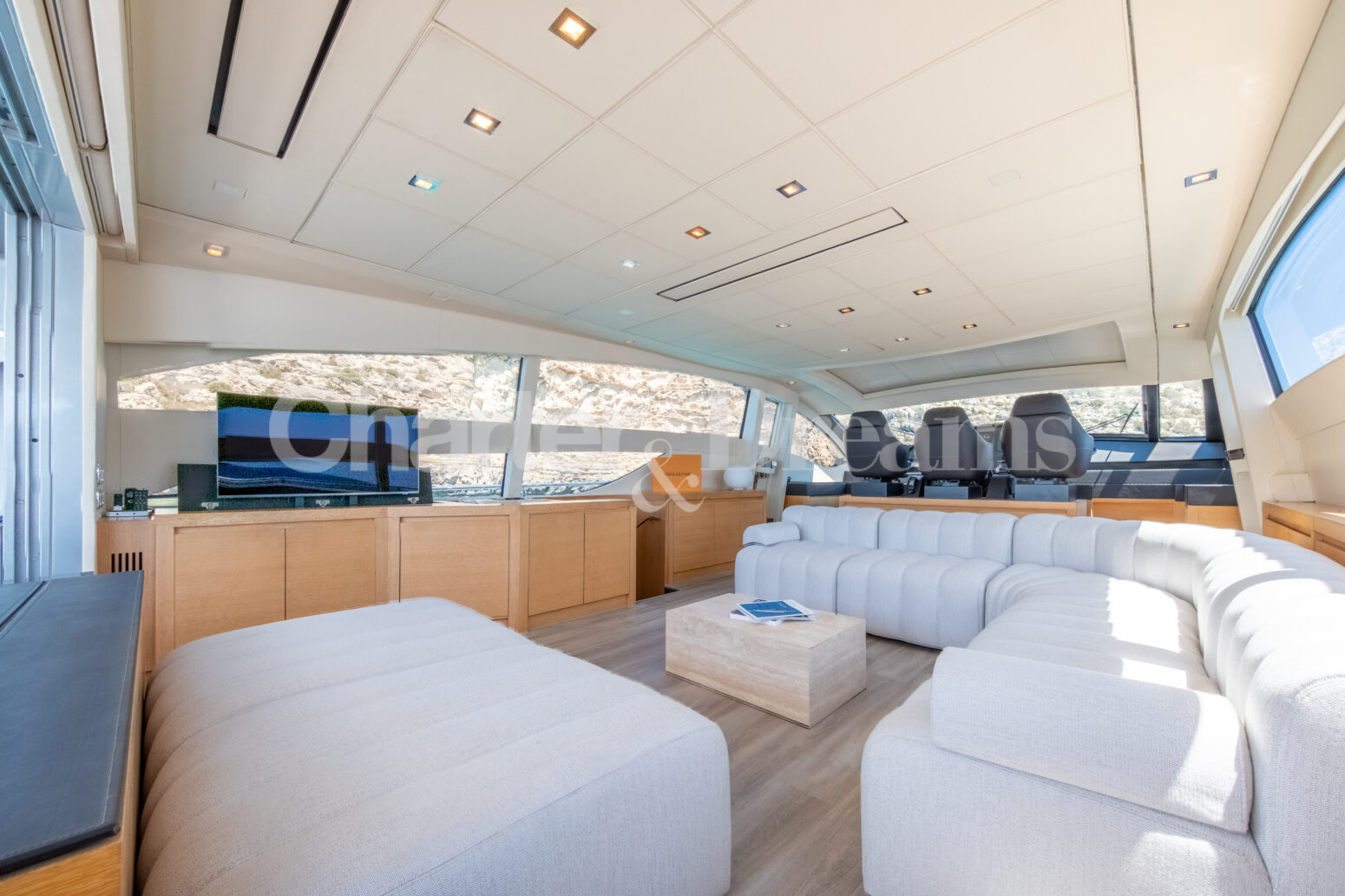 El salón principal se une al cockpit mediante una puerta trasera de vidrio que desaparece para crear un único espacio social. En cubierta: solárium de proa con sofá en U y mesa (bimini para sombra) y, a popa, otro comedor junto a un gran sunpad. El confort lo completan toldos retráctiles a proa y popa, aire acondicionado, sonido por zonas, Smart TV y Wi-Fi 4G.